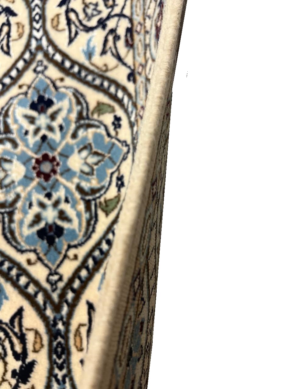 6 l Fine Persian Nain rugs are renowned for their detail and fine use of outlining along the central motifs. Breaking from the classical style of many vintage rugs produced around central Iran, Persian Nain rugs became renowned for their modern appeal and personal style, establishing the classical motifs of many other regional rugs, only through a more precise lens. In this striking piece, the precision is particularly visible along the heart of the vintage Persian rug, where the attention to detail allows each individual color to stand out as a unique part of the whole. The surrounding borders help ground the masterpiece and add horizontal intrigue to the natural elements within, which are arranged vertically to establish a cascading effect.