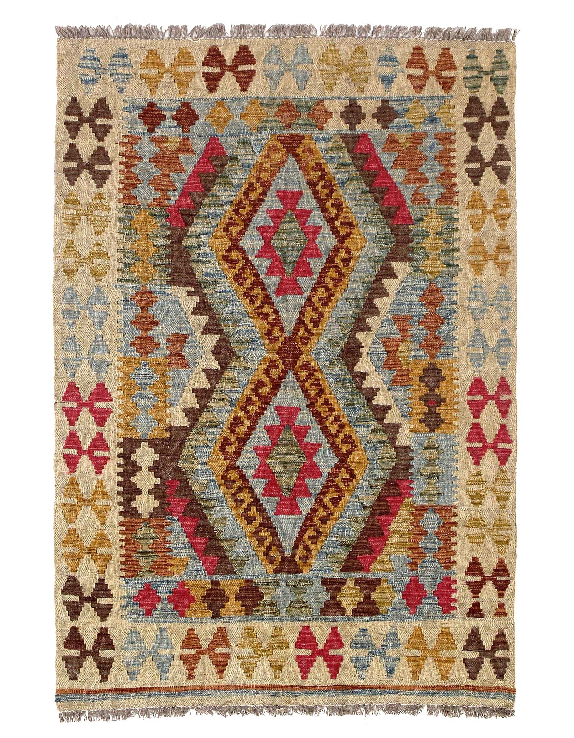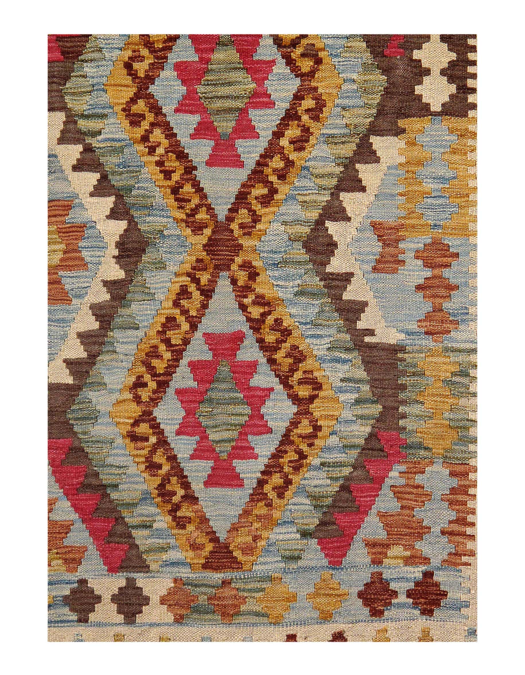 Add a touch of elegance to your home with this casual chic hand woven Kilim wool rug. Constructed on a loom by Nomad turkman people with hand spun wool and 100% natural Vegetable dyes this beautiful rug is known for its beautiful repetitive geometric pattern with naturalistic floral and traditional patterns. The contemporary fashion palette produces bold, sharp patterns that are ingeniously versatile as the pattern is same on the front and back. This double-sided rug is designed to be used both ways being one side has a light shade of color, rather the other side has brighter colors and can be used to preference. This beautiful rug is made by individual short strands of different color being knotted onto the warps and held together by pressing the wefts tightly. The design is made by interweaving the variously colored wefts and warps. Kilims are known to be one of a kind rug due to its durability and versatility.