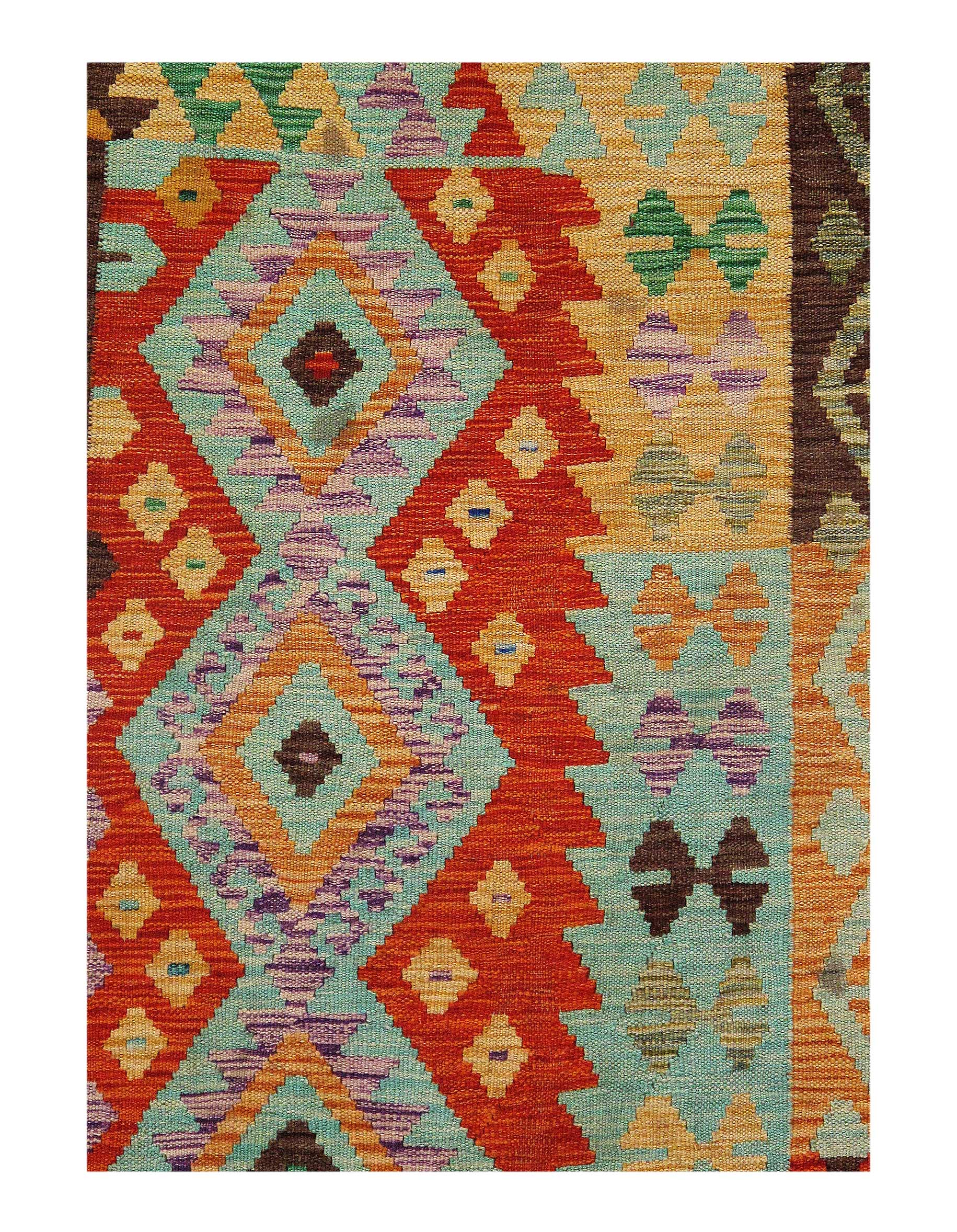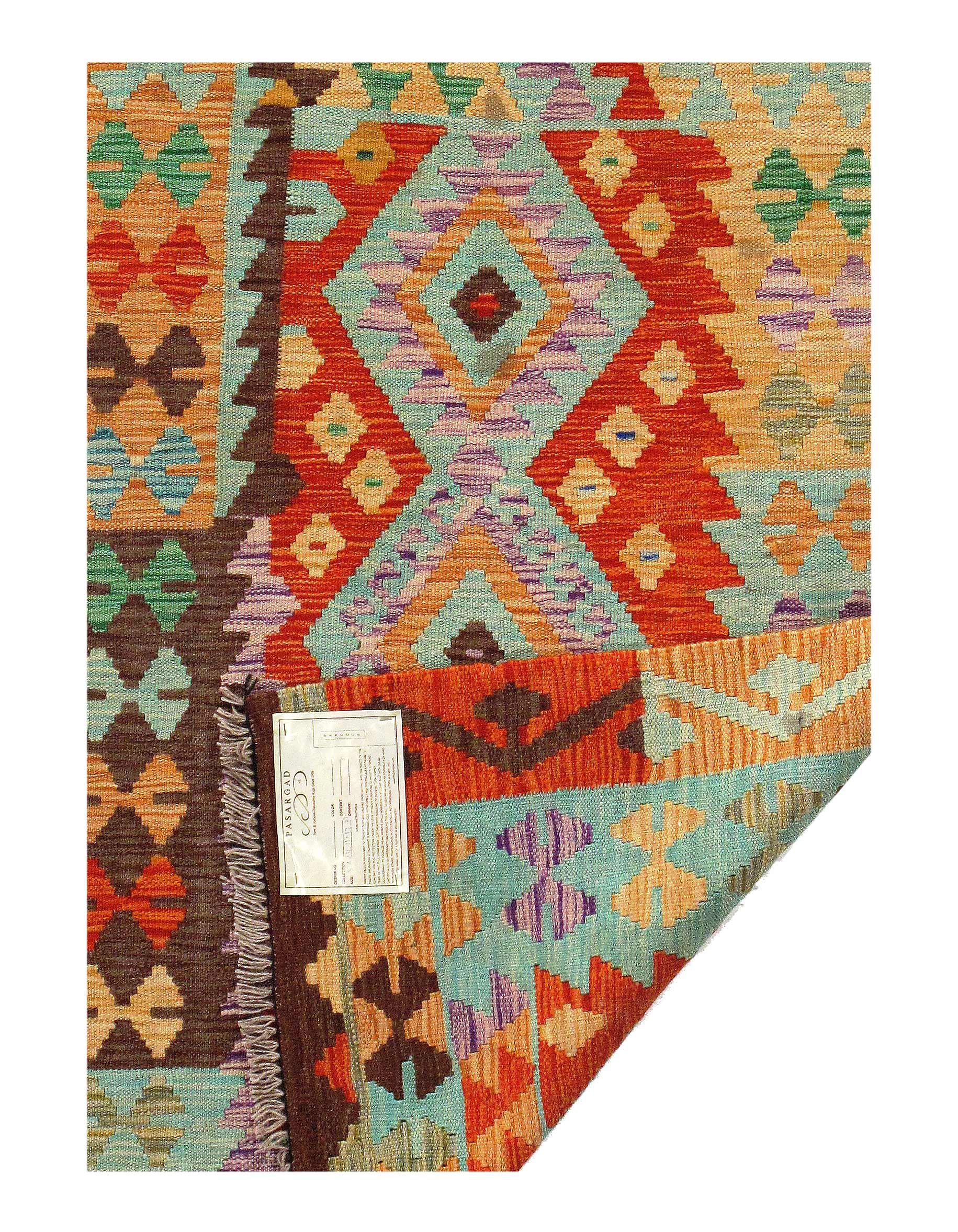 Add a touch of elegance to your home with this casual chic hand woven Kilim wool rug. Constructed on a loom by Nomad turkman people with hand spun wool and 100% natural Vegetable dyes this beautiful rug is known for its beautiful repetitive geometric pattern with naturalistic floral and traditional patterns. The contemporary fashion palette produces bold, sharp patterns that are ingeniously versatile as the pattern is same on the front and back. This double-sided rug is designed to be used both ways being one side has a light shade of color, rather the other side has brighter colors and can be used to preference. This beautiful rug is made by individual short strands of different color being knotted onto the warps and held together by pressing the wefts tightly. The design is made by interweaving the variously colored wefts and warps. Kilims are known to be one of a kind rug due to its durability and versatility.
