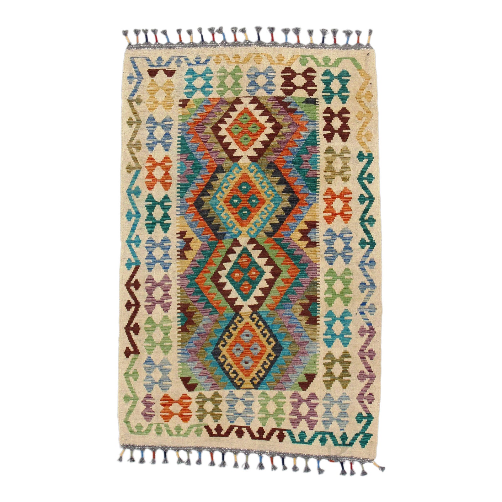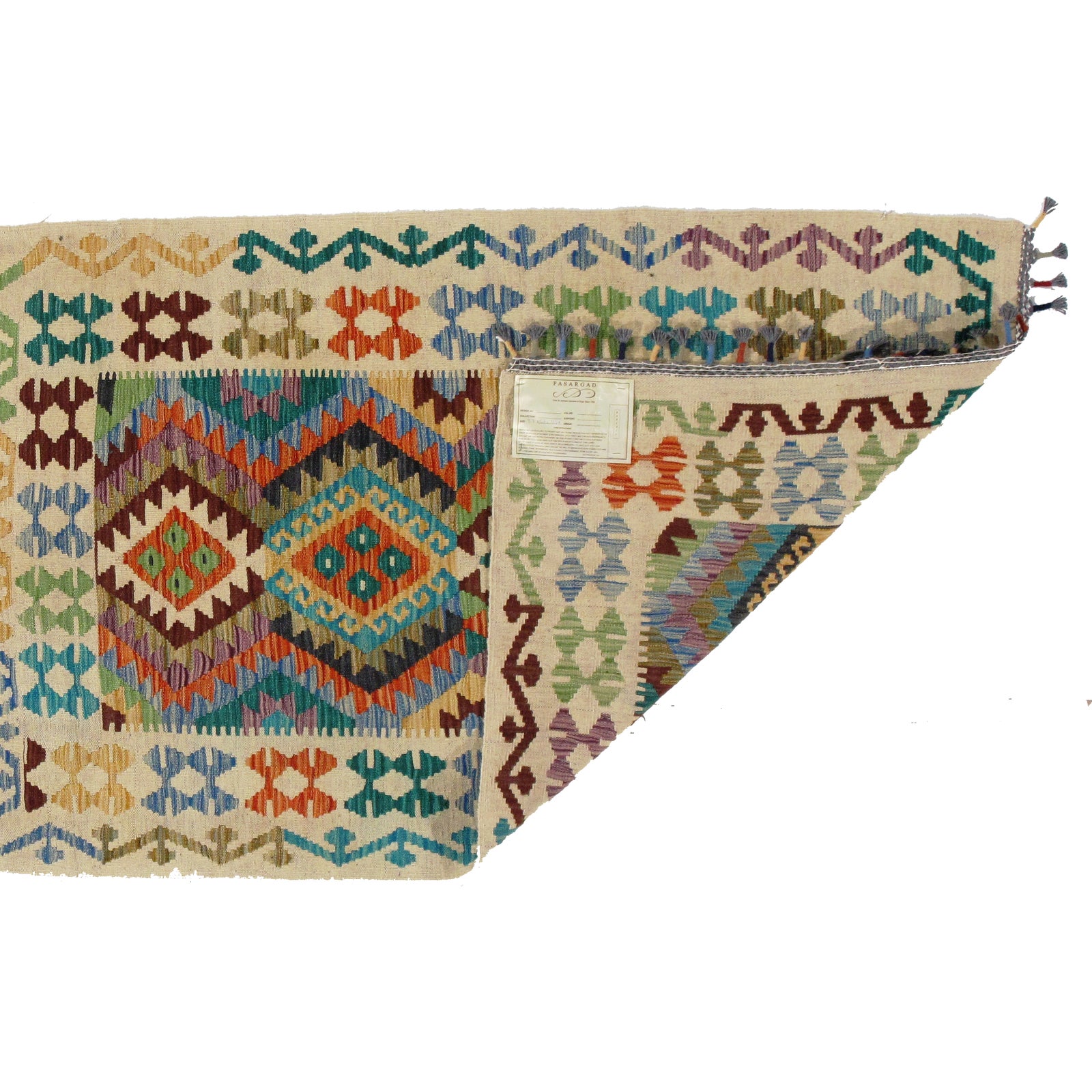 Add a touch of elegance to your home with this casual chic hand woven Kilim wool rug. Constructed on a loom by Nomad turkman people with hand spun wool and 100% natural Vegetable dyes this beautiful rug is known for its beautiful repetitive geometric pattern with naturalistic floral and traditional patterns. The contemporary fashion palette produces bold, sharp patterns that are ingeniously versatile as the pattern is same on the front and back. This double-sided rug is designed to be used both ways being one side has a light shade of color, rather the other side has brighter colors and can be used to preference. This beautiful rug is made by individual short strands of different color being knotted onto the warps and held together by pressing the wefts tightly. The design is made by interweaving the variously colored wefts and warps. Kilims are known to be one of a kind rug due to its durability and versatility.