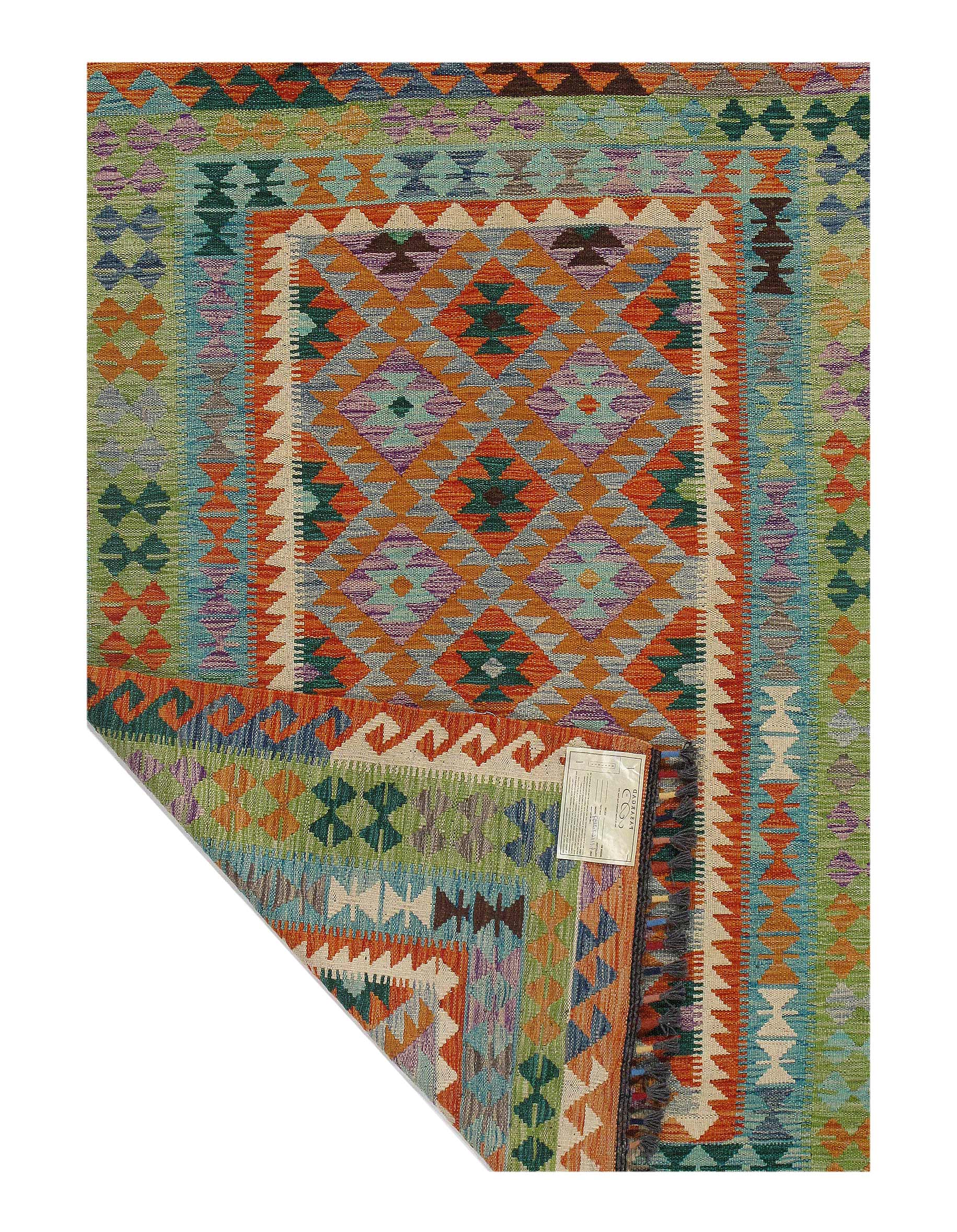 Add a touch of elegance to your home with this casual chic hand woven Kilim wool rug. Constructed on a loom by Nomad turkman people with hand spun wool and 100% natural Vegetable dyes this beautiful rug is known for its beautiful repetitive geometric pattern with naturalistic floral and traditional patterns. The contemporary fashion palette produces bold, sharp patterns that are ingeniously versatile as the pattern is same on the front and back. This double-sided rug is designed to be used both ways being one side has a light shade of color, rather the other side has brighter colors and can be used to preference. This beautiful rug is made by individual short strands of different color being knotted onto the warps and held together by pressing the wefts tightly. The design is made by interweaving the variously colored wefts and warps. Kilims are known to be one of a kind rug due to its durability and versatility.
