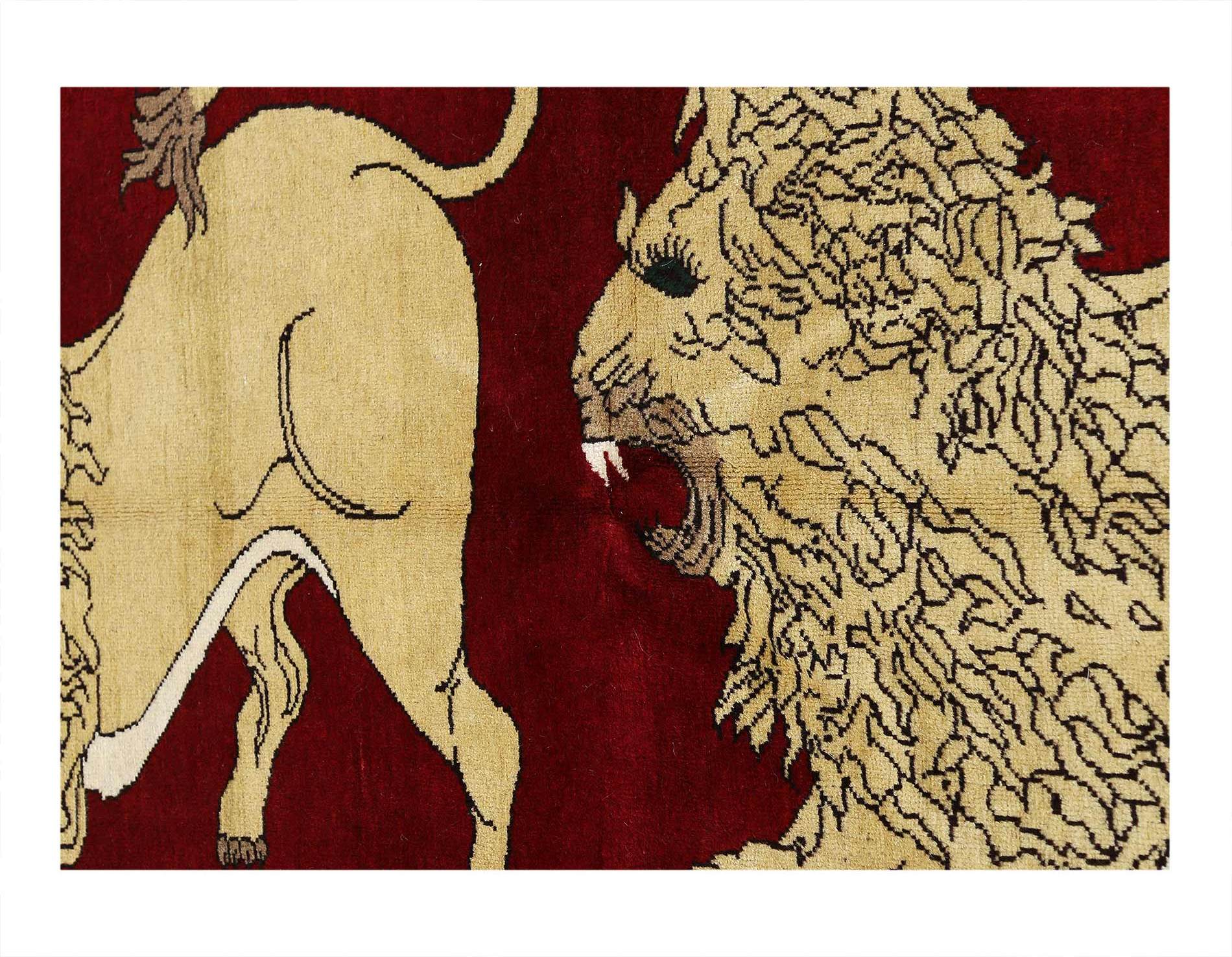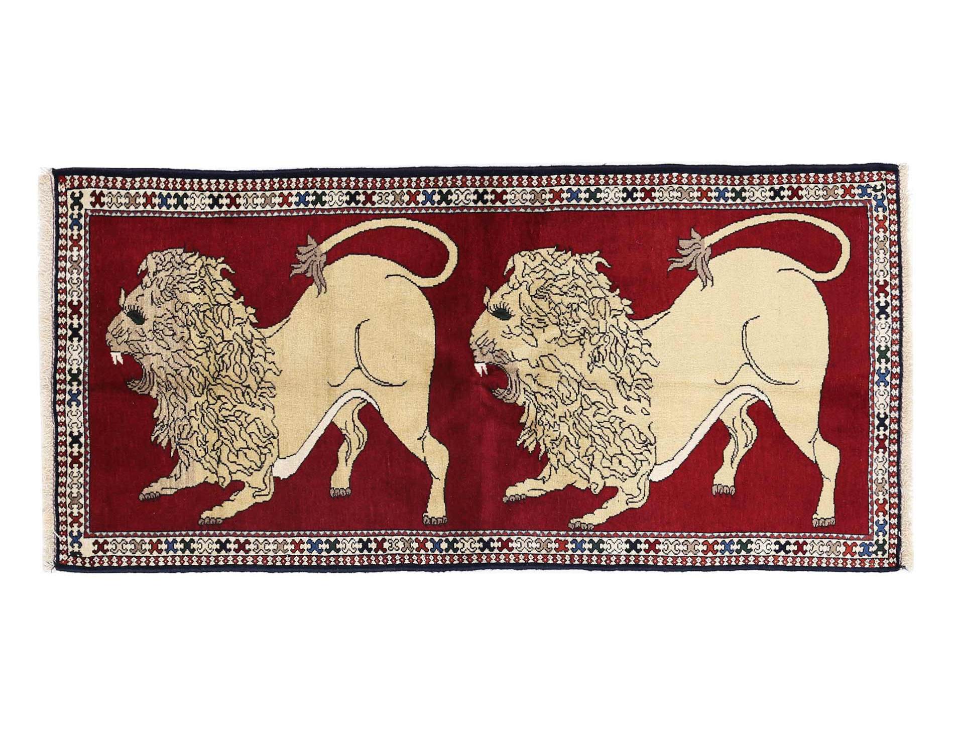 A modern Persian Shiraz small throw rug handmade during the 21st century with a pictorial design of a male lion in redover background.