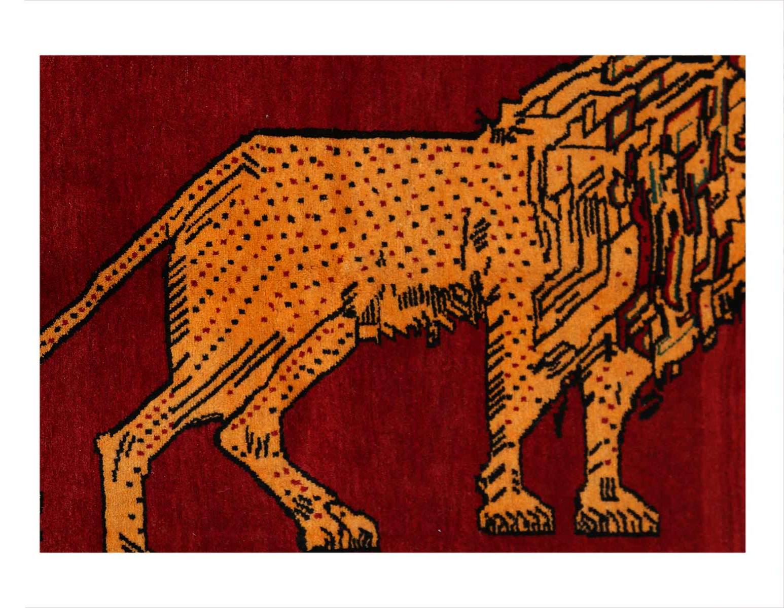 A modern Persian Shiraz small throw rug handmade during the 21st century with a pictorial design of a male lion in redover a blue background.