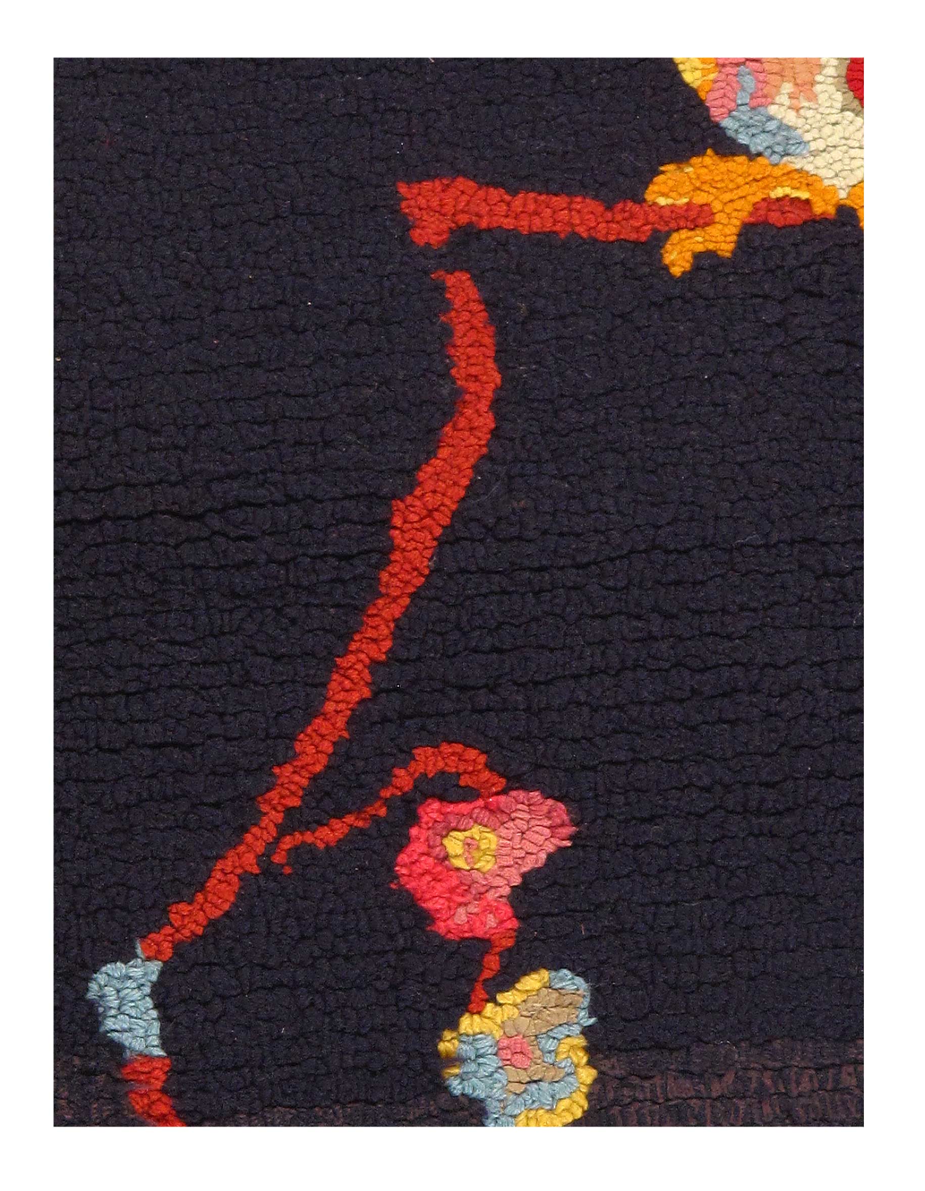 Antique Hooked Rug, United States, 1940 — Every element in this hooked rug border is sewn in a deep, rich Navy Blue with smaller, lighter lines throughout that create the illusion of a wooden surface. Winding buttermilk yellow and ruby red lines flow within and around each other, framing a sandy background that itself gives way to a diamond-shaped flow of fiery red flowers, with the base of their flow originating at every cardinal direction. At the center of these flowers rests a simple four-pointed star, that creates contrast in this antique rug.