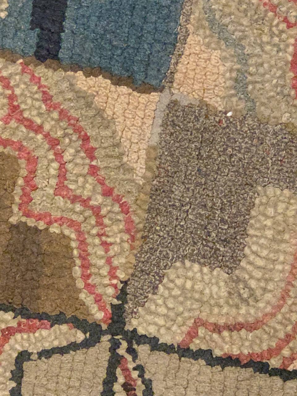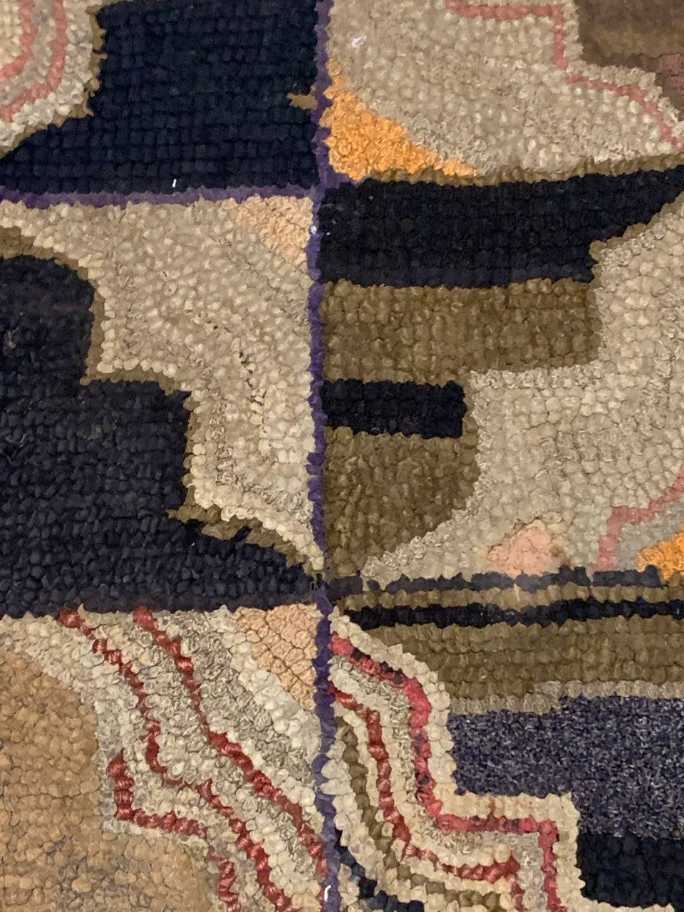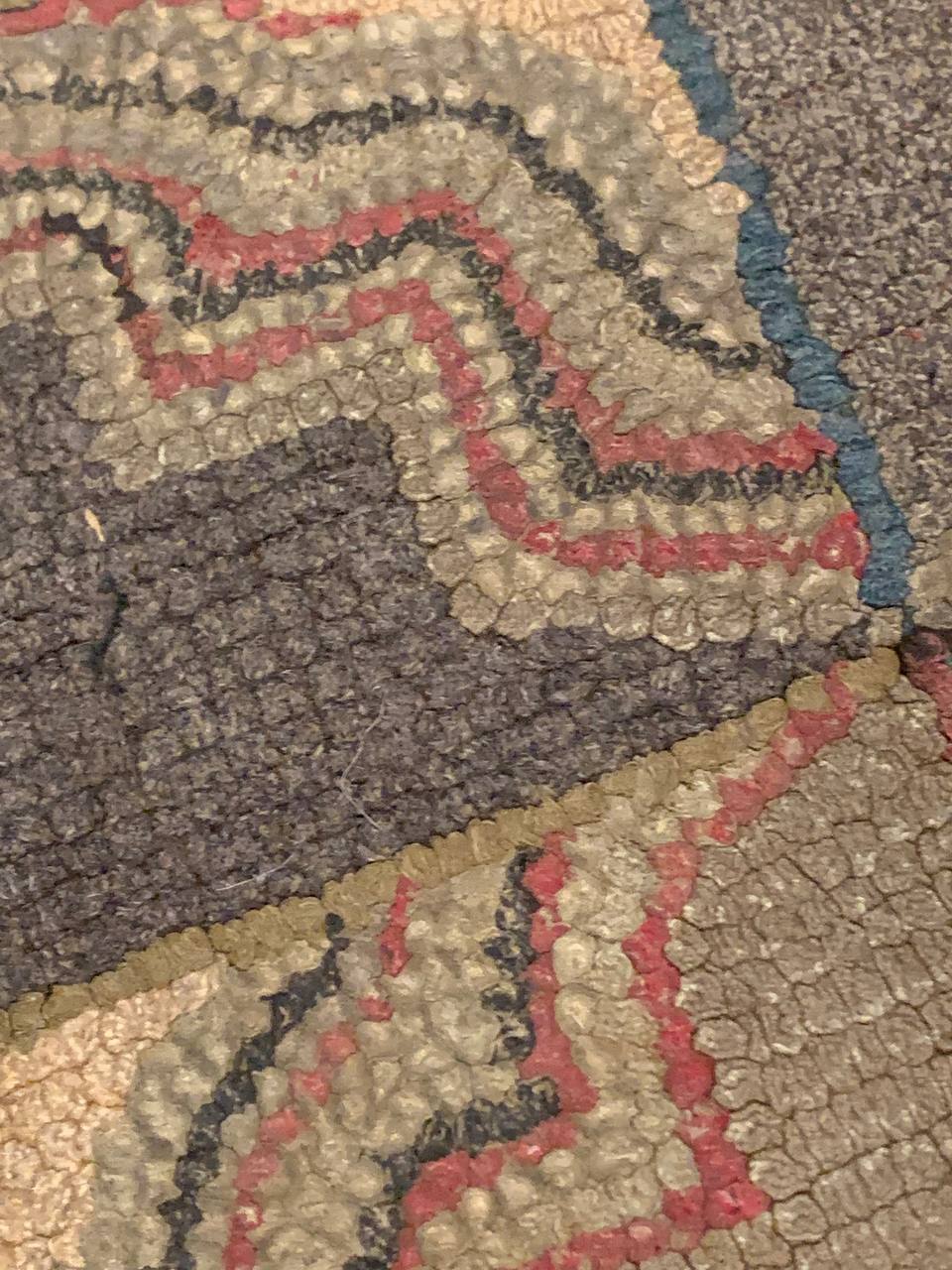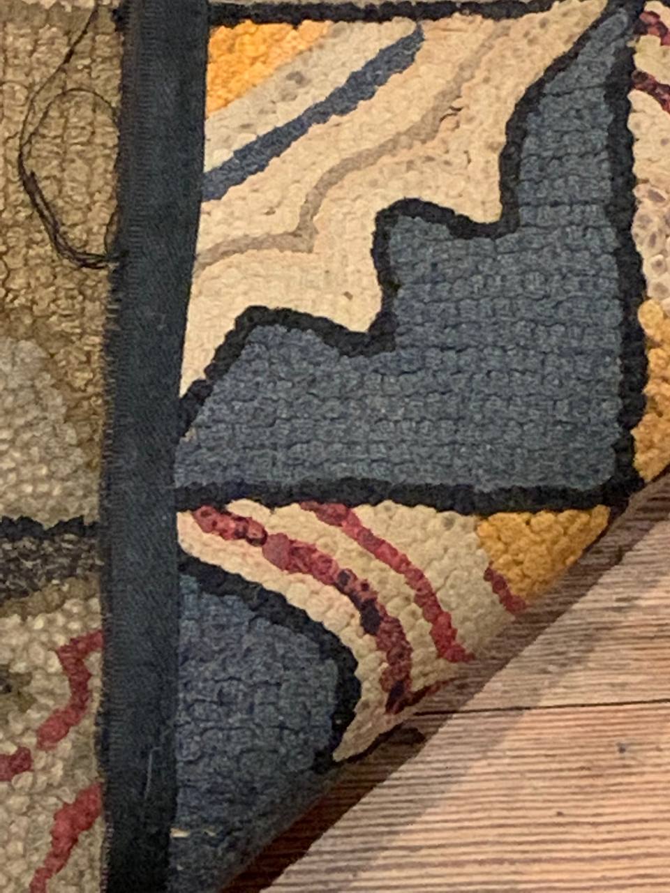 Hooked Rug, Country of Origin: United States Of America, Circa Date: Turn of the 20th Century (around – 1900) – This antique American rug features an ovular, bark-like frame defined by subtle foliage and floral sprays. This uniquely American rug features a delicate botanical theme with Brown details and a marbled oatmeal field. Detailed petals with contrasting outlines and variegated shading add definition to the floral border and central bouquet. Colorful flowers woven in a combination of lavender, light brown/ Beige counterbalance the neutral background.