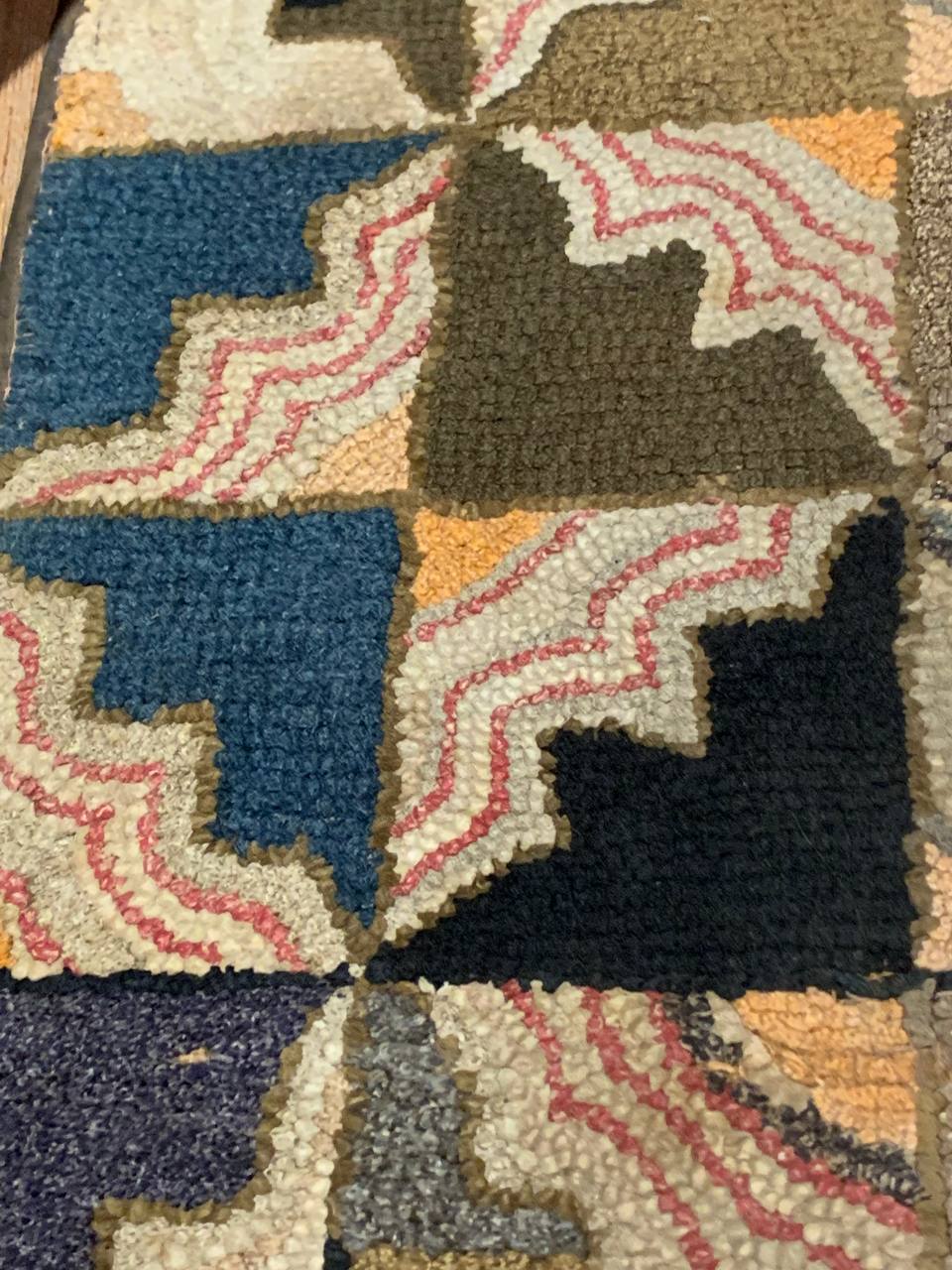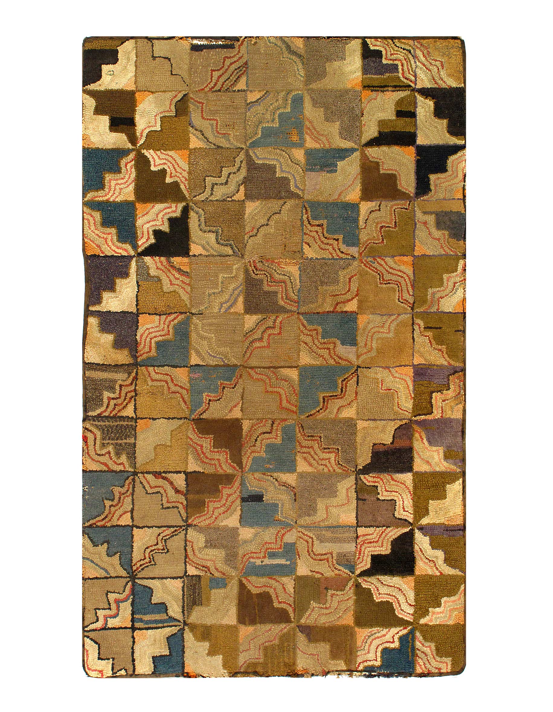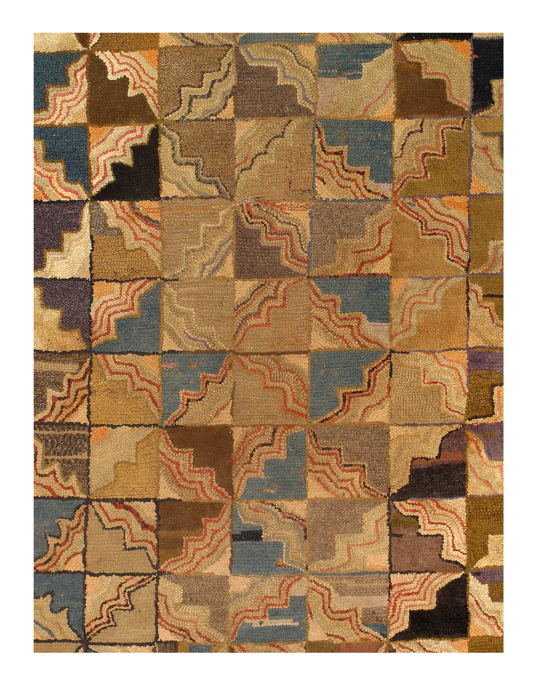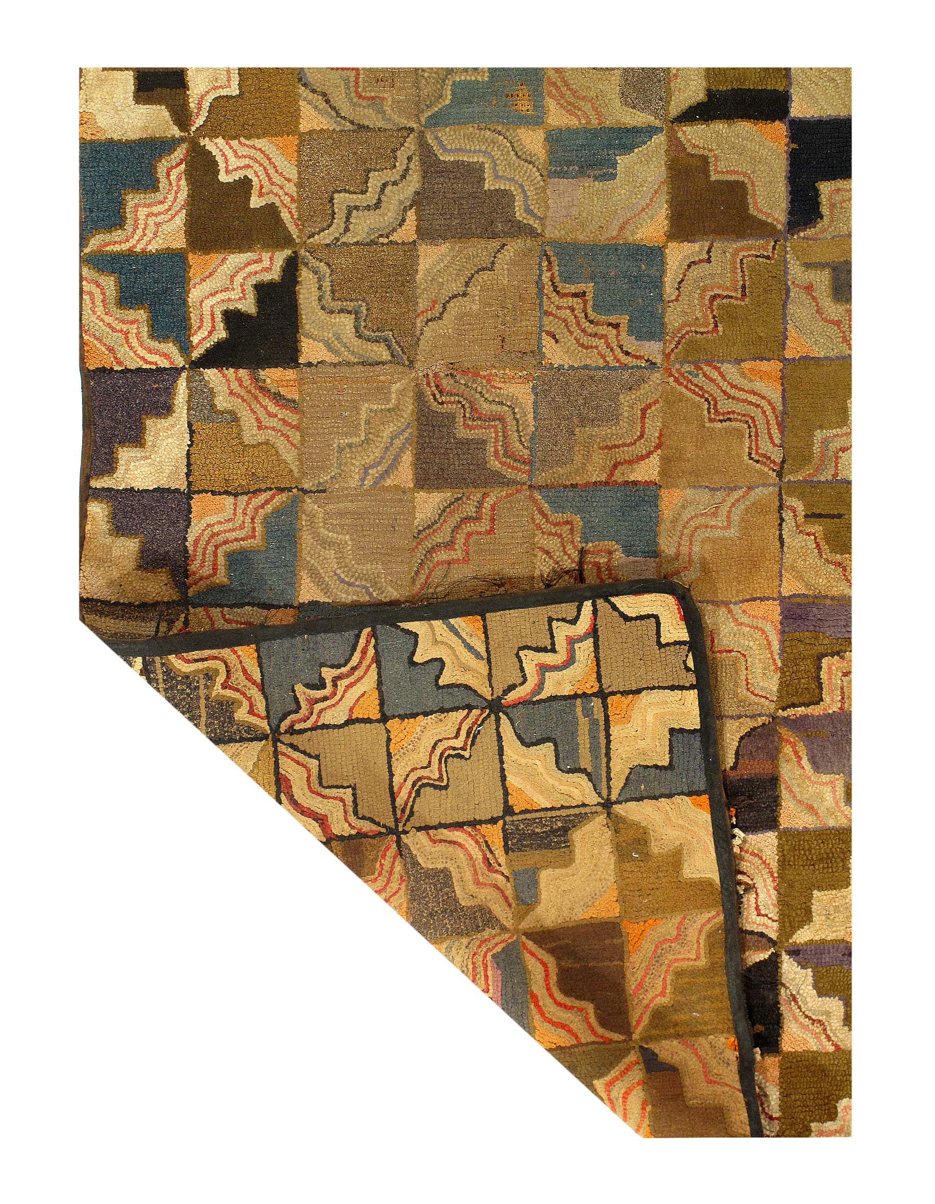 Hooked Rug, Country of Origin: United States Of America, Circa Date: Turn of the 20th Century (around – 1900) – This antique American rug features an ovular, bark-like frame defined by subtle foliage and floral sprays. This uniquely American rug features a delicate botanical theme with Brown details and a marbled oatmeal field. Detailed petals with contrasting outlines and variegated shading add definition to the floral border and central bouquet. Colorful flowers woven in a combination of lavender, light brown/ Beige counterbalance the neutral background.