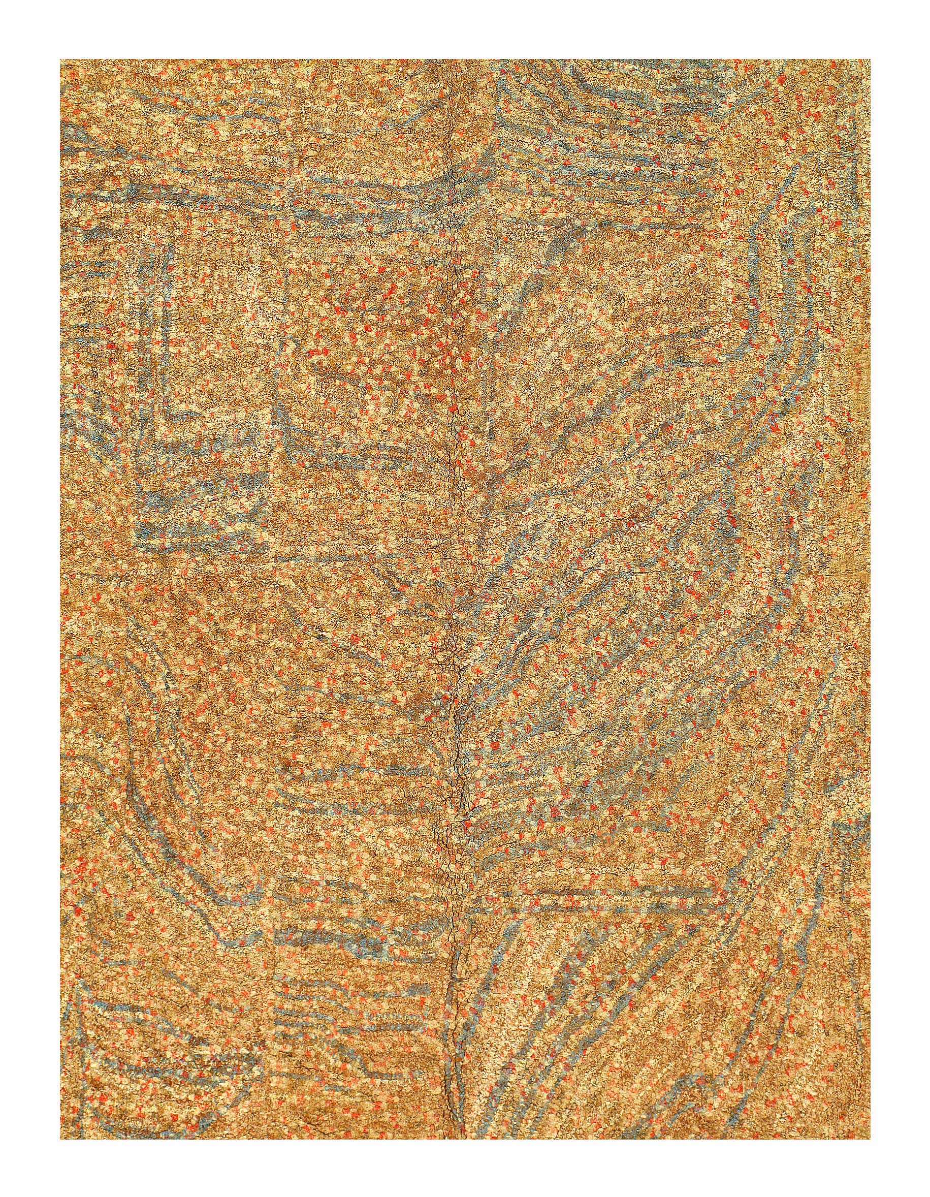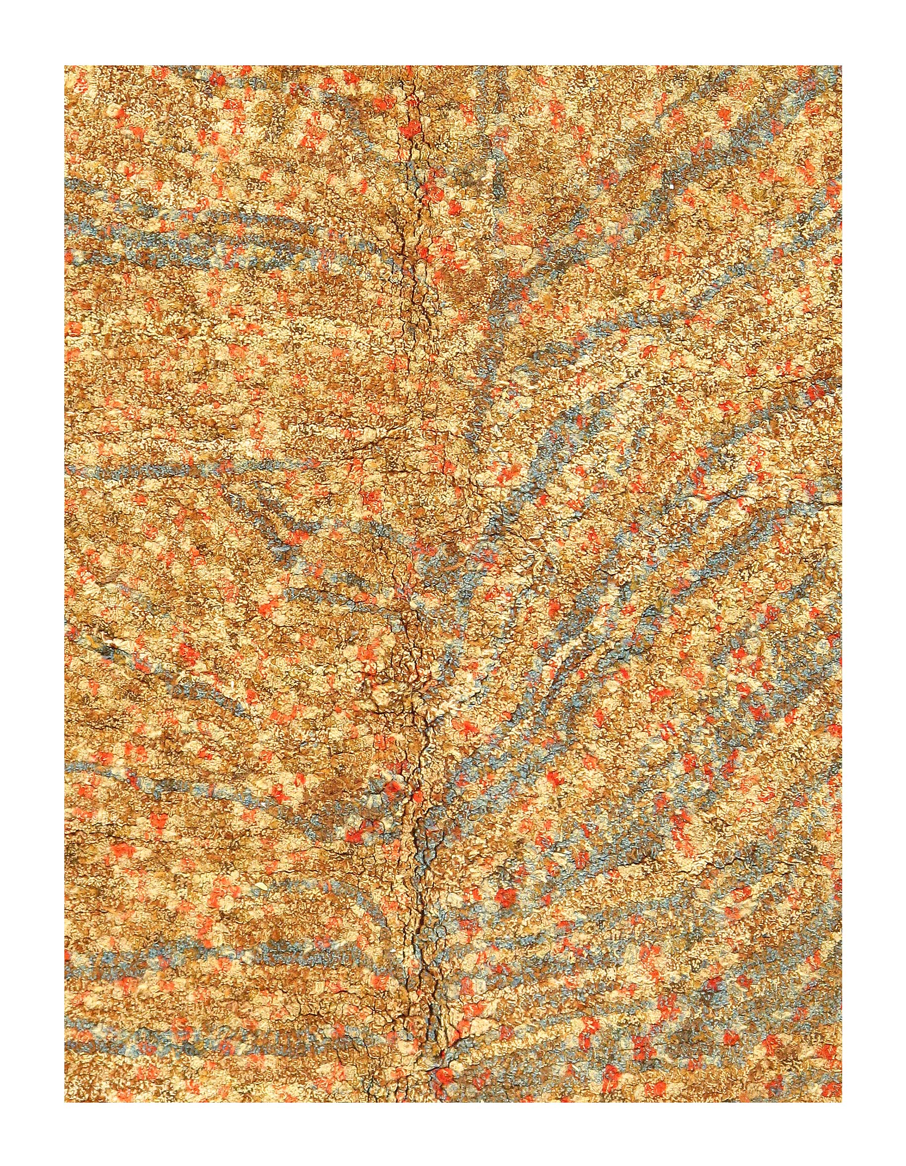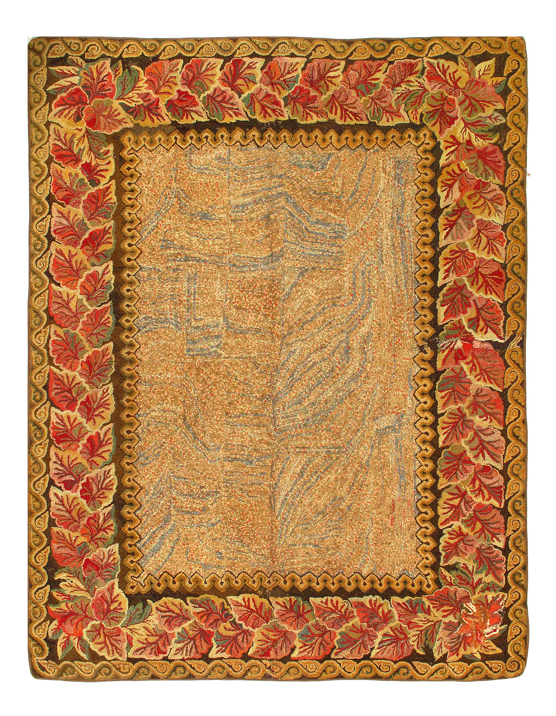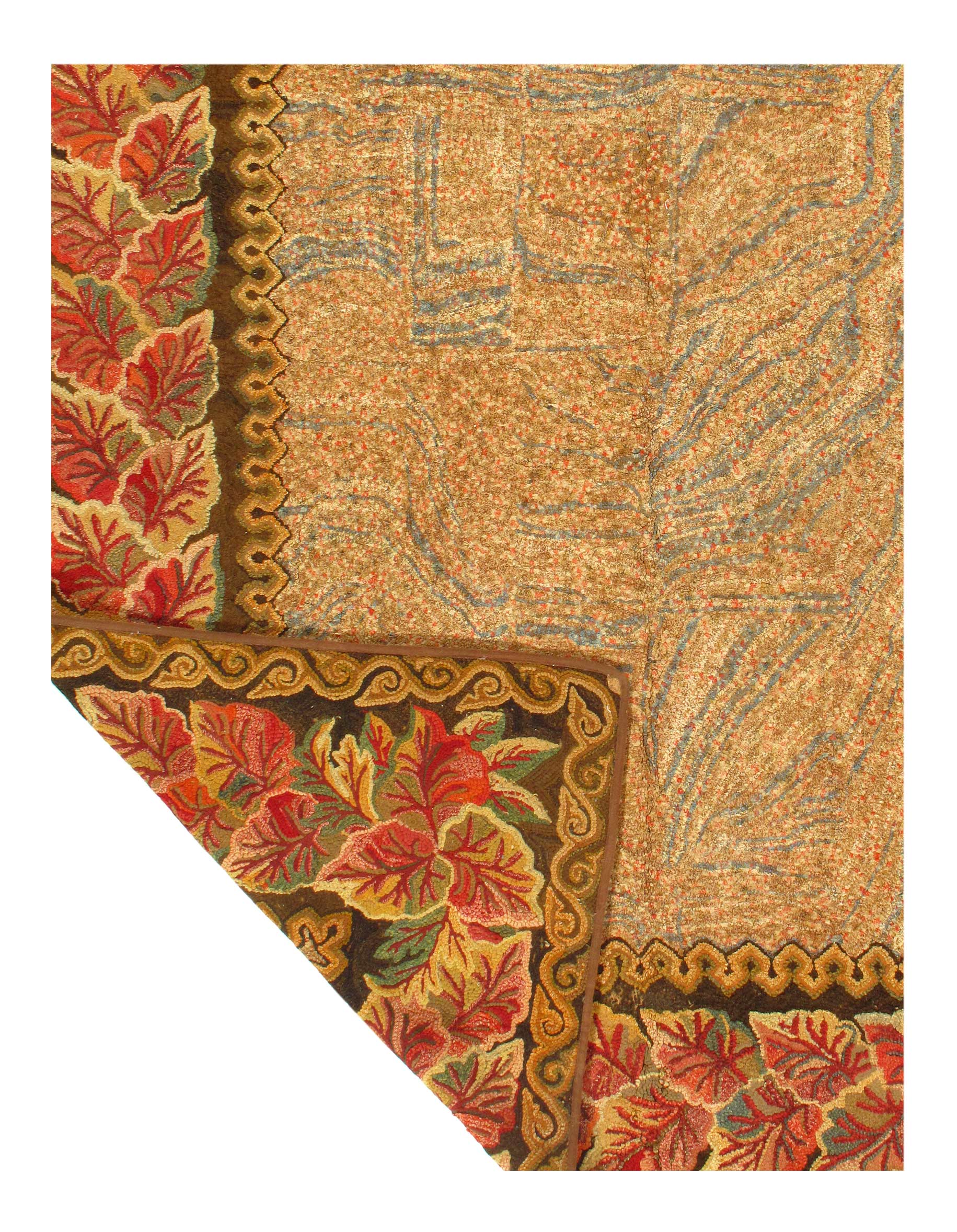 Hooked Rug, Country of Origin: United States Of America, Circa Date: Turn of the 20th Century (around – 1900) – This antique American rug features an ovular, bark-like frame defined by subtle foliage and floral sprays. This uniquely American rug features a delicate botanical theme with Brown details and a marbled oatmeal field. Detailed petals with contrasting outlines and variegated shading add definition to the floral border and central bouquet. Colorful flowers woven in a combination of lavender, light brown/ Beige counterbalance the neutral background.