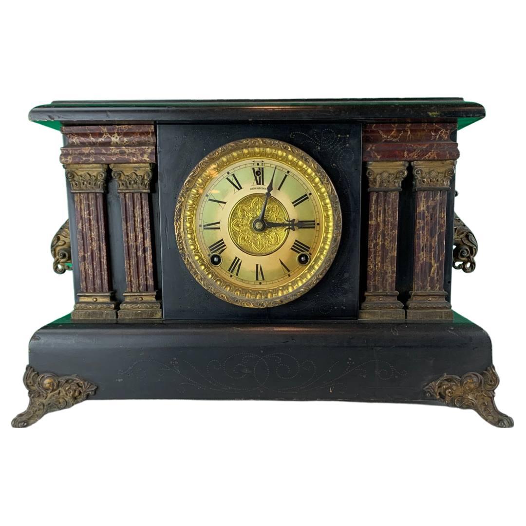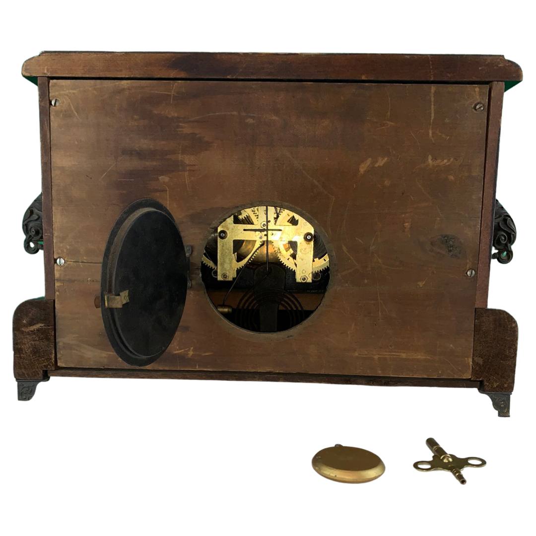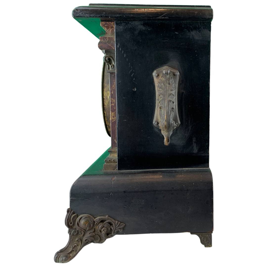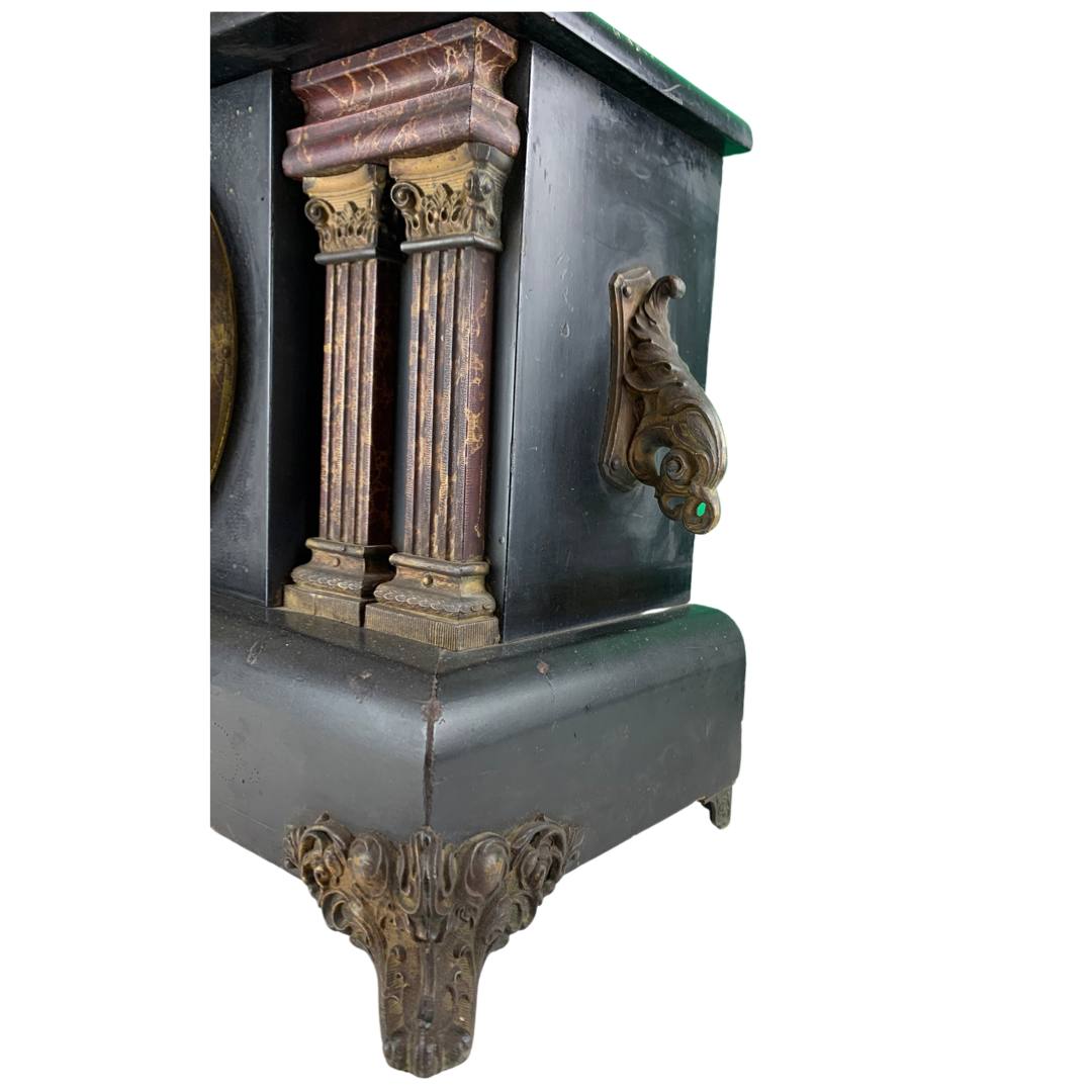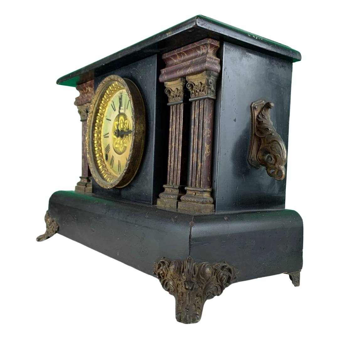 The Ingram mantle clock has a black stained wood casing, a gilt metal face with two sockets for winding by key (missing), faux marble columns, metal feet and a circular brass cover for opening in the back. Inside are the spiral movements and a hammer for ringing the time. There are two engravings on the back