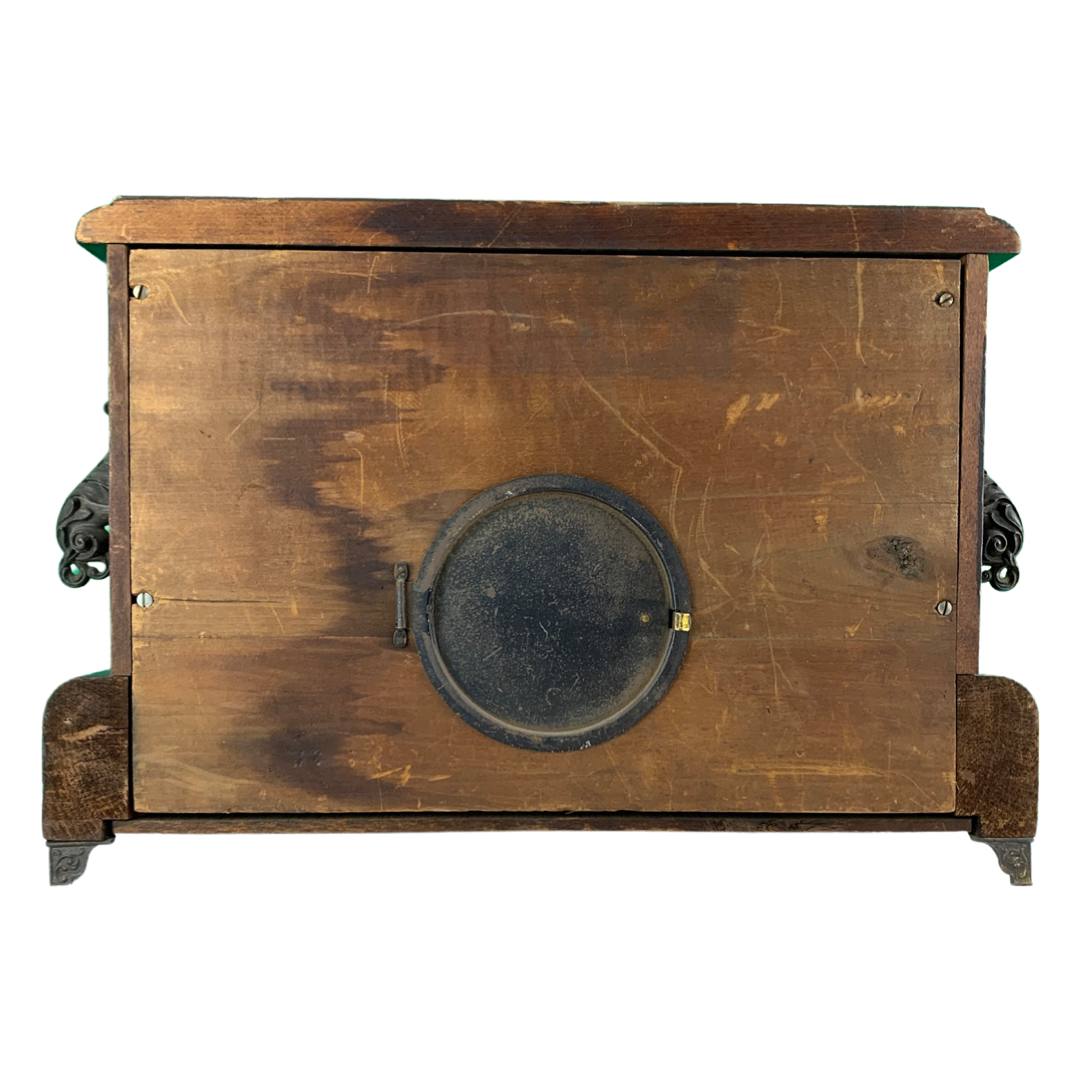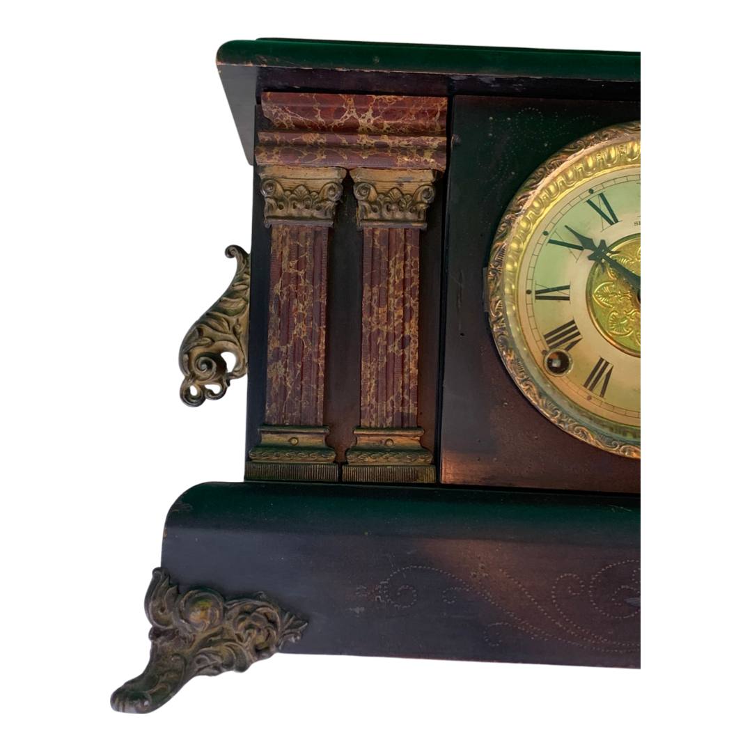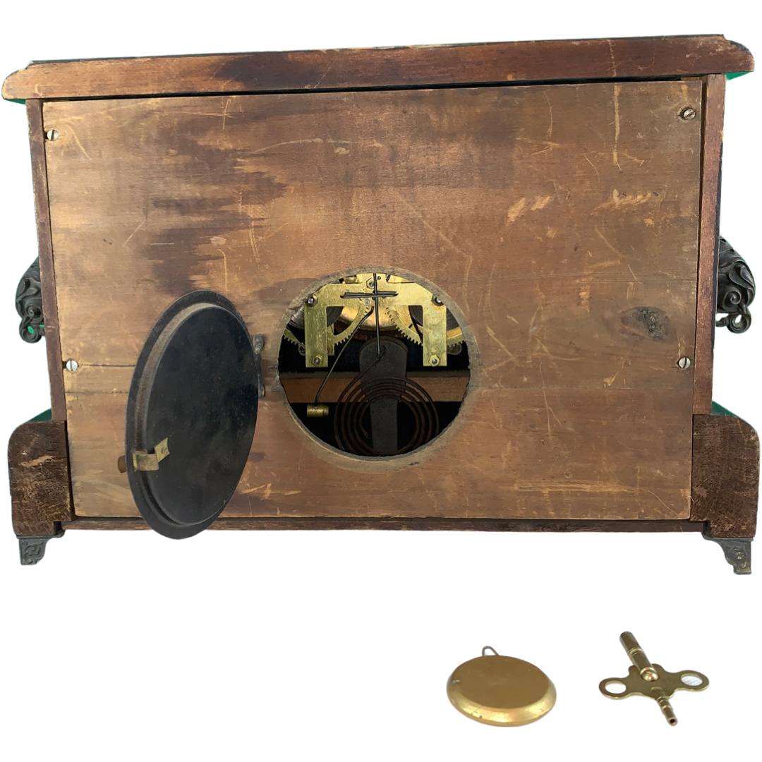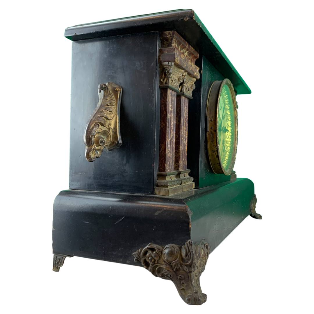 The Ingram mantle clock has a black stained wood casing, a gilt metal face with two sockets for winding by key (missing), faux marble columns, metal feet and a circular brass cover for opening in the back. Inside are the spiral movements and a hammer for ringing the time. There are two engravings on the back