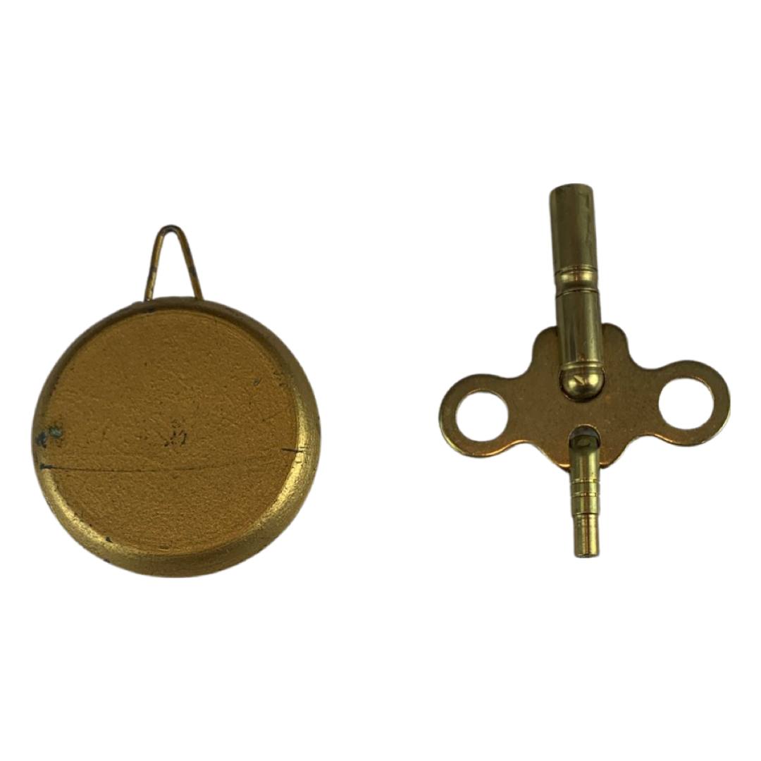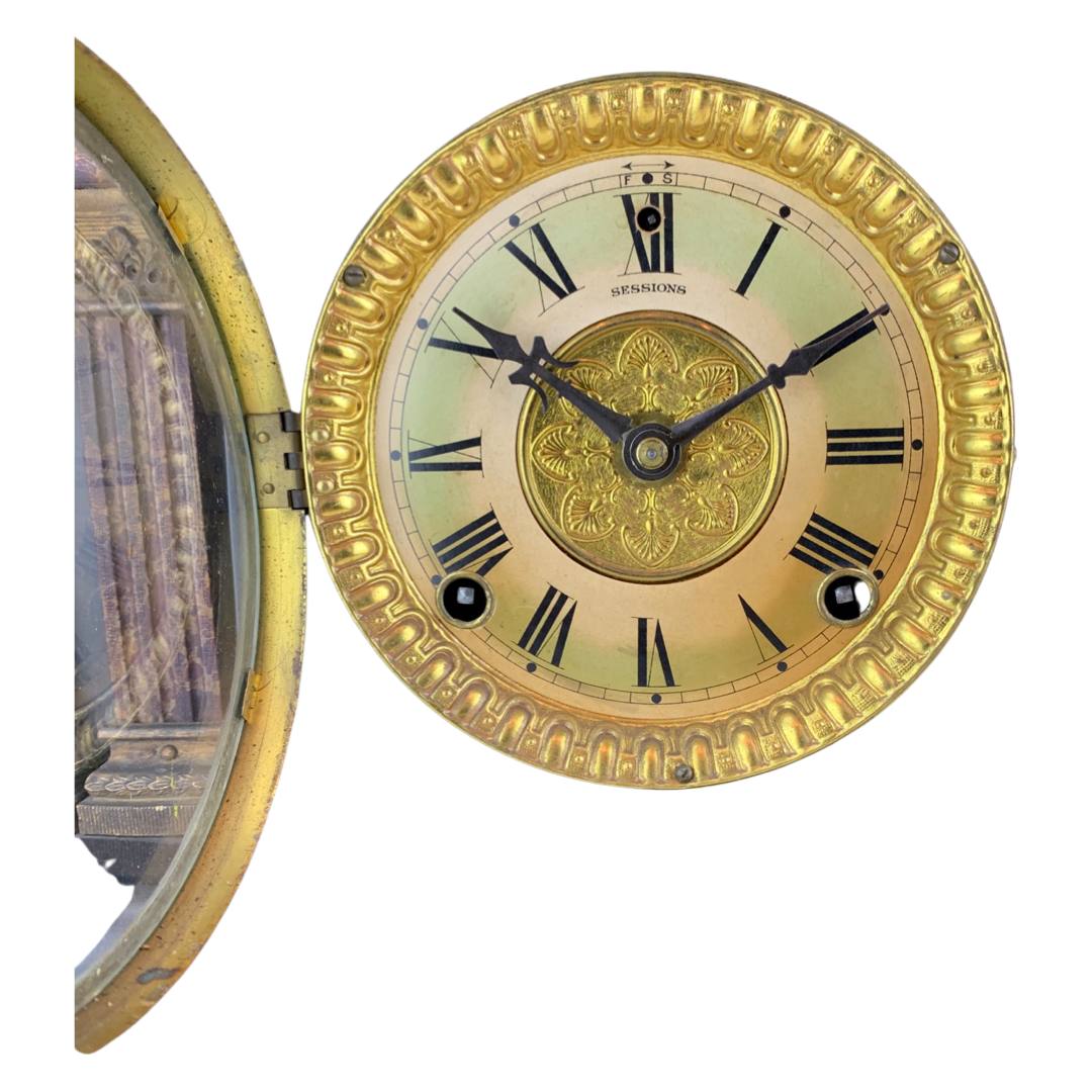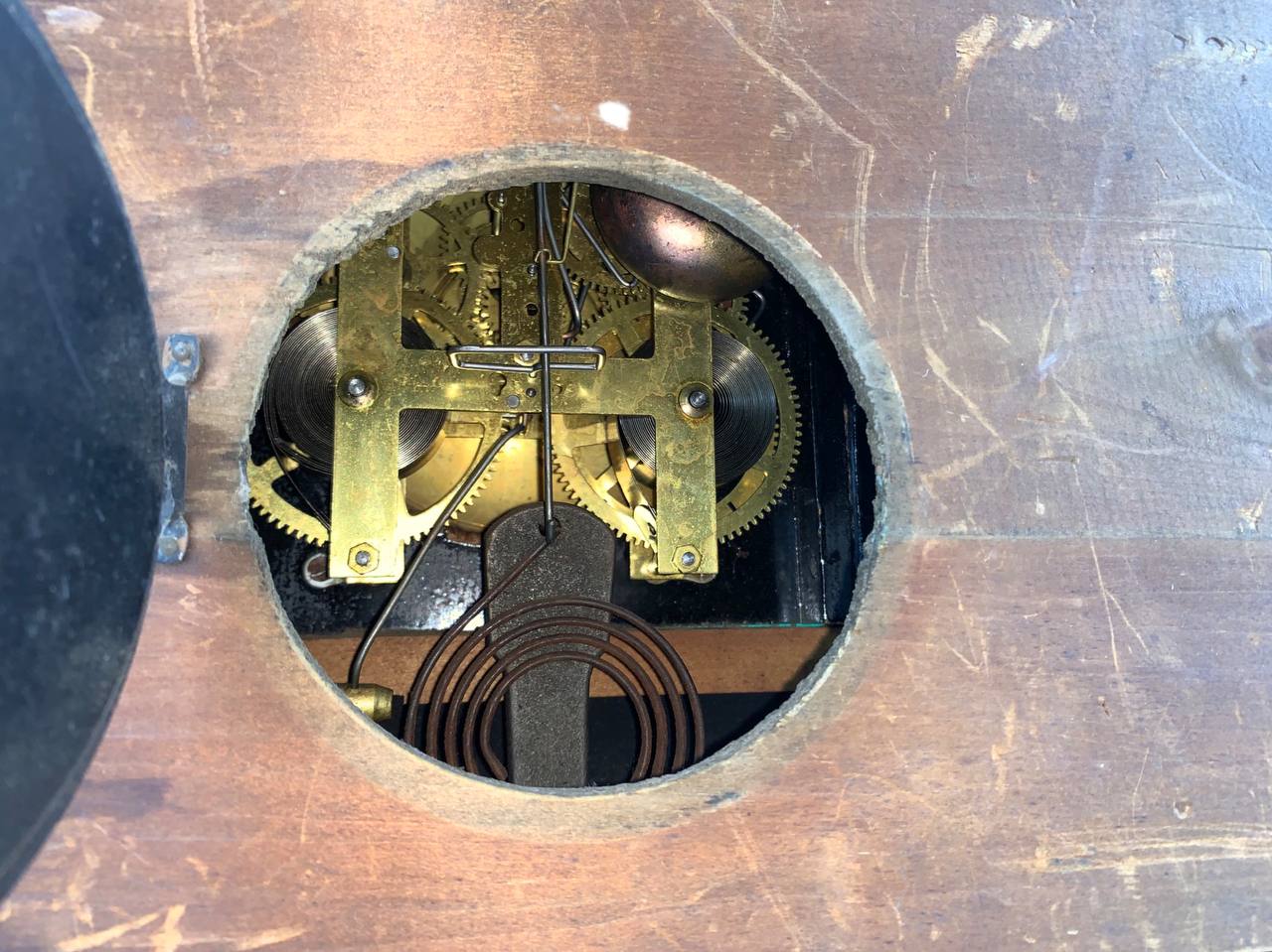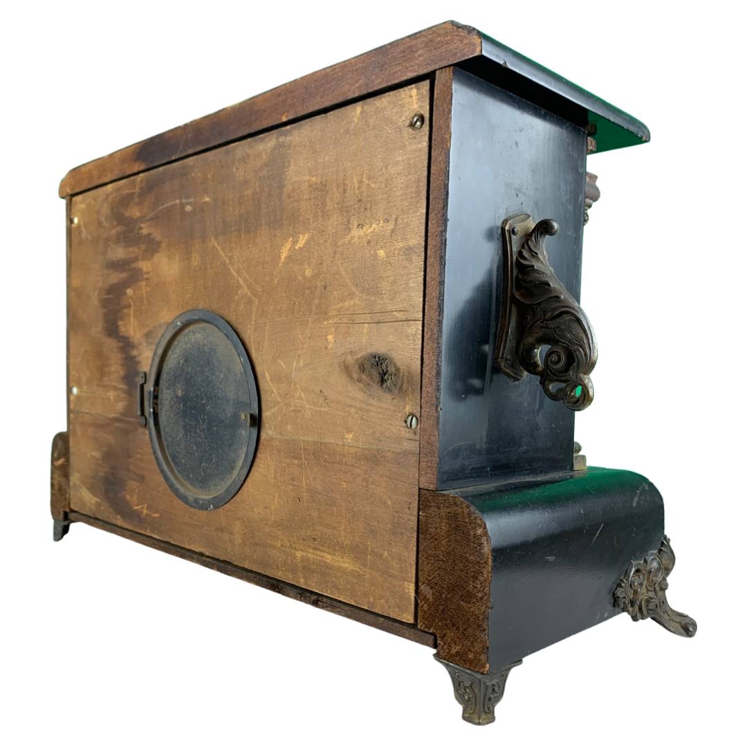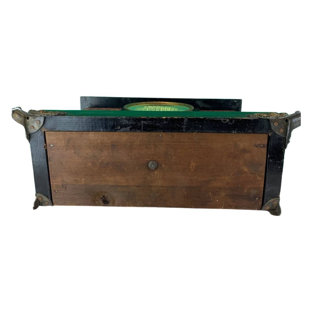 The Ingram mantle clock has a black stained wood casing, a gilt metal face with two sockets for winding by key (missing), faux marble columns, metal feet and a circular brass cover for opening in the back. Inside are the spiral movements and a hammer for ringing the time. There are two engravings on the back