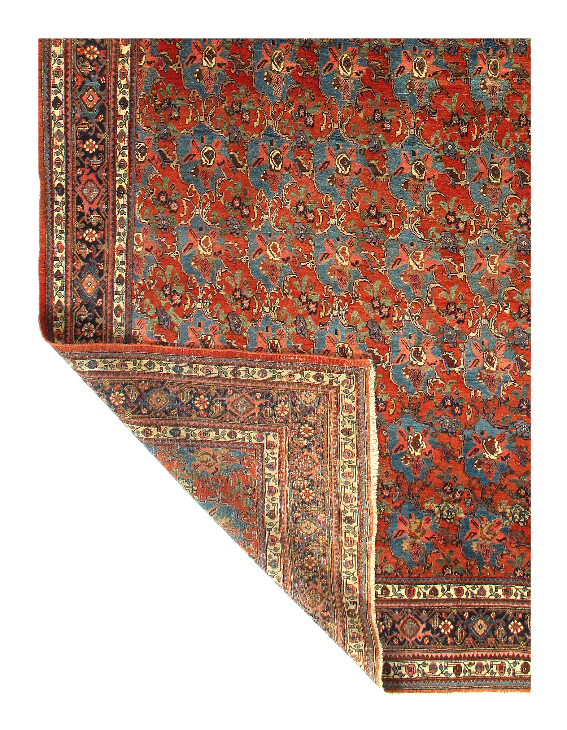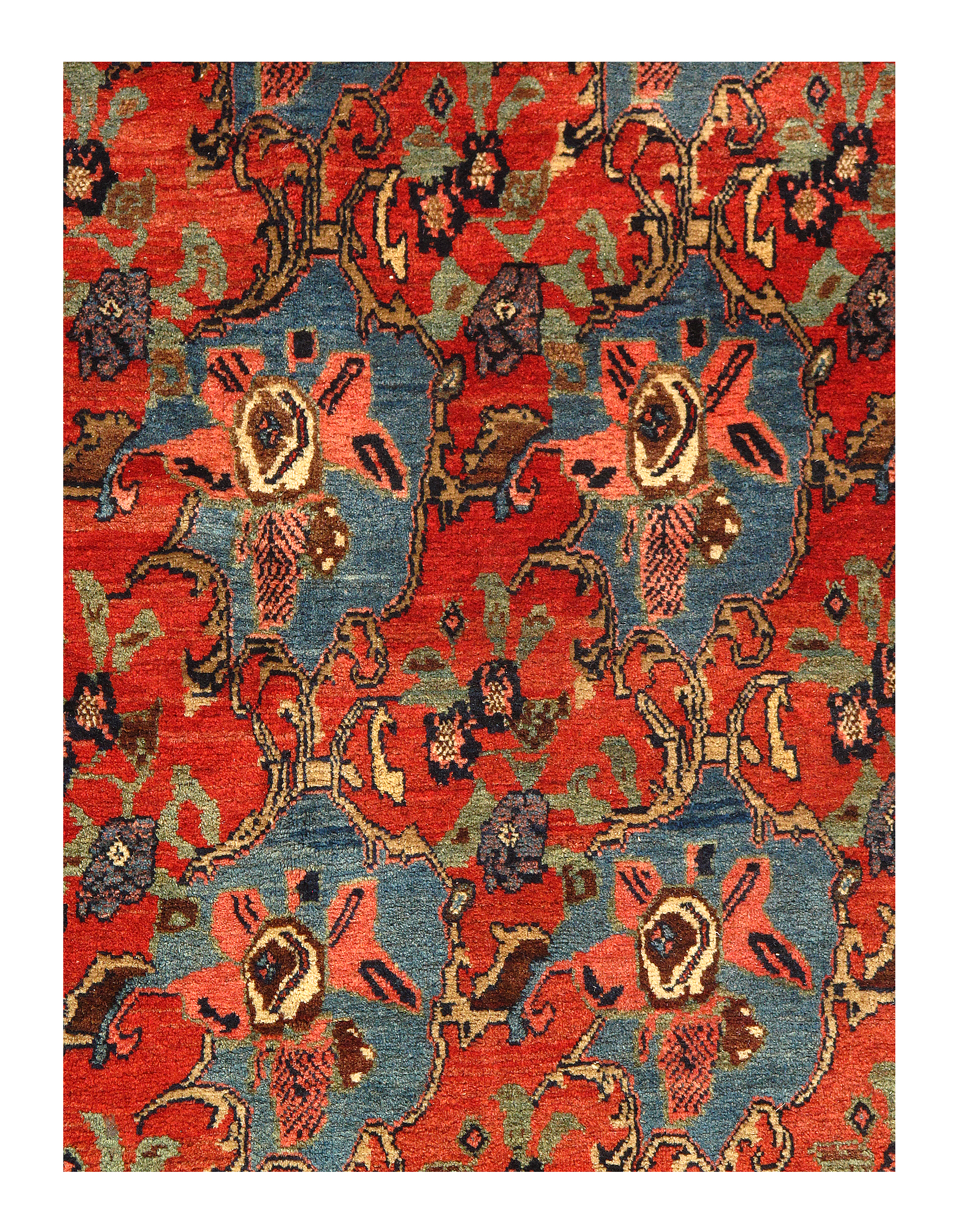 Vintage Persian Bidjar Rug, Origin: Persia – This carpet from the famed village of Bidjar showcases a superlative Medallion arabesque with extreme curvilinear decorations that represent a compilation of classical motifs inspired by Persia’s great weaving centers. The cosmopolitan arabesque displays a collection of sensuous vinescrolls arranged in a flamboyant medallion-style pattern. Recurving tendrils with stylized calyces meander across the obscure blue ground linking large-scale palmettes, carnations and feathered leaflets with polychromatic accents. These intricate motifs are enhanced by vivid hues of crimson, navy color and ivory juxtaposed against the deep, dark ground. Lavish crimson main borders filled with graceful turtle motifs provide a subtle northwest Persian influence while maintaining the curvilinear city-style form that gives this vintage Bidjar rug such a geometric appearance and a level of elegance associated with the golden age of Persian art.
