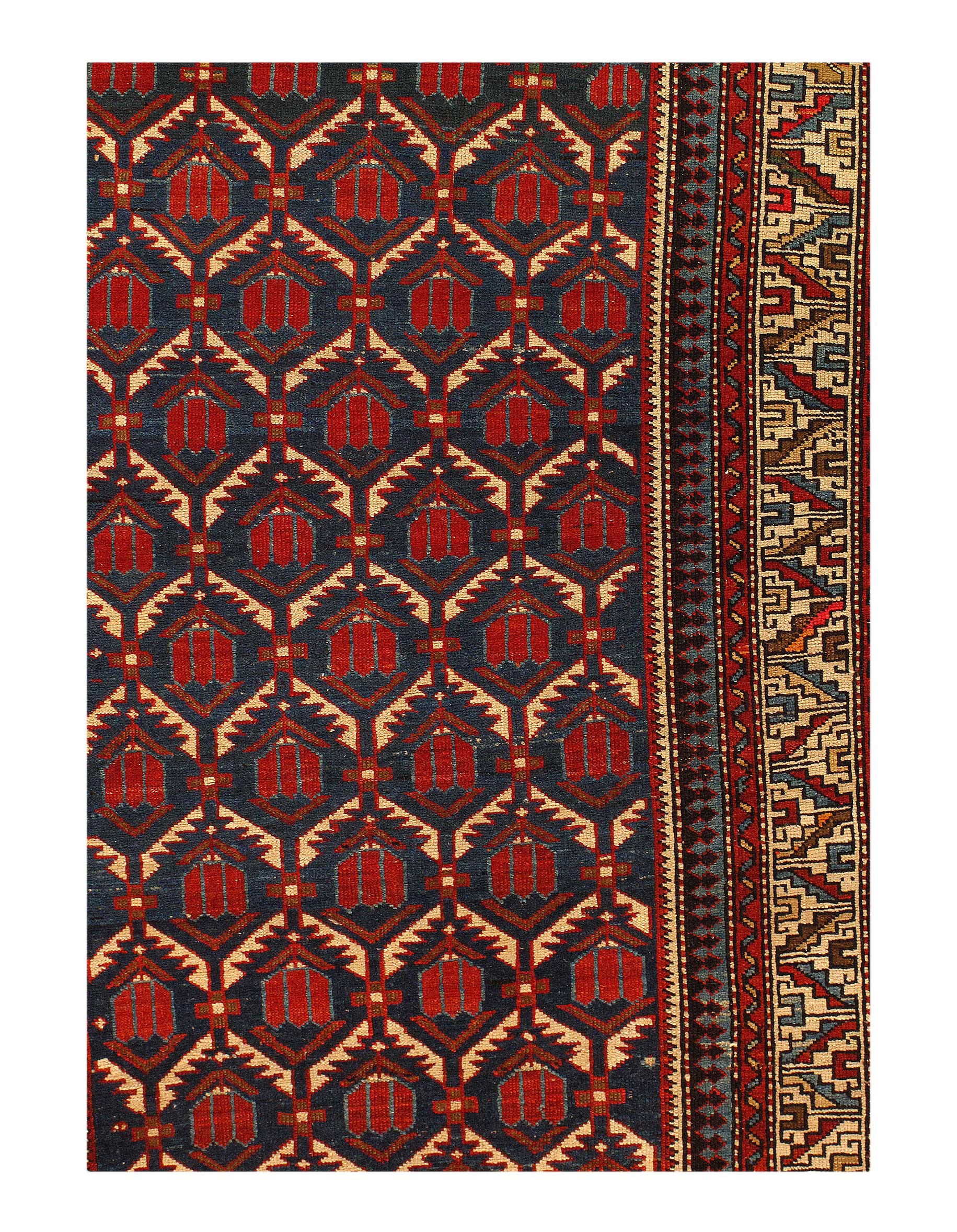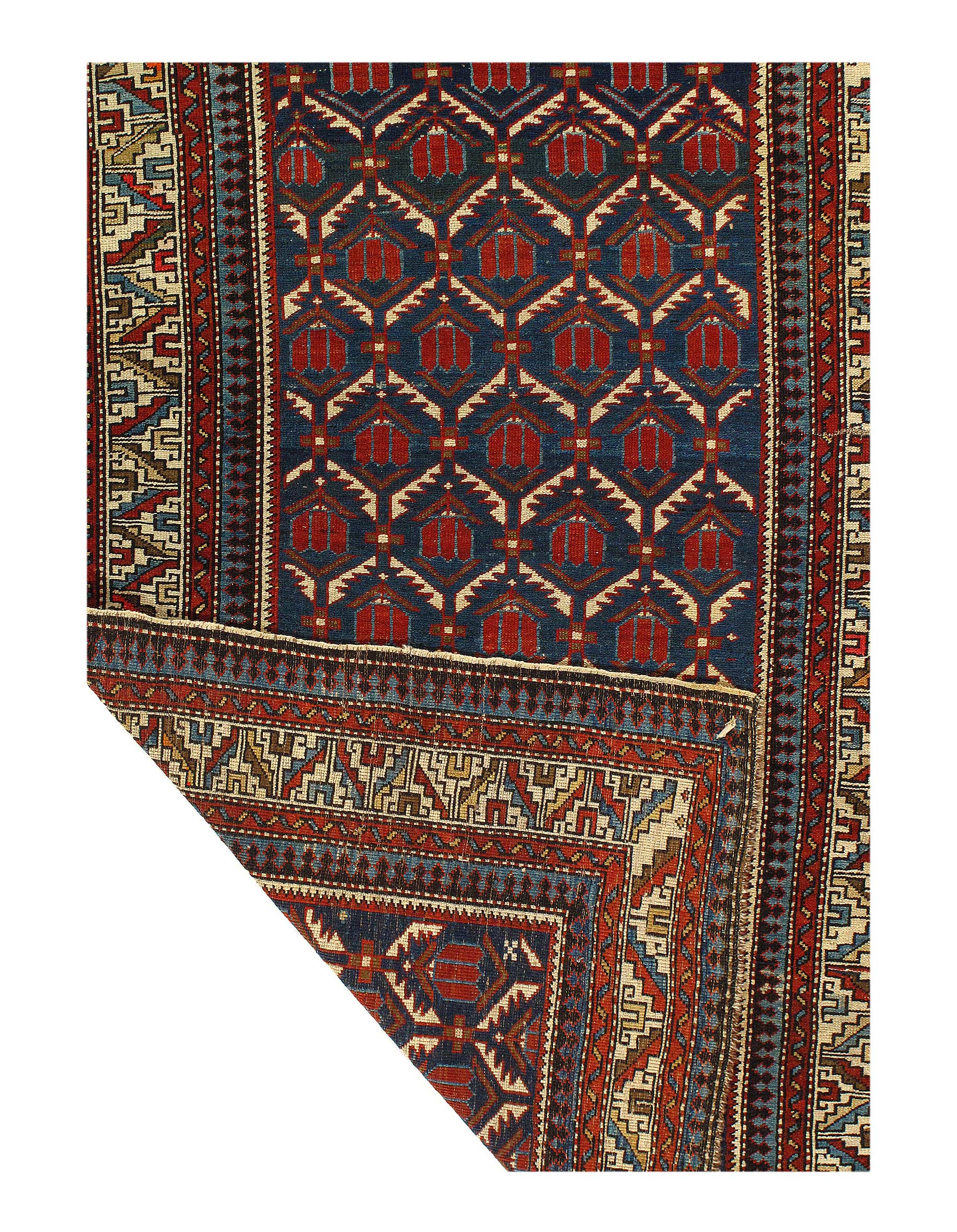 Kazak is a modern shape of old Caucasian rugs which strictly adheres to traditional design elements of the Caucasus. It has elements such as the stepped hooked polygons, geometrical medallions and rosettes, presented in more stylized manner and with a new dimension. Natural dyes produce soft luminous shades and abrashes causing a beautiful sheen. Handspun wool yarn is normally used in the variety of vibrant warm colors.
