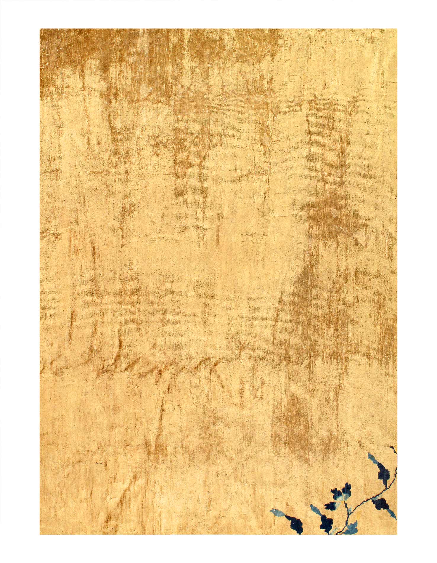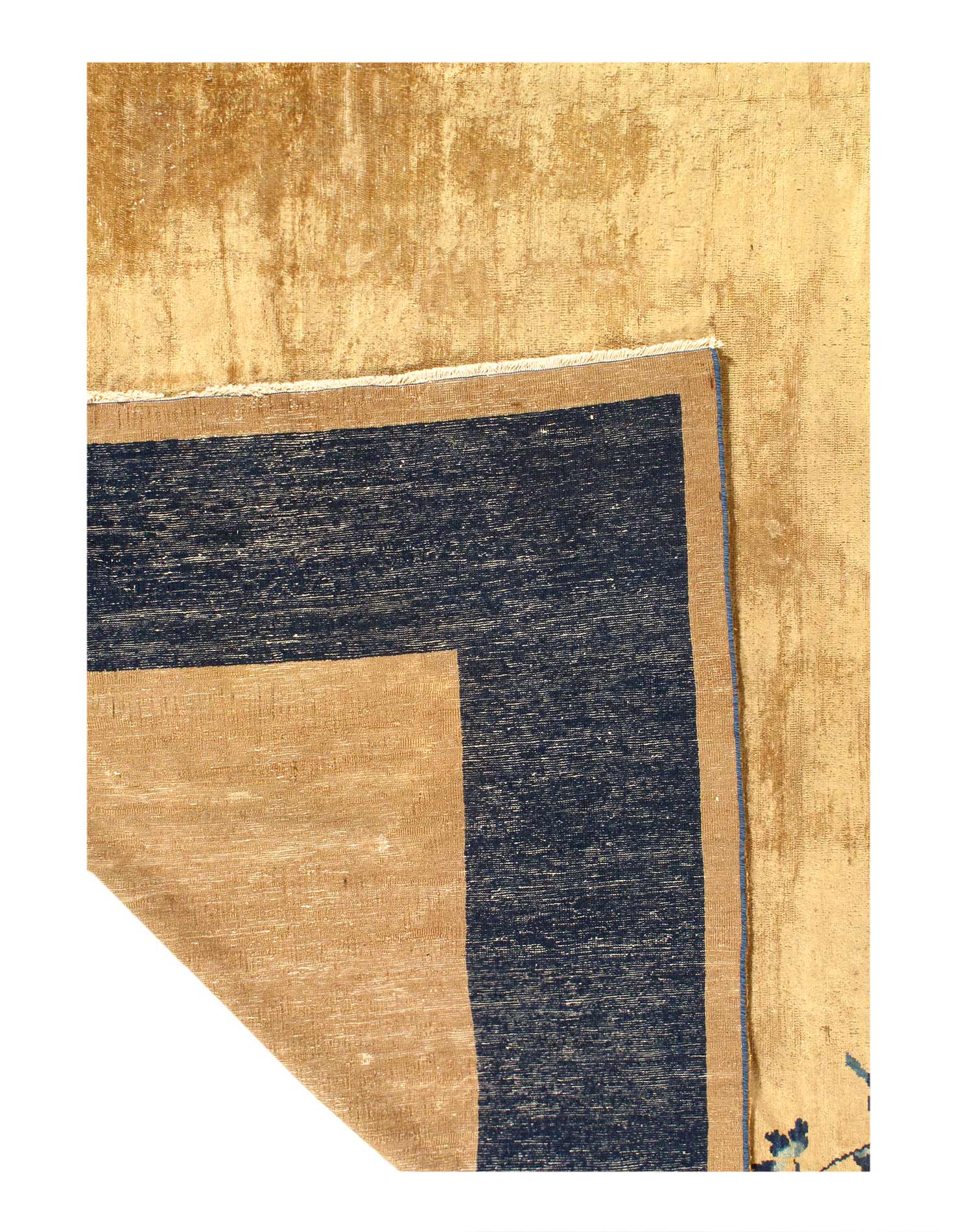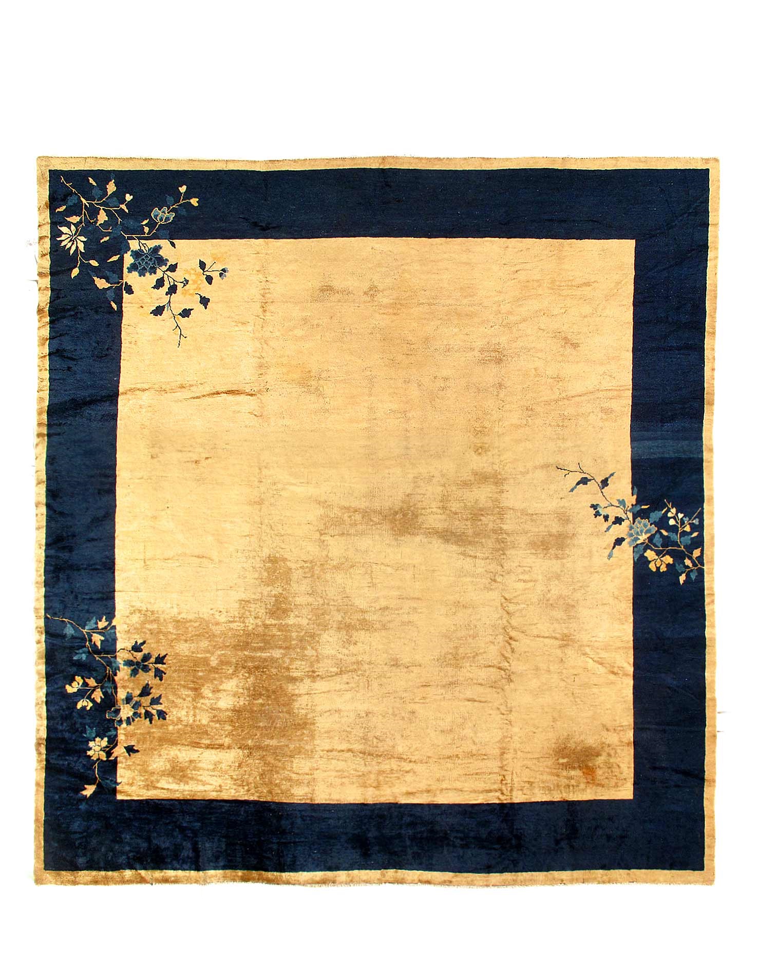 Chinese Deco Rug, Origin: China, Circa: Early 20th Century – Here is an exciting and appealing antique Oriental carpet – an antique Art Deco rug that was designed and woven in China during the early years of the twentieth century. Heavily informed by the aesthetic inclinations of the Art Deco period, this unique carpet is a compelling and thought-provoking example. A scalloped border of Blue encloses a beige /cream sand field on this exquisitely subtle and restrained antique Chinese Art Deco. At first the field appears empty or open, but it is actually covered by a tone-on-tone design of scrolls and cloud-bands emanating inward from the outer edges. In their sinuous rhythms they echo the scalloped forms of the border and continue its visual effects across the carpet in a more subdued manner. This carpet testifies to the masterful design sensibilities of Chinese weavers as they made the transition into the modern world. The Art Deco movement had an outside influence on the world of art and design, and some of the most important qualities and characteristics of that movement may be found in this fine rug.