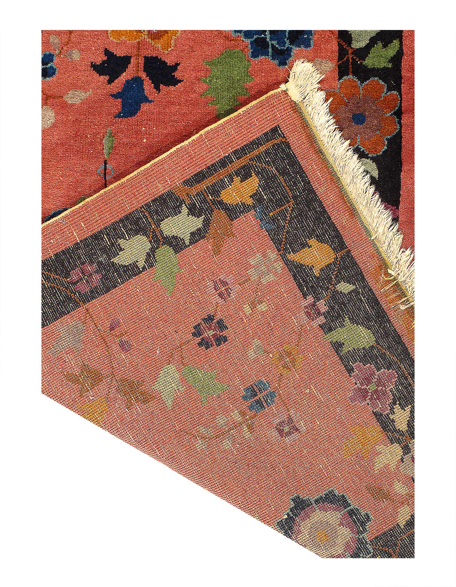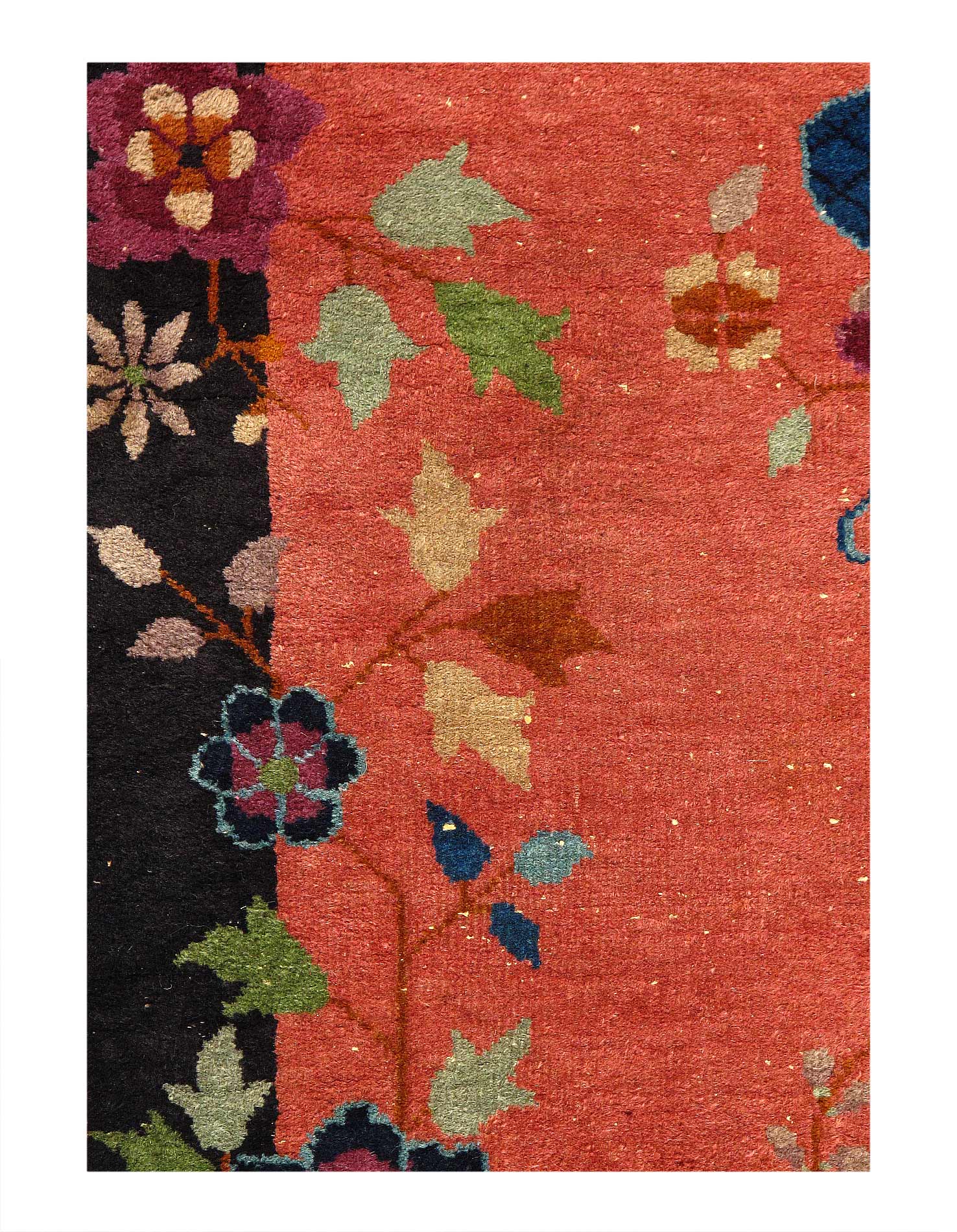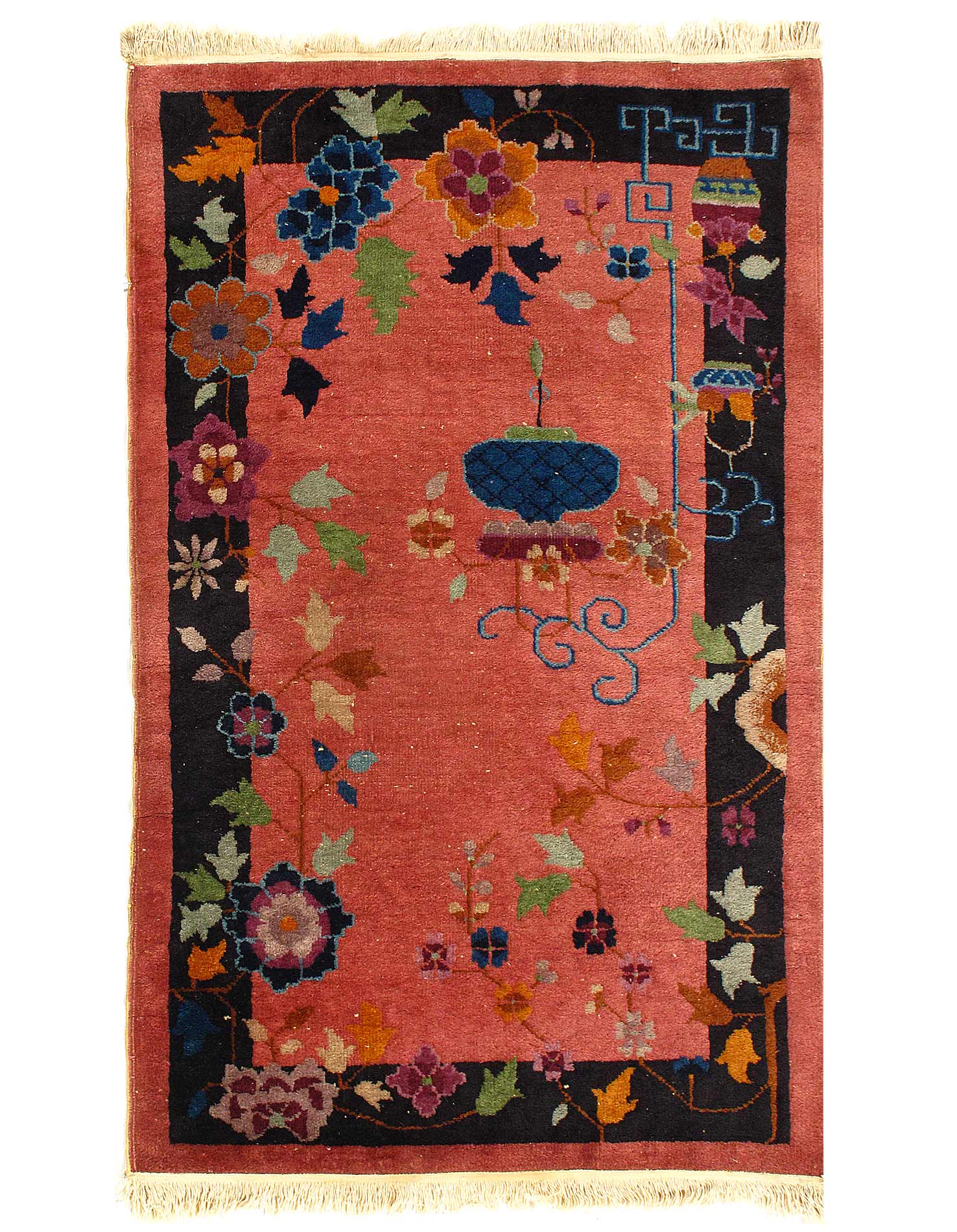 Chinese Deco Rug, Origin: China, Circa: Early 20th Century – Here is an exciting and appealing antique Oriental carpet – an antique Art Deco rug that was designed and woven in China during the early years of the twentieth century. Heavily informed by the aesthetic inclinations of the Art Deco period, this unique carpet is a compelling and thought-provoking example. A scalloped border of Blue encloses a Rose / Rust sand field on this exquisitely subtle and restrained antique Chinese Art Deco. At first the field appears empty or open, but it is actually covered by a tone-on-tone design of scrolls and cloud-bands emanating inward from the outer edges. In their sinuous rhythms they echo the scalloped forms of the border and continue its visual effects across the carpet in a more subdued manner. This carpet testifies to the masterful design sensibilities of Chinese weavers as they made the transition into the modern world. The Art Deco movement had an outside influence on the world of art and design, and some of the most important qualities and characteristics of that movement may be found in this fine rug.