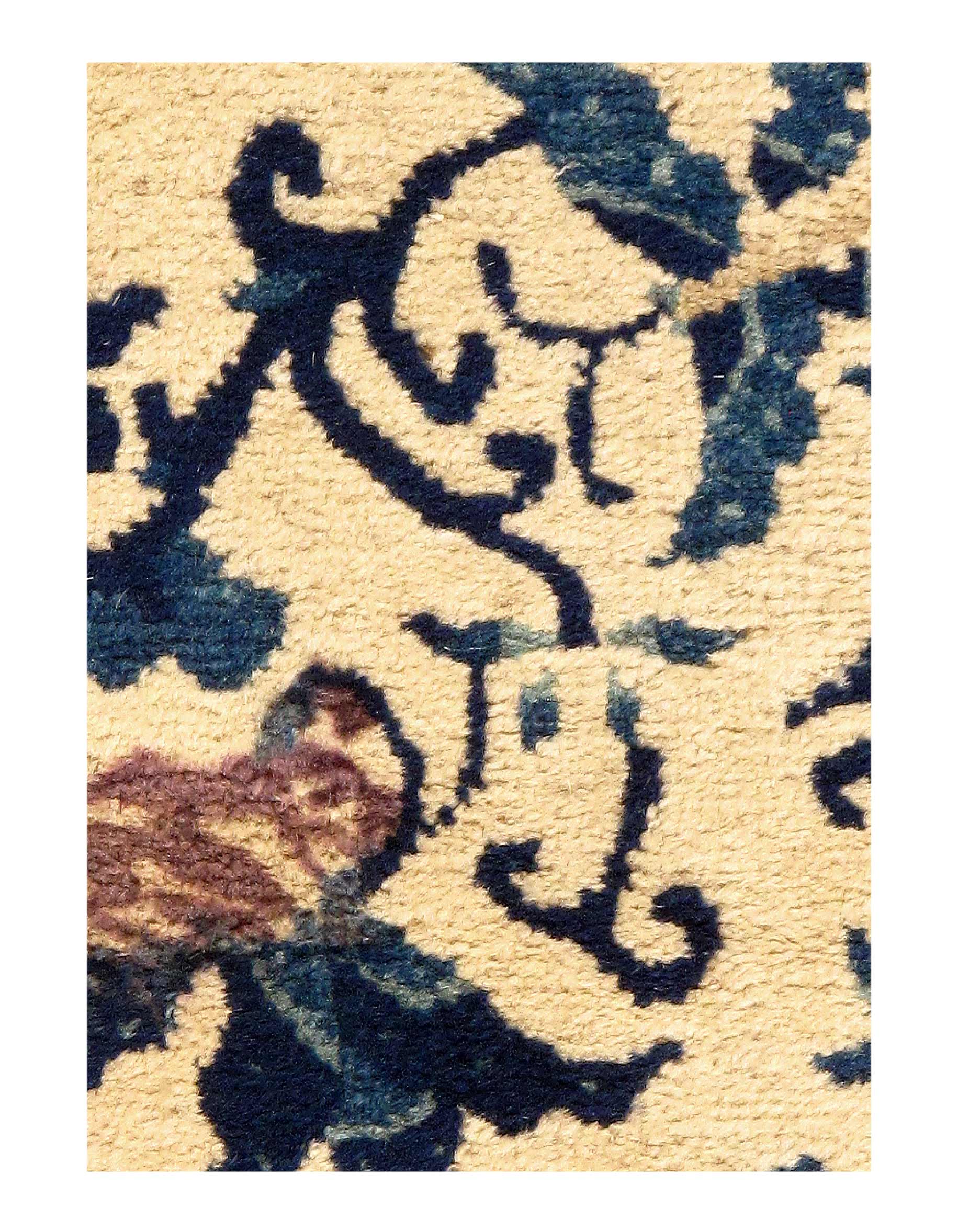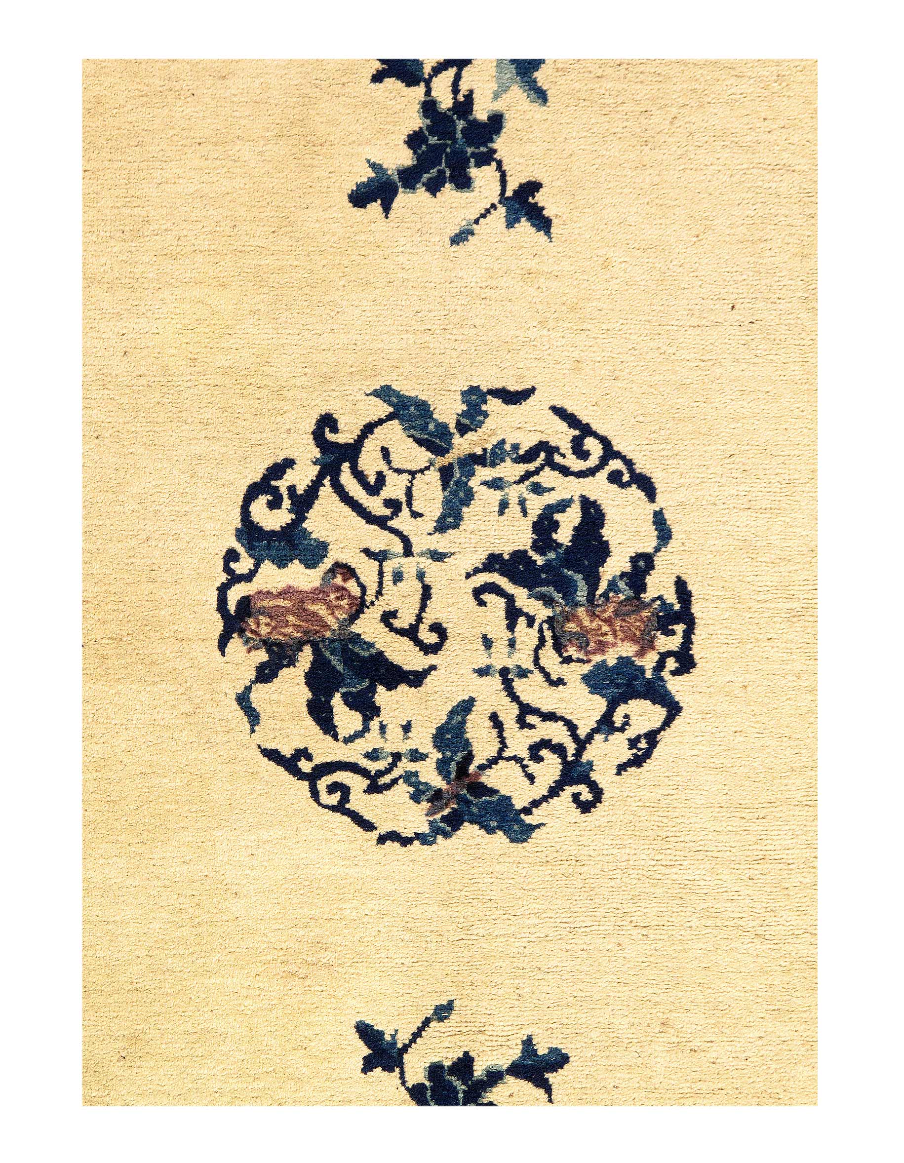 Chinese Deco Rug, Origin: China, Circa: Early 20th Century – Here is an exciting and appealing antique Oriental carpet – an antique Art Deco rug that was designed and woven in China during the early years of the twentieth century. Heavily informed by the aesthetic inclinations of the Art Deco period, this unique carpet is a compelling and thought-provoking example. A scalloped border of Blue encloses a Beige / Ivory sand field on this exquisitely subtle and restrained antique Chinese Art Deco. At first the field appears empty or open, but it is actually covered by a tone-on-tone design of scrolls and cloud-bands emanating inward from the outer edges. In their sinuous rhythms they echo the scalloped forms of the border and continue its visual effects across the carpet in a more subdued manner. This carpet testifies to the masterful design sensibilities of Chinese weavers as they made the transition into the modern world. The Art Deco movement had an outside influence on the world of art and design, and some of the most important qualities and characteristics of that movement may be found in this fine rug.