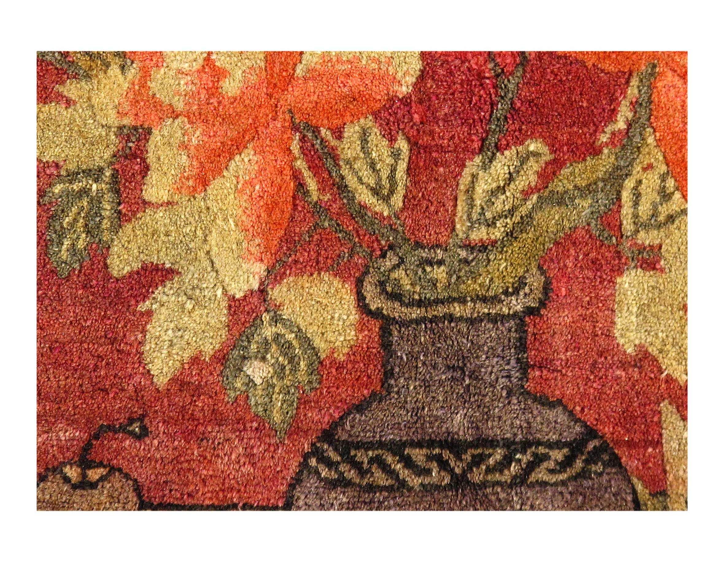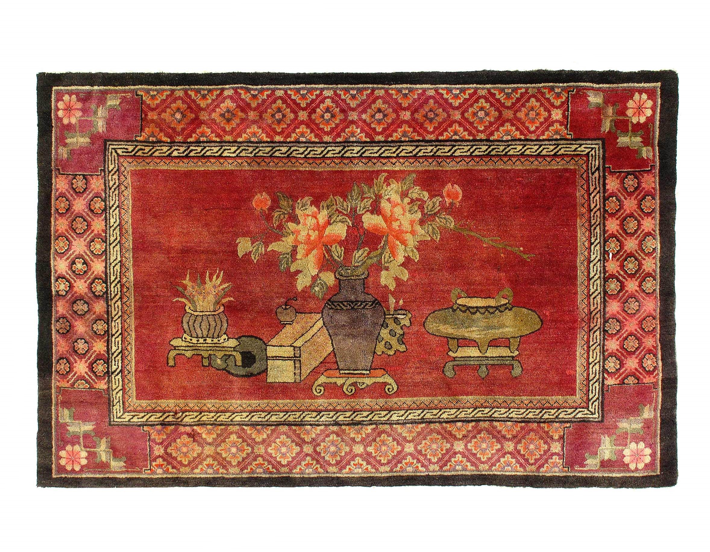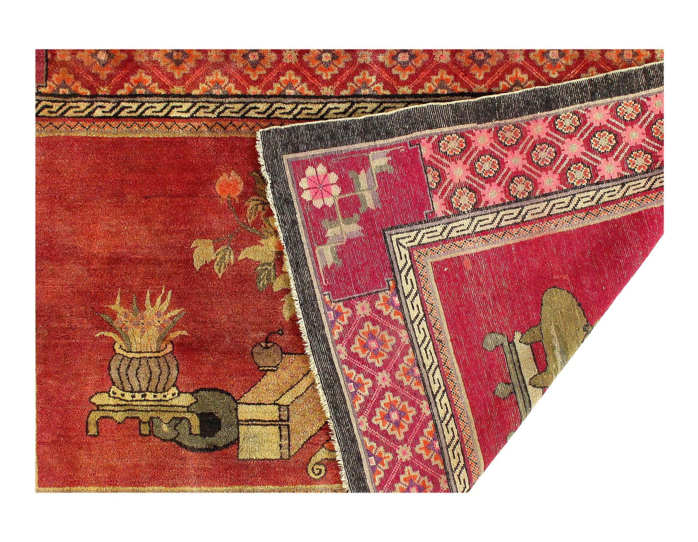 Antique Chinese Deco Rug, Origin: China, Circa: Early 20th Century – Here is an exciting and appealing antique Oriental carpet – an antique Art Deco rug that was designed and woven in China during the early years of the twentieth century. Heavily informed by the aesthetic inclinations of the Art Deco period, this unique carpet is a compelling and thought-provoking example. A scalloped Purple encloses a Light Green sand field on this exquisitely subtle and restrained antique Chinese Art Deco. At first the field appears empty or open, but it is actually covered by a tone-on-tone design of scrolls and cloud-bands emanating inward from the outer edges. In their sinuous rhythms they echo the scalloped forms of the border and continue its visual effects across the carpet in a more subdued manner. This carpet testifies to the masterful design sensibilities of Chinese weavers as they made the transition into the modern world. The Art Deco movement had an outside influence on the world of art and design, and some of the most important qualities and characteristics of that movement may be found in this fine small rug.