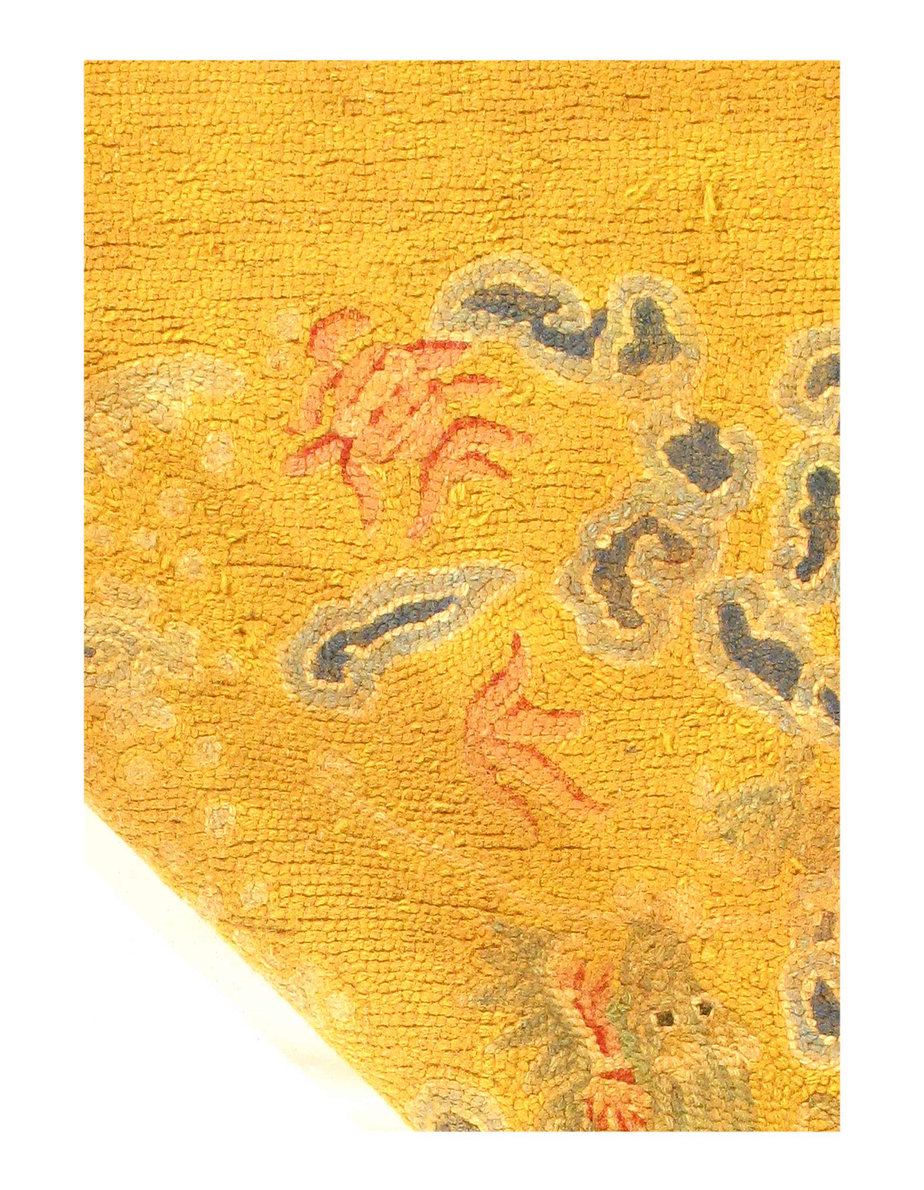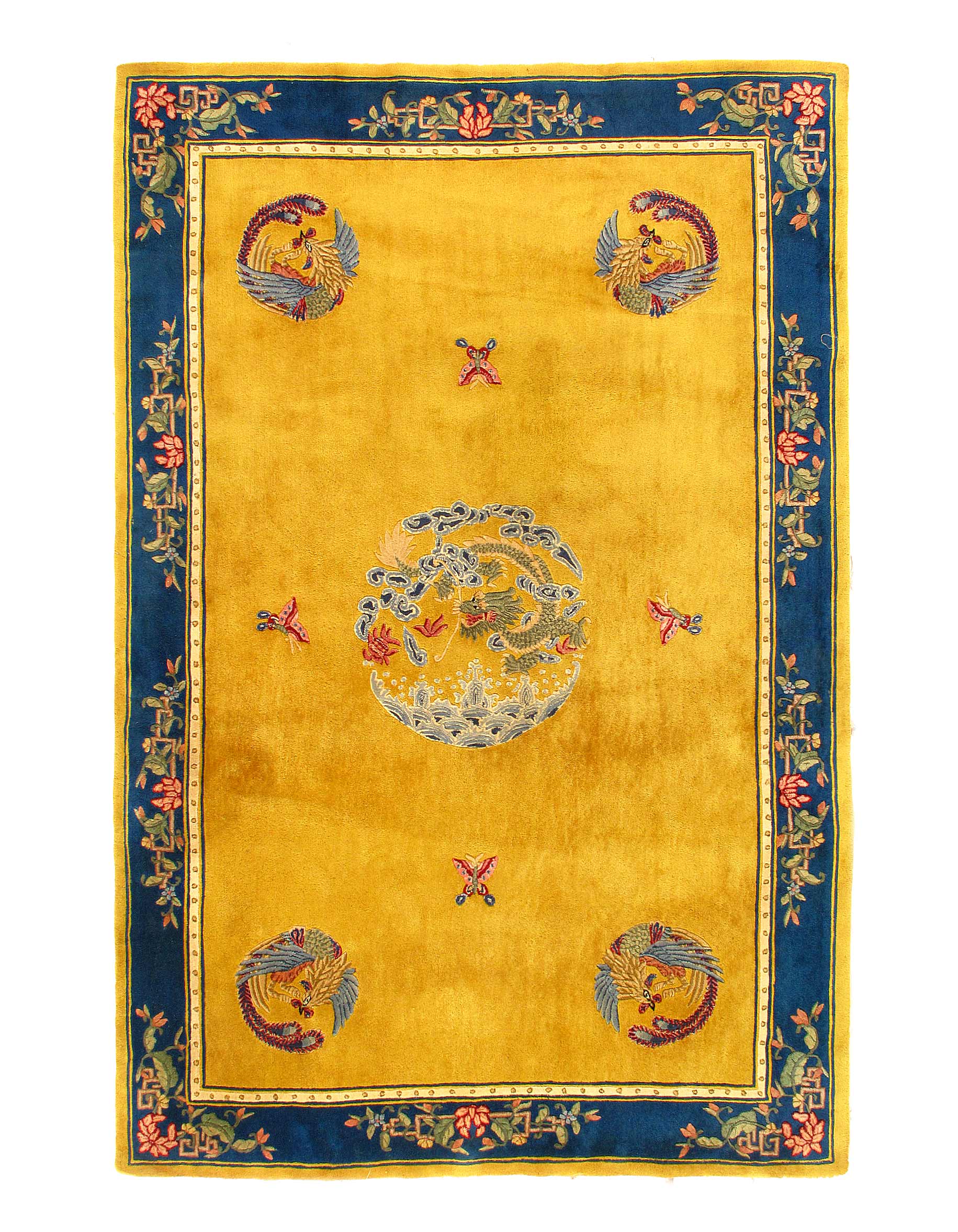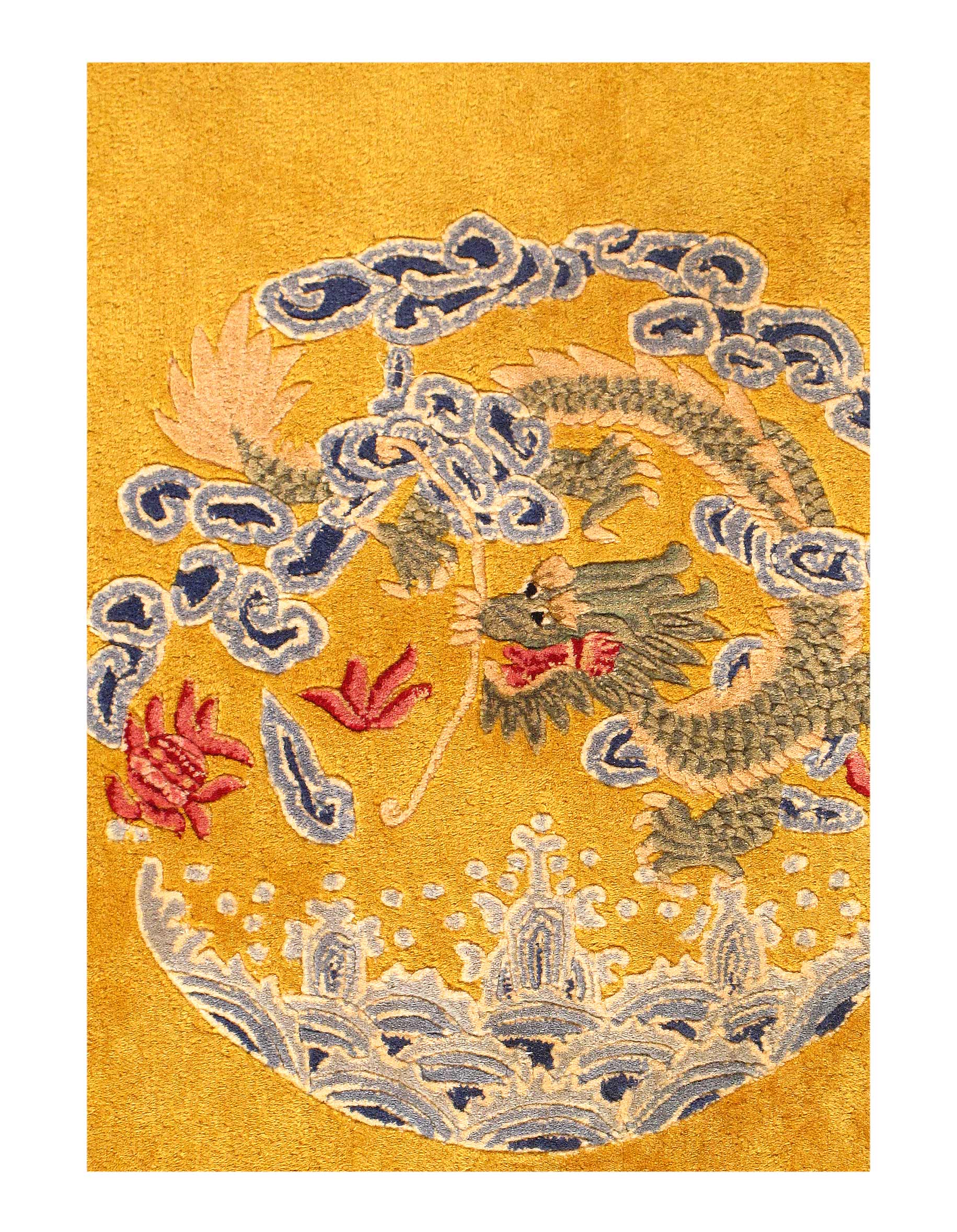 Of note is the artistic and fascinating Chinese dragon in the center with an emblem that may represent the royalty, ruler, or person who commissioned the work. The central Dragon is larger and more powerful than the other four the dragons that are depicted in this breathtaking antique rug from China. This may be symbolic of an event, or simply as a demonstration of power.
