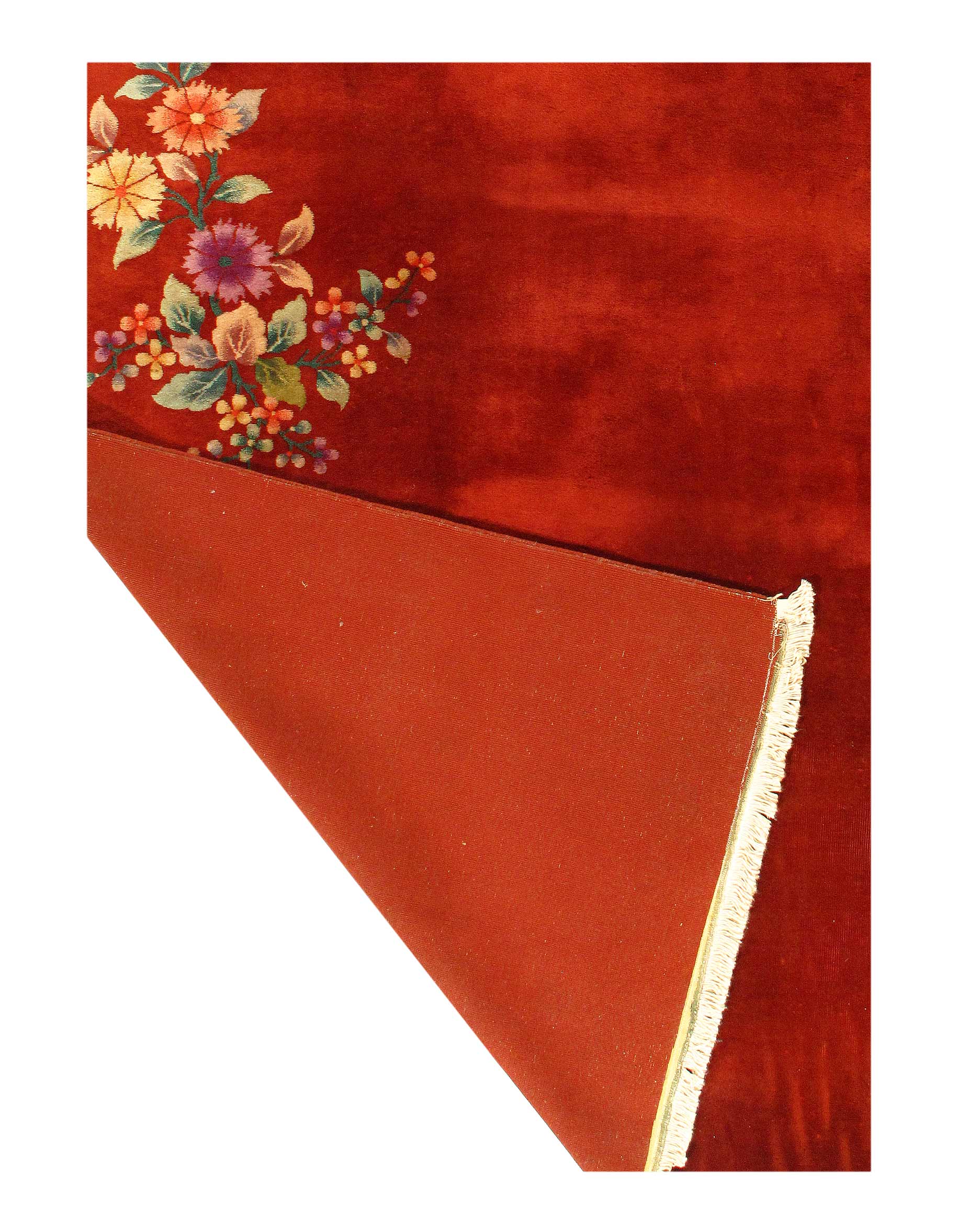 Antique Chinese Deco Rug, Origin: China, Circa: Early 20th Century – Here is an exciting and appealing antique Oriental carpet – an antique Art Deco rug that was designed and woven in China during the early years of the twentieth century. Heavily informed by the aesthetic inclinations of the Art Deco period, this unique carpet is a compelling and thought-provoking example. A scalloped Purple encloses a Light Green sand field on this exquisitely subtle and restrained antique Chinese Art Deco. At first the field appears empty or open, but it is actually covered by a tone-on-tone design of scrolls and cloud-bands emanating inward from the outer edges. In their sinuous rhythms they echo the scalloped forms of the border and continue its visual effects across the carpet in a more subdued manner. This carpet testifies to the masterful design sensibilities of Chinese weavers as they made the transition into the modern world. The Art Deco movement had an outside influence on the world of art and design.