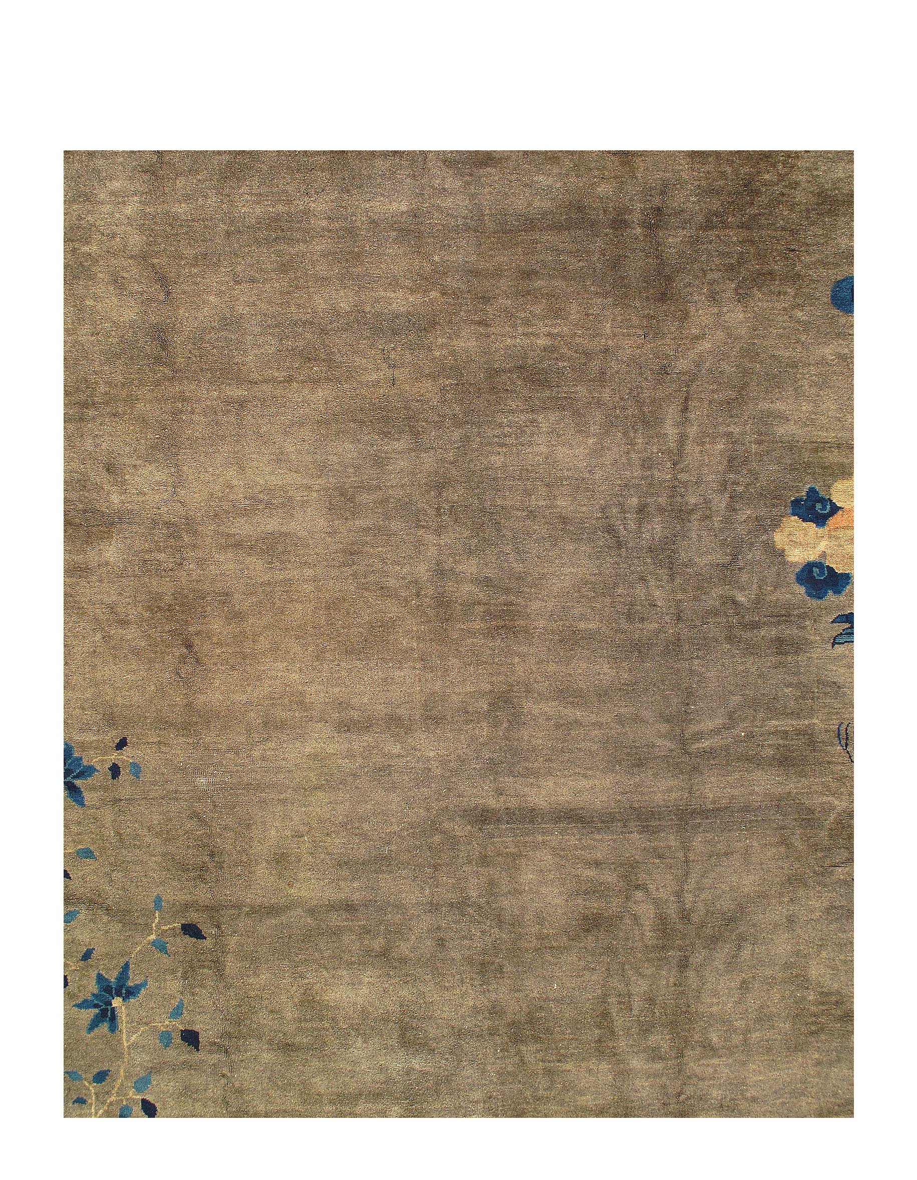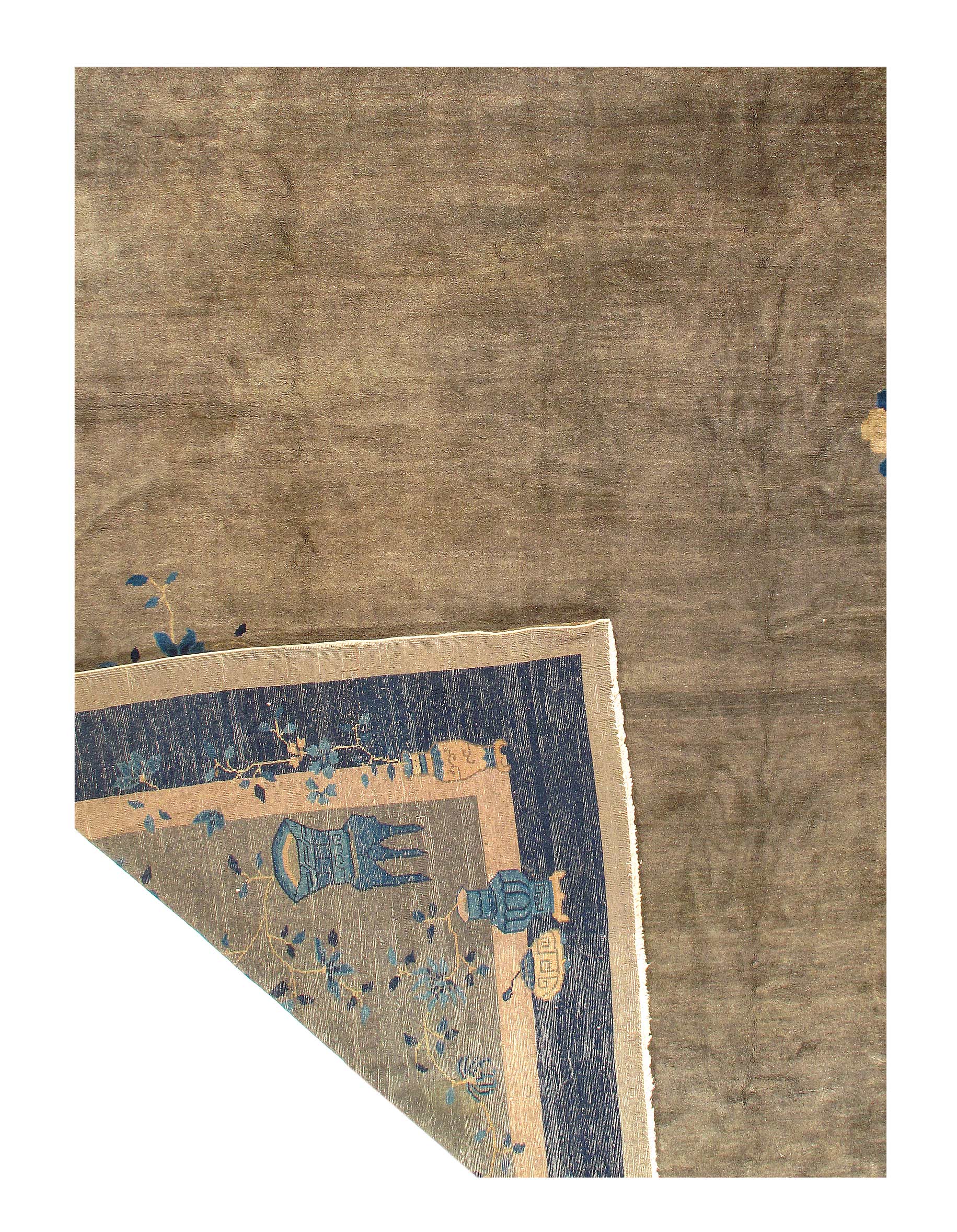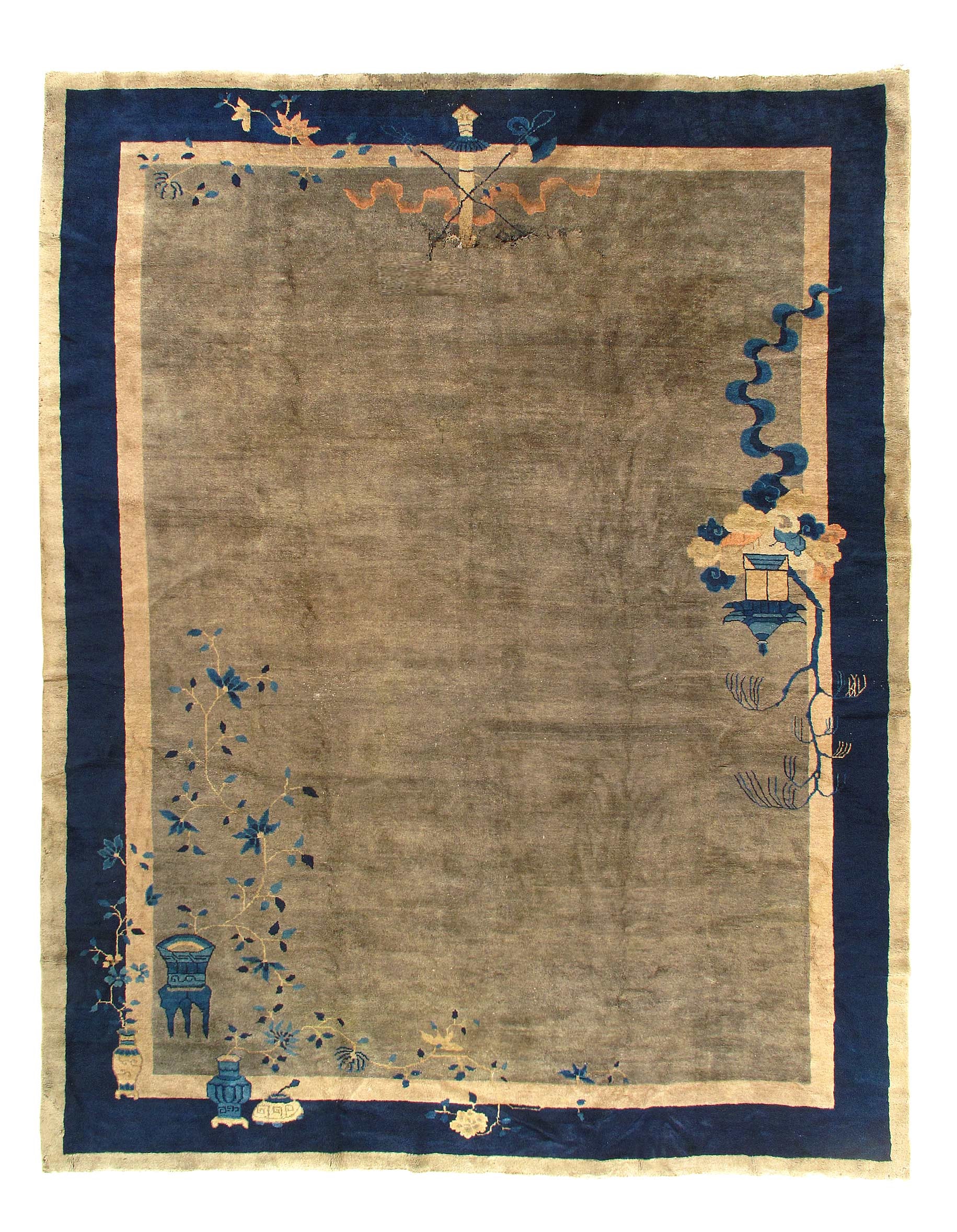 Antique Chinese Deco Rug, Origin: China, Circa: Early 20th Century β Here is an exciting and appealing antique Oriental carpet β an antique Art Deco rug that was designed and woven in China during the early years of the twentieth century. Heavily informed by the aesthetic inclinations of the Art Deco period, this unique carpet is a compelling and thought-provoking example. A scalloped Beige encloses a Navy Blue sand field on this exquisitely subtle and restrained antique Chinese Art Deco. At first the field appears empty or open, but it is actually covered by a tone-on-tone design of scrolls and cloud-bands emanating inward from the outer edges. In their sinuous rhythms they echo the scalloped forms of the border and continue its visual effects across the carpet in a more subdued manner. This carpet testifies to the masterful design sensibilities of Chinese weavers as they made the transition into the modern world. The Art Deco movement had an outside influence on the world of art and design, and some of the most important qualities and characteristics of that movement may be found in this fine rug.