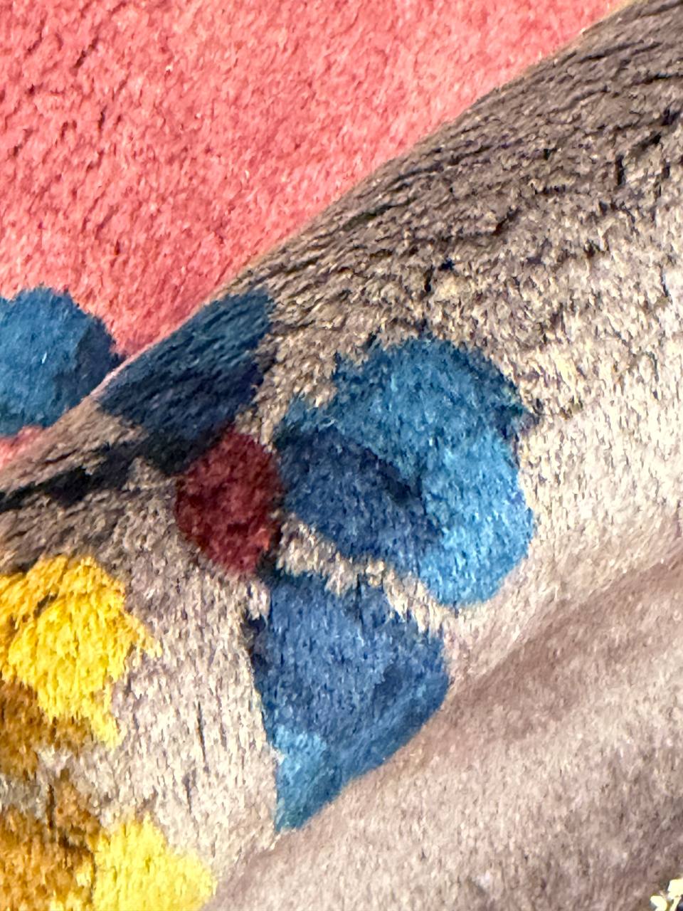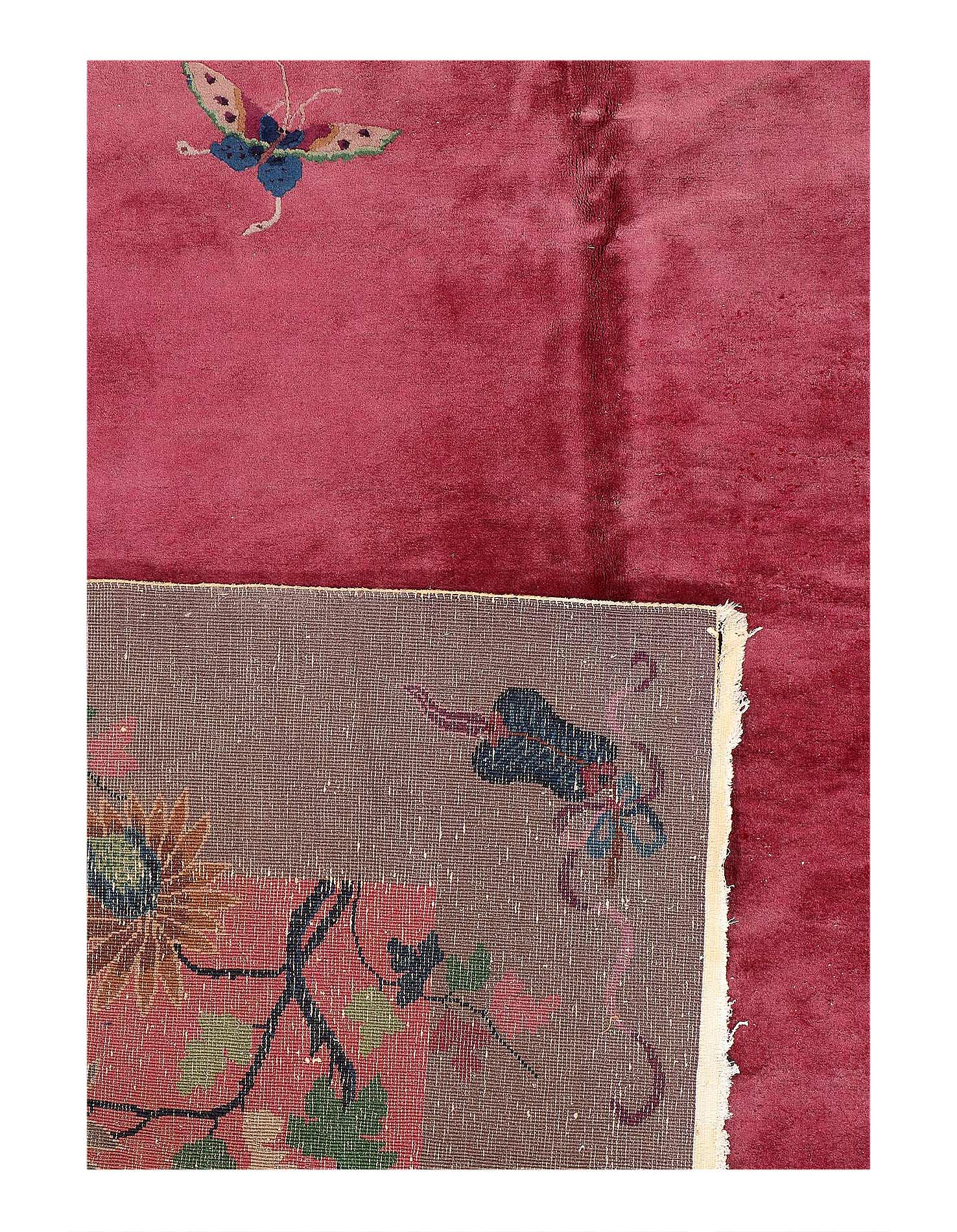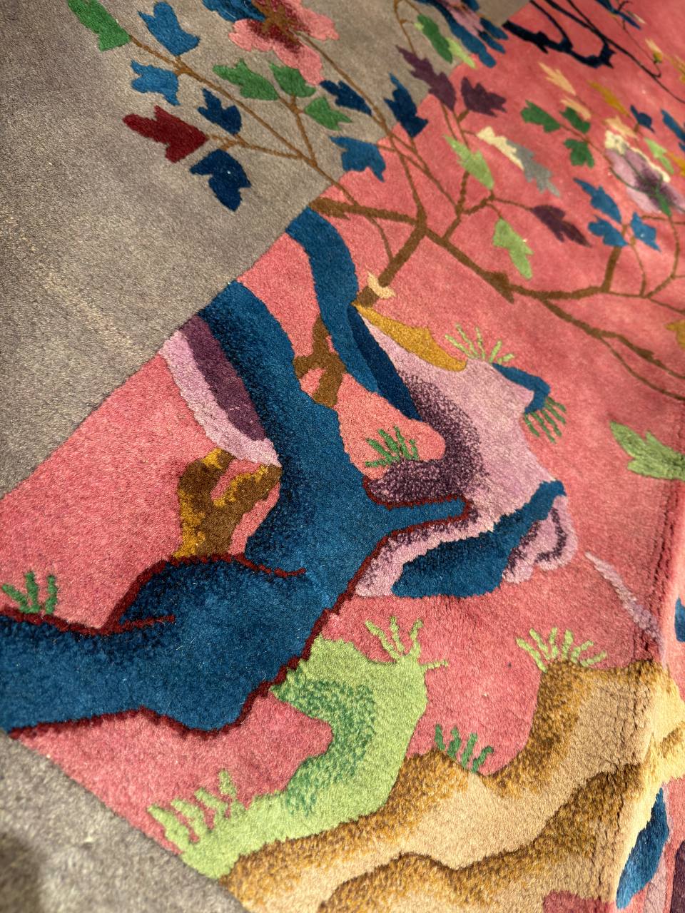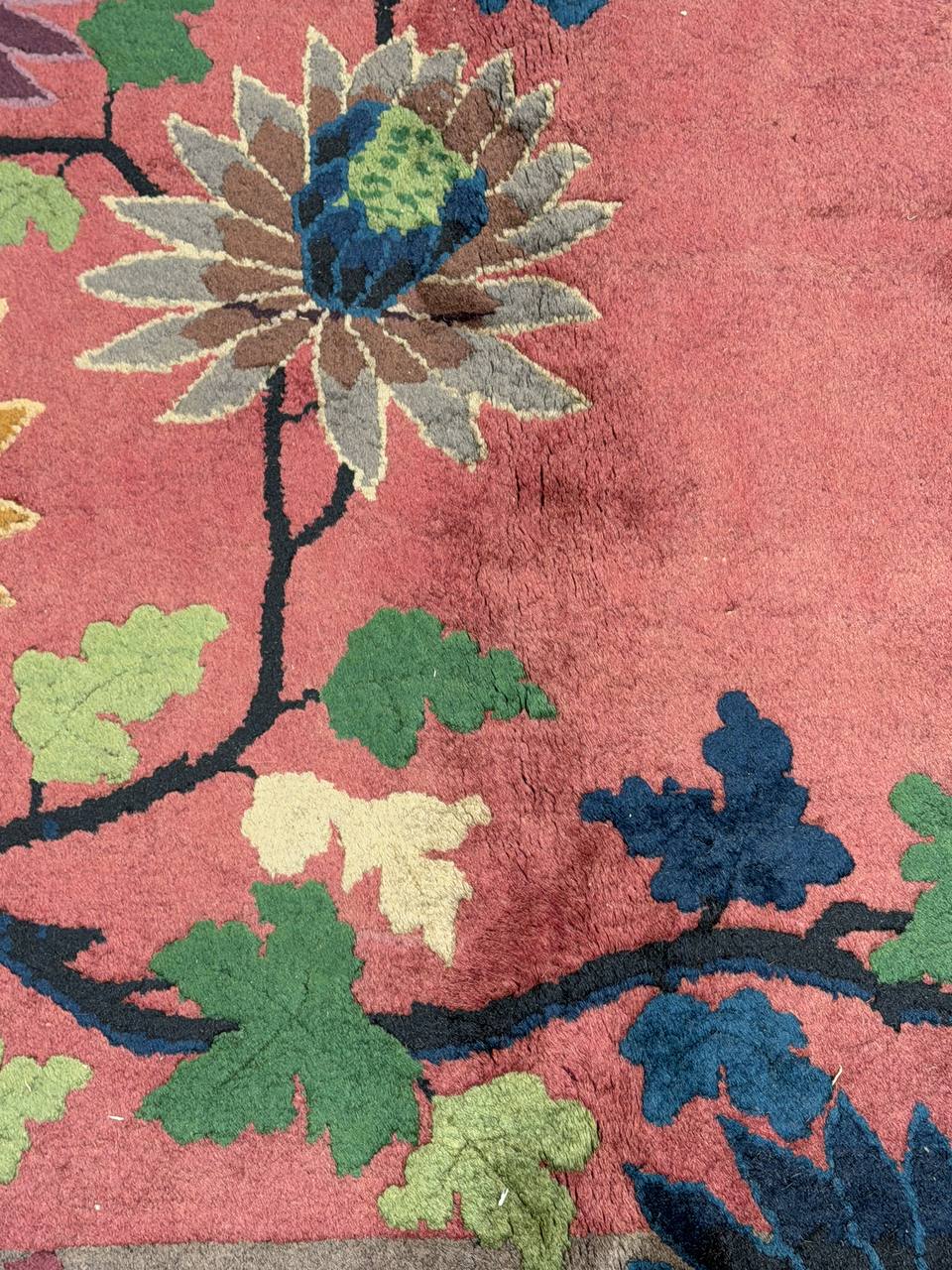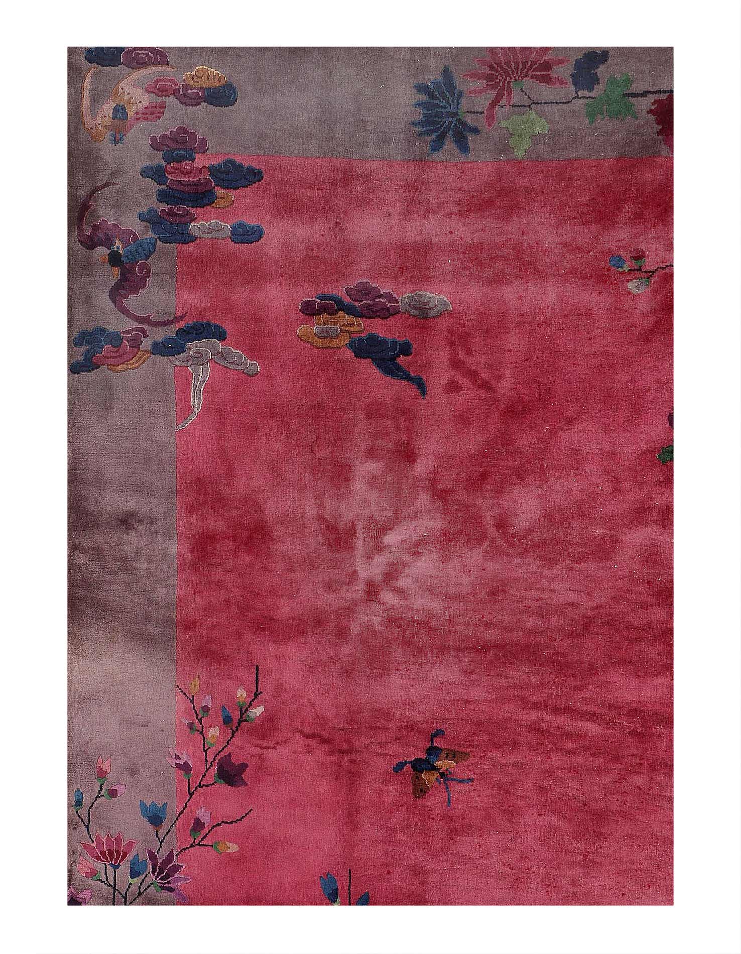 Chinese Deco Rug, Origin: China, Circa: Early 20th Century β Here is an exciting and appealing antique Oriental carpet β an antique Art Deco rug that was designed and woven in China during the early years of the twentieth century. Heavily informed by the aesthetic inclinations of the Art Deco period, this unique carpet is a compelling and thought-provoking example. A scalloped border of Gold encloses a Light Brown / Blue sand field on this exquisitely subtle and restrained antique Chinese Art Deco. At first the field appears empty or open, but it is actually covered by a tone-on-tone design of scrolls and cloud-bands emanating inward from the outer edges. In their sinuous rhythms they echo the scalloped forms of the border and continue its visual effects across the carpet in a more subdued manner. This carpet testifies to the masterful design sensibilities of Chinese weavers as they made the transition into the modern world. The Art Deco movement had an outside influence on the world of art and design, and some of the most important qualities and characteristics of that movement may be found in this fine rug.