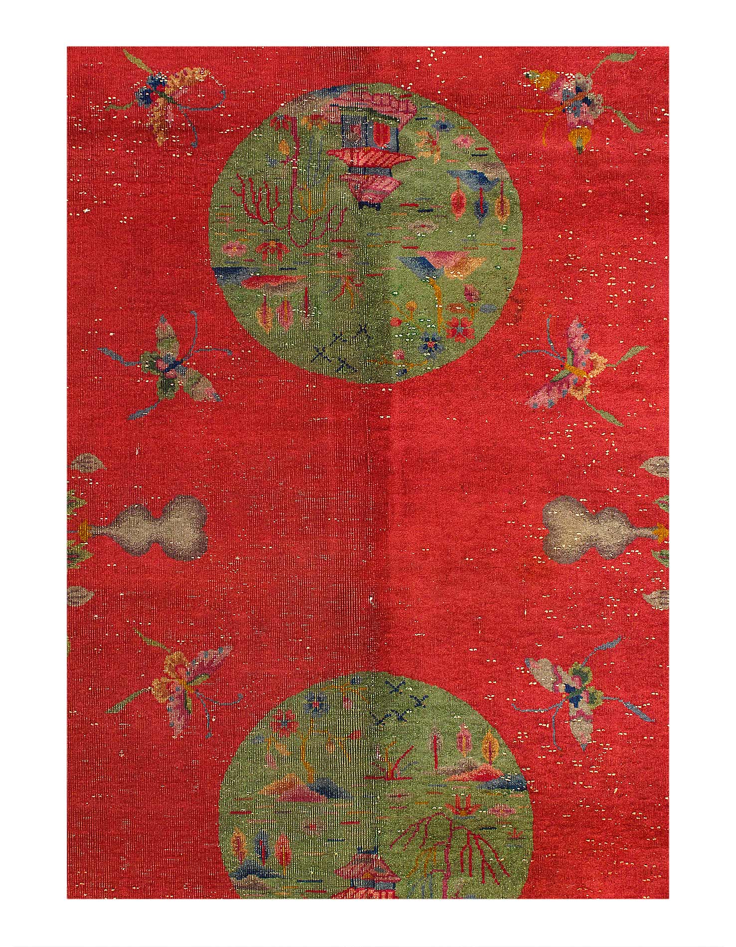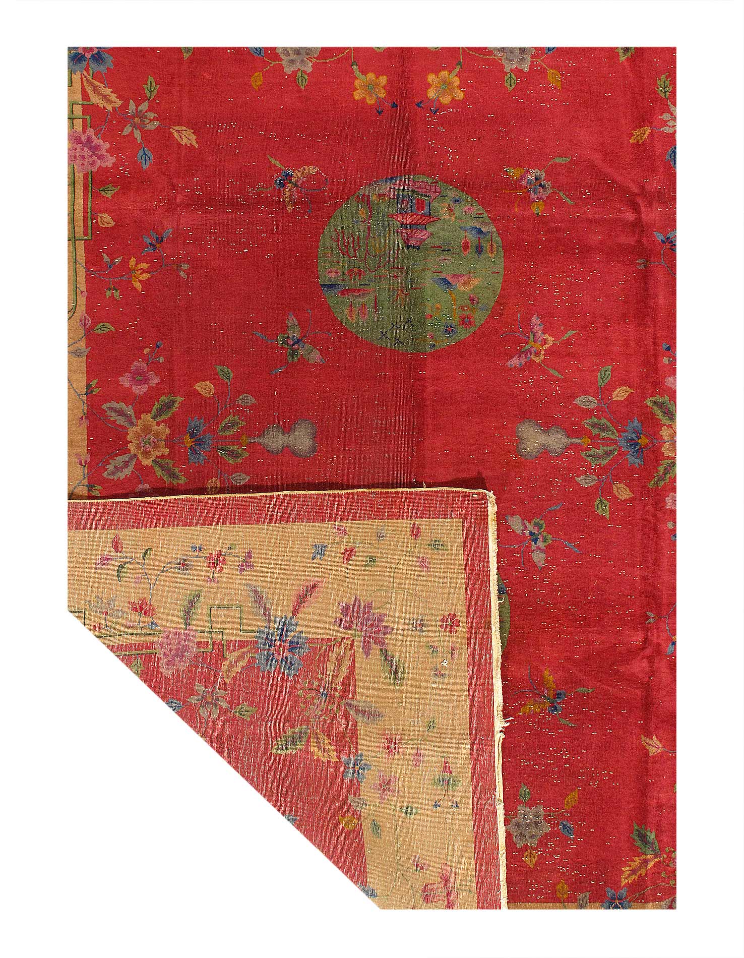 Chinese Deco Rug, Origin: China, Circa: Early 20th Century – Here is an exciting and appealing antique Oriental carpet – an antique Art Deco rug that was designed and woven in China during the early years of the twentieth century. Heavily informed by the aesthetic inclinations of the Art Deco period, this unique carpet is a compelling and thought-provoking example. A scalloped border of Beige encloses a Gold /Red sand field on this exquisitely subtle and restrained antique Chinese Art Deco. At first the field appears empty or open, but it is actually covered by a tone-on-tone design of scrolls and cloud-bands emanating inward from the outer edges. In their sinuous rhythms they echo the scalloped forms of the border and continue its visual effects across the carpet in a more subdued manner. This carpet testifies to the masterful design sensibilities of Chinese weavers as they made the transition into the modern world. The Art Deco movement had an outside influence on the world of art and design, and some of the most important qualities and characteristics of that movement may be found in this fine rug.