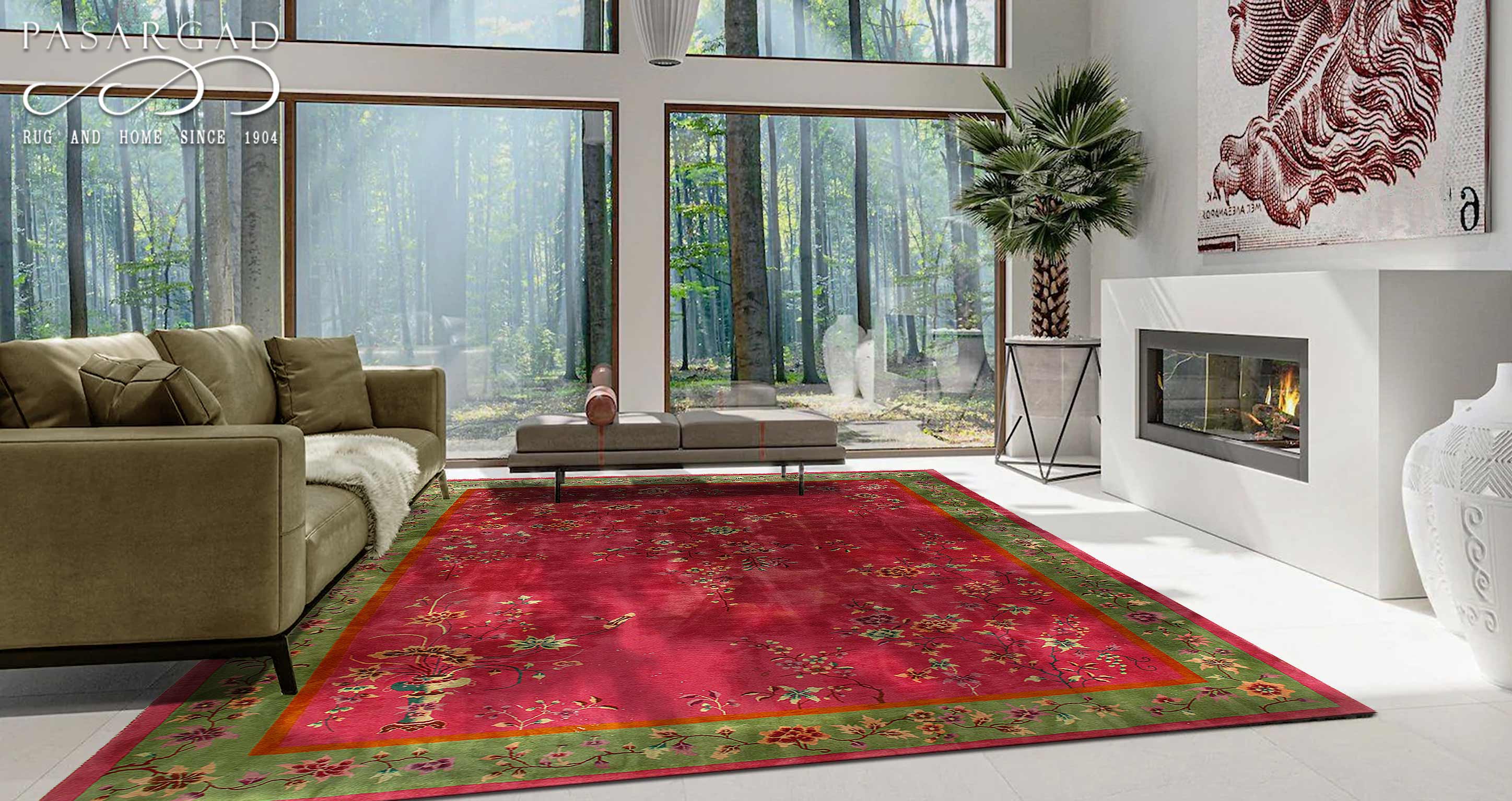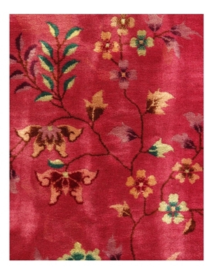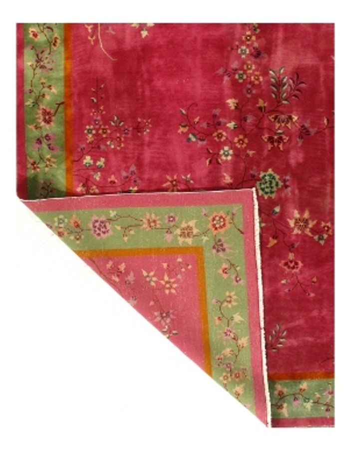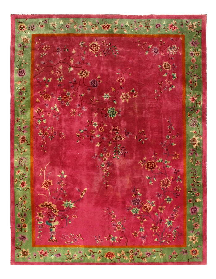 Chinese Deco Rug, Origin: China, Circa: Early 20th Century – Here is an exciting and appealing antique Oriental carpet – an antique Art Deco rug that was designed and woven in China during the early years of the twentieth century. Heavily informed by the aesthetic inclinations of the Art Deco period, this unique carpet is a compelling and thought-provoking example. A scalloped border of olive green encloses a rose/ rust sand field on this exquisitely subtle and restrained antique Chinese Art Deco. At first the field appears empty or open, but it is actually covered by a tone-on-tone design of scrolls and cloud-bands emanating inward from the outer edges. In their sinuous rhythms they echo the scalloped forms of the border and continue its visual effects across the carpet in a more subdued manner. This carpet testifies to the masterful design sensibilities of Chinese weavers as they made the transition into the modern world. The Art Deco movement had an outside influence on the world of art and design, and some of the most important qualities and characteristics of that movement may be found in this fine rug.