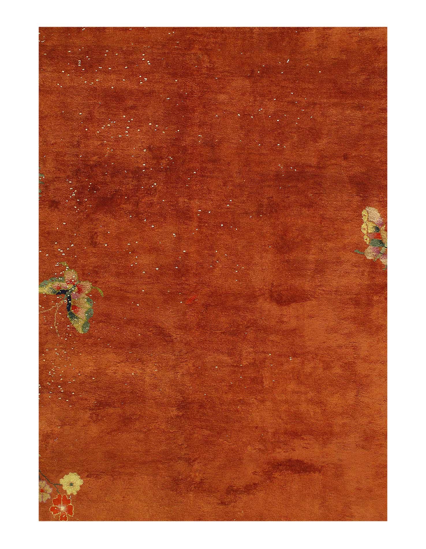 Chinese Deco Rug, Origin: China, Circa: Early 20th Century – Here is an exciting and appealing antique Oriental carpet – an antique Art Deco rug that was designed and woven in China during the early years of the twentieth century. Heavily informed by the aesthetic inclinations of the Art Deco period, this unique carpet is a compelling and thought-provoking example. A scalloped border of Blue encloses a Rose / Rust sand field on this exquisitely subtle and restrained antique Chinese Art Deco. At first the field appears empty or open, but it is actually covered by a tone-on-tone design of scrolls and cloud-bands emanating inward from the outer edges. In their sinuous rhythms they echo the scalloped forms of the border and continue its visual effects across the carpet in a more subdued manner. This carpet testifies to the masterful design sensibilities of Chinese weavers as they made the transition into the modern world. The Art Deco movement had an outside influence on the world of art and design, and some of the most important qualities and characteristics of that movement may be found in this fine rug.