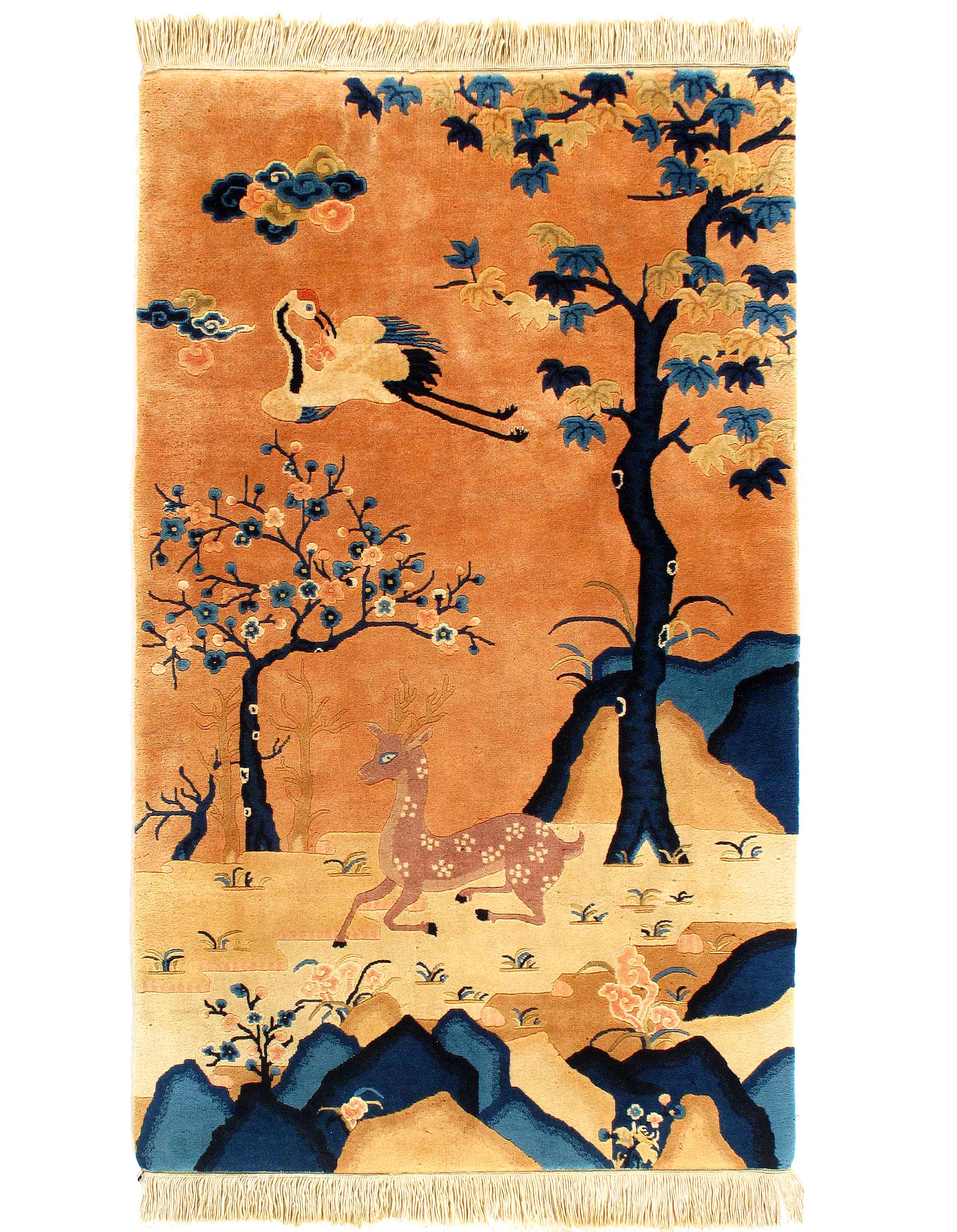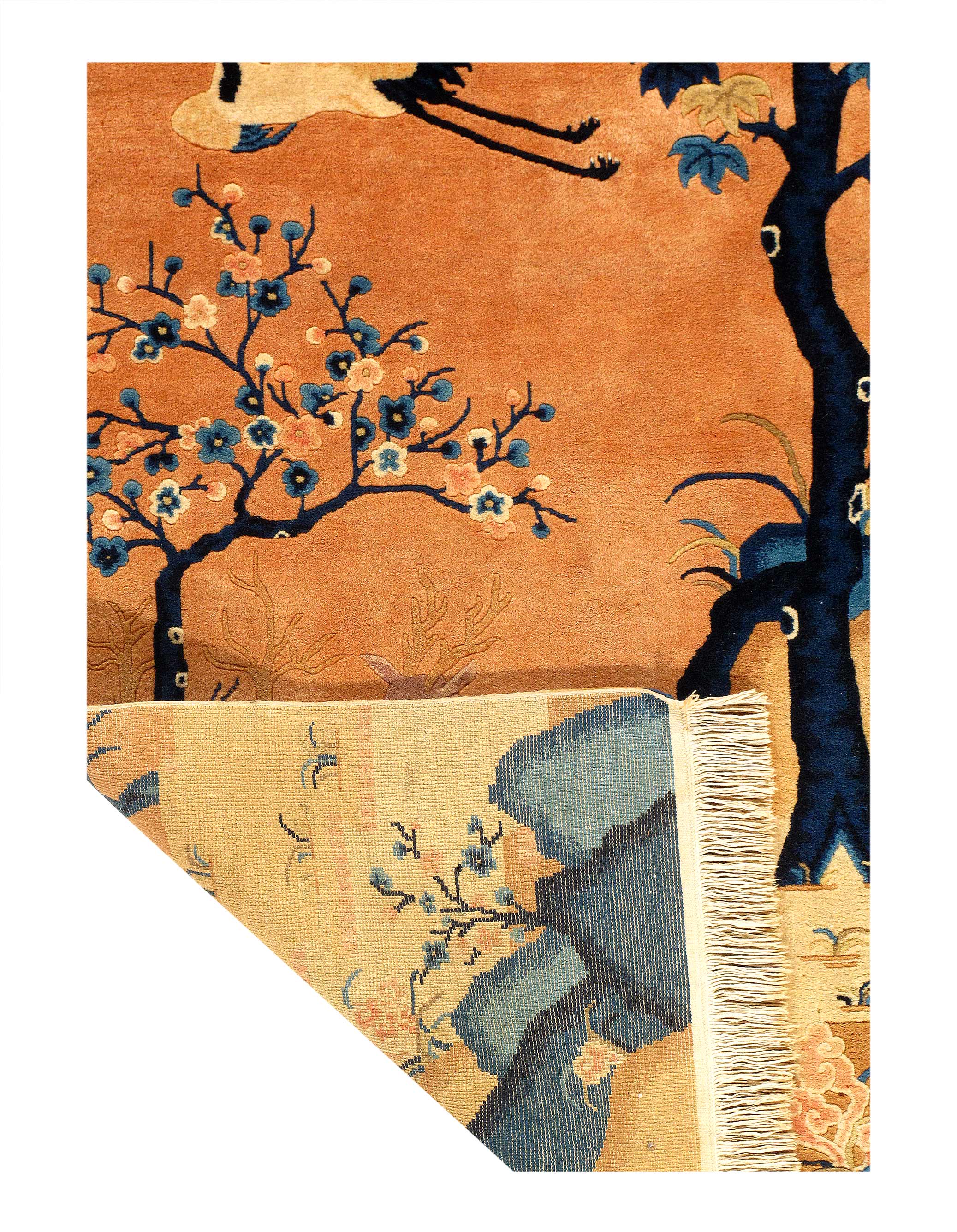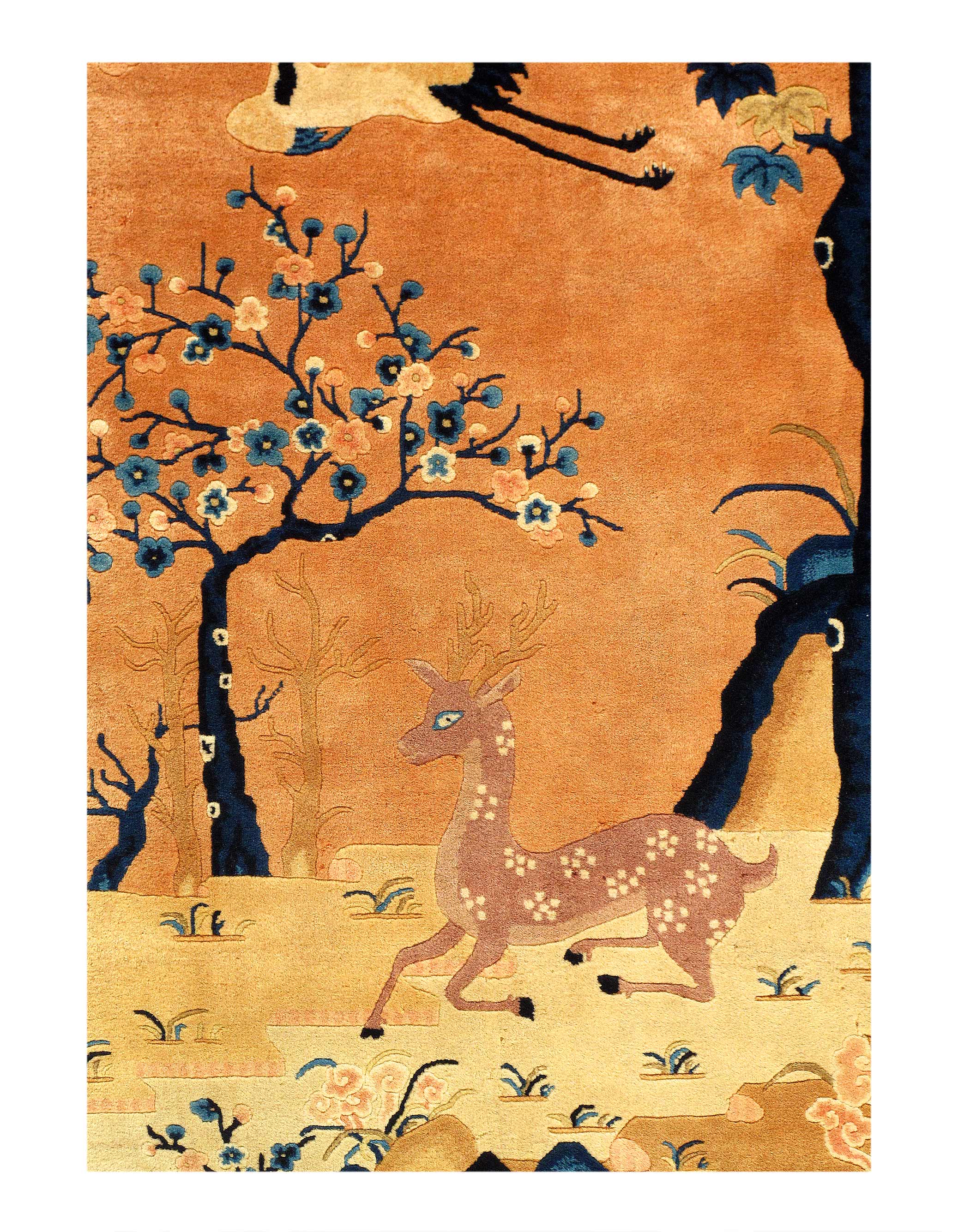 Antique Chinese Deco Rug, Origin: China, Circa: Early 20th Century – Here is an exciting and appealing antique Oriental carpet – an antique Art Deco scenery rug that was designed and woven in China during the early years of the twentieth century. Heavily informed by the aesthetic inclinations of the Art Deco period, this unique carpet is a compelling and thought-provoking example. A scalloped Beige encloses a Navy Blue sand field on this exquisitely subtle and restrained antique Chinese Art Deco.covered by a design of scenery and cloud-bands emanating inward from the outer edges. In their sinuous rhythms they echo the scalloped forms of the border and continue its visual effects across the carpet in a more subdued manner. This carpet testifies to the masterful design sensibilities of Chinese weavers as they made the transition into the modern world. The Art Deco movement had an outside influence on the world of art and design, and some of the most important qualities and characteristics of that movement may be found in this fine small rug.