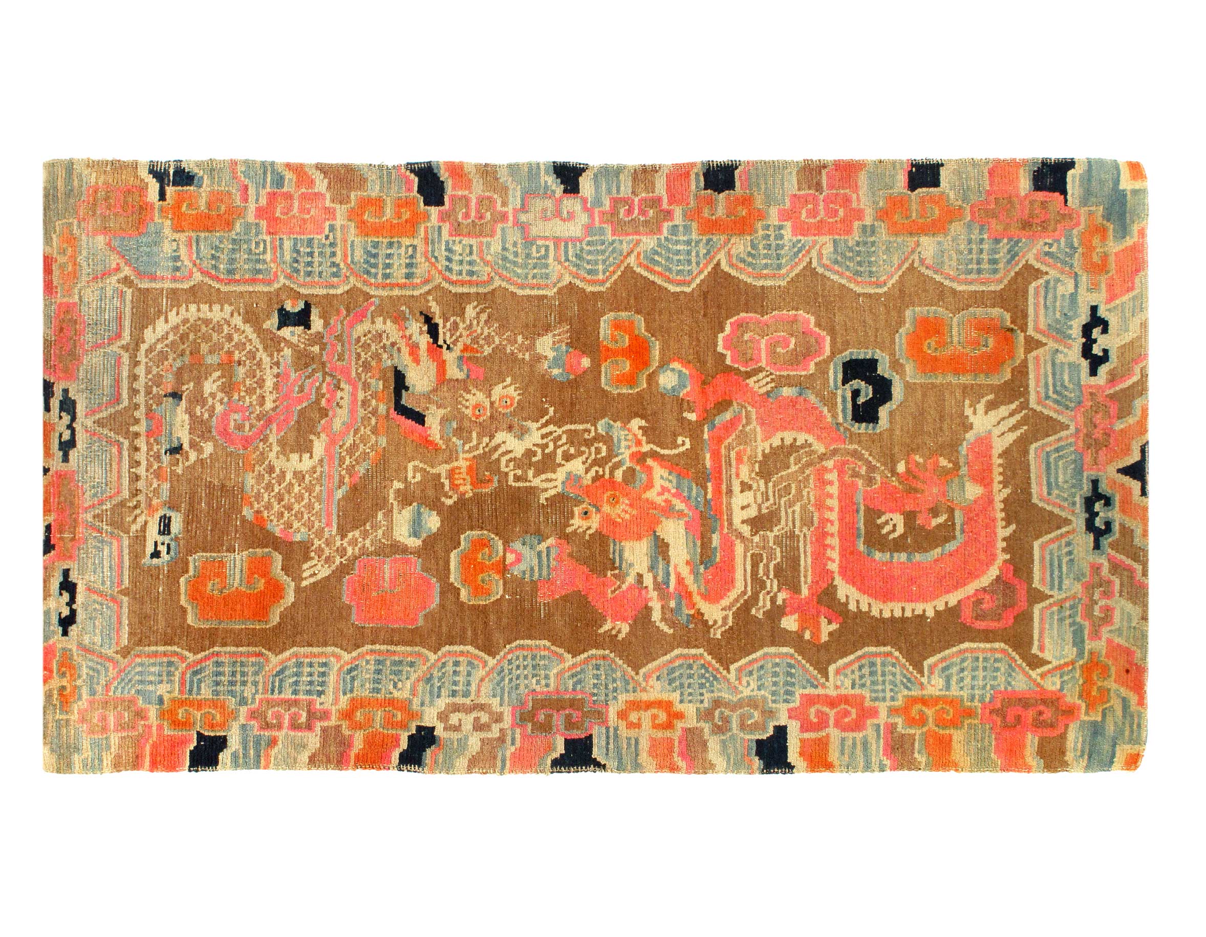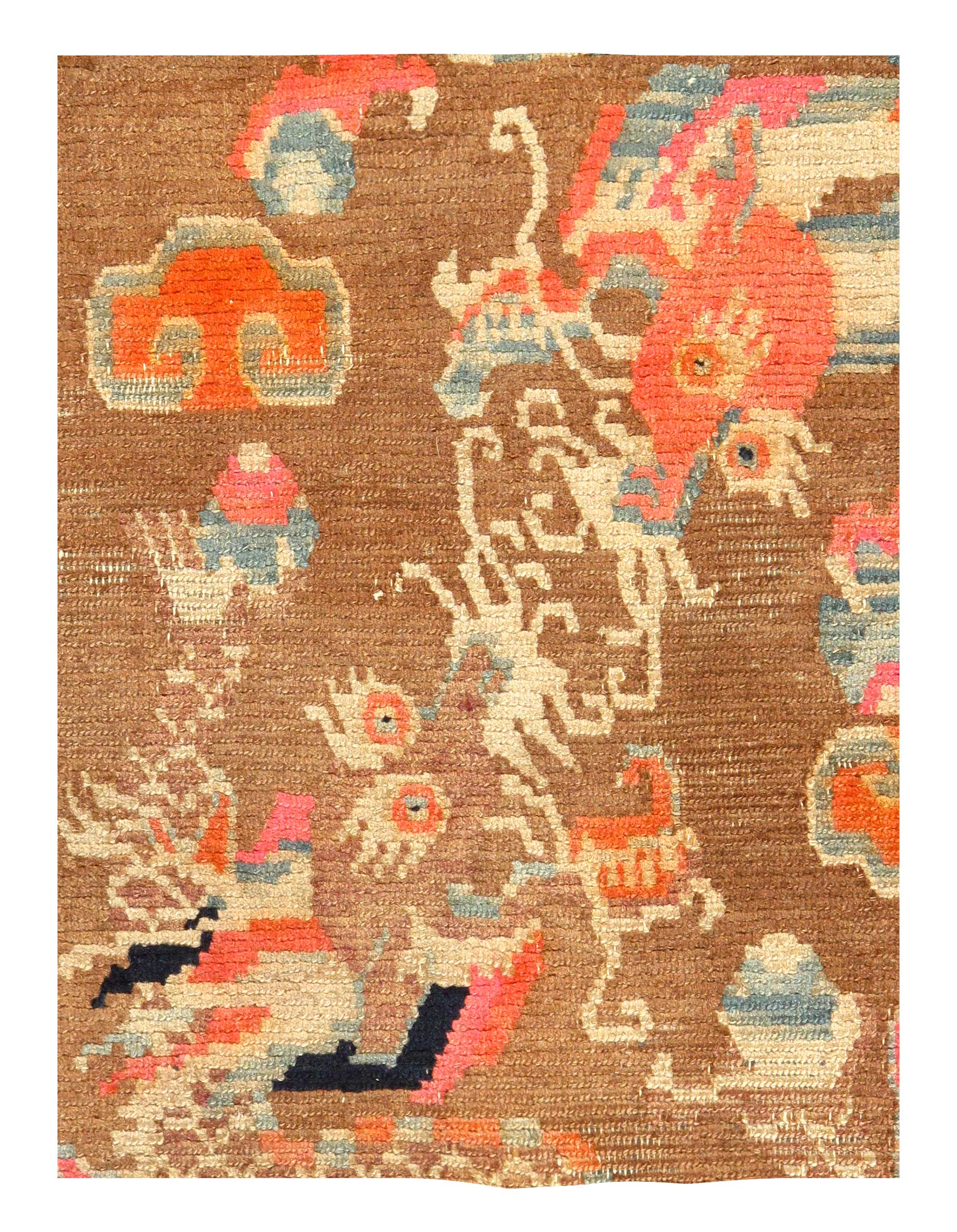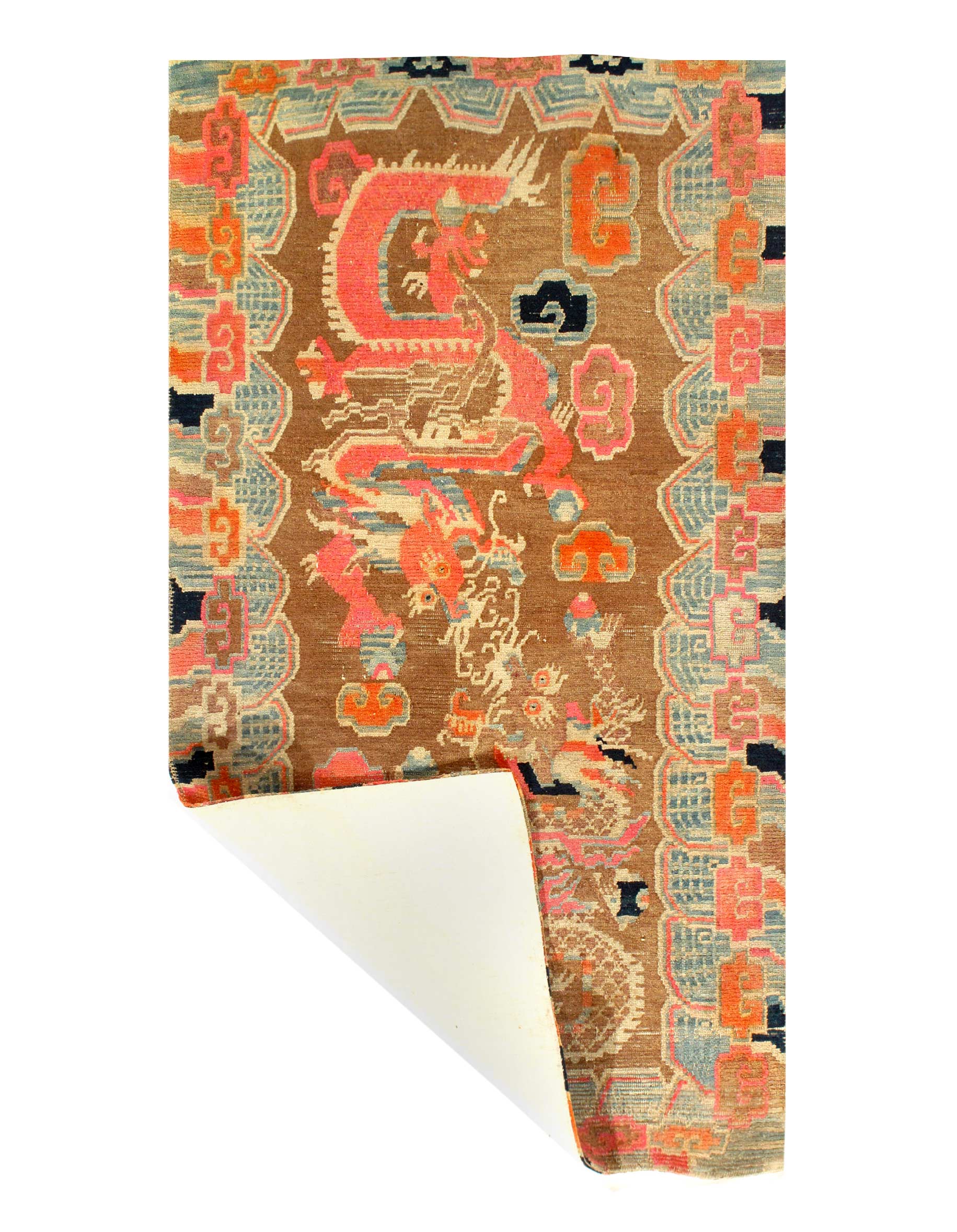 Beautiful Antique Dragon Chinese Carpet, Country of Origin: China, Circa Date: 1920’s — This beautiful Chinese carpet breaks from the tradition of flowing lines and simplistic colors that many other Chinese rugs bear. The first border around the piece features an extensive series of Brown ,blue, yellow, red that all end in a round puff of a cloud, each connecting with the other to create a smaller border within. At the core of the carpet, against a vermilion background of a sky are a series of twisting dragons of all colors and patterns, gracefully moving as if flying through the air amidst an equally bright collection of clouds.