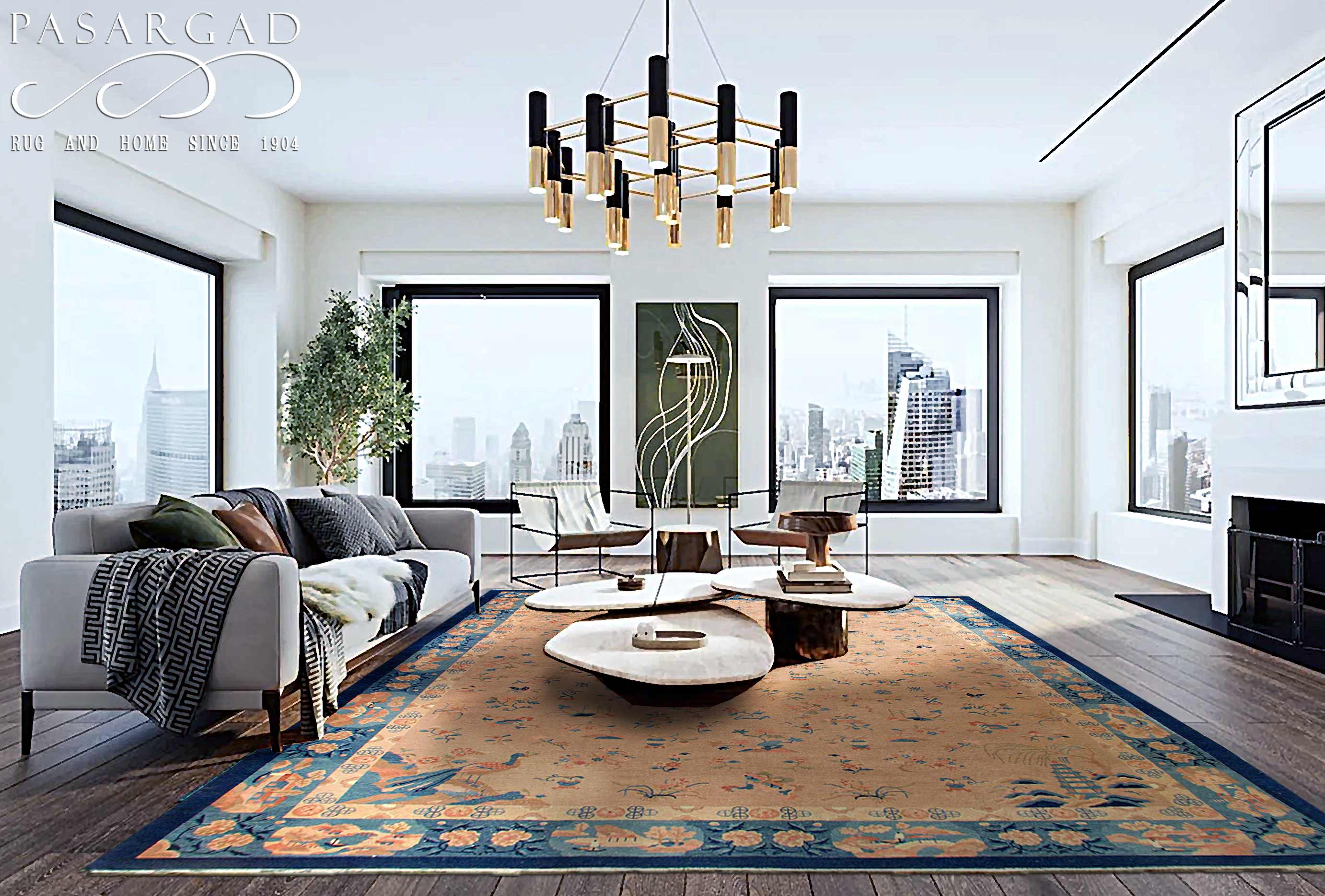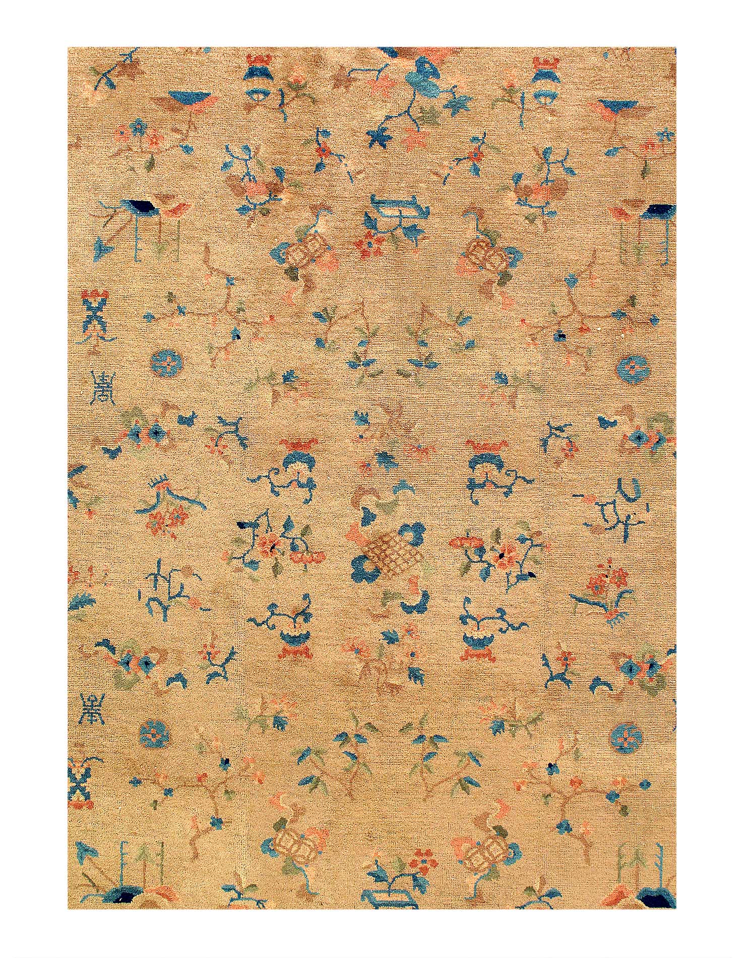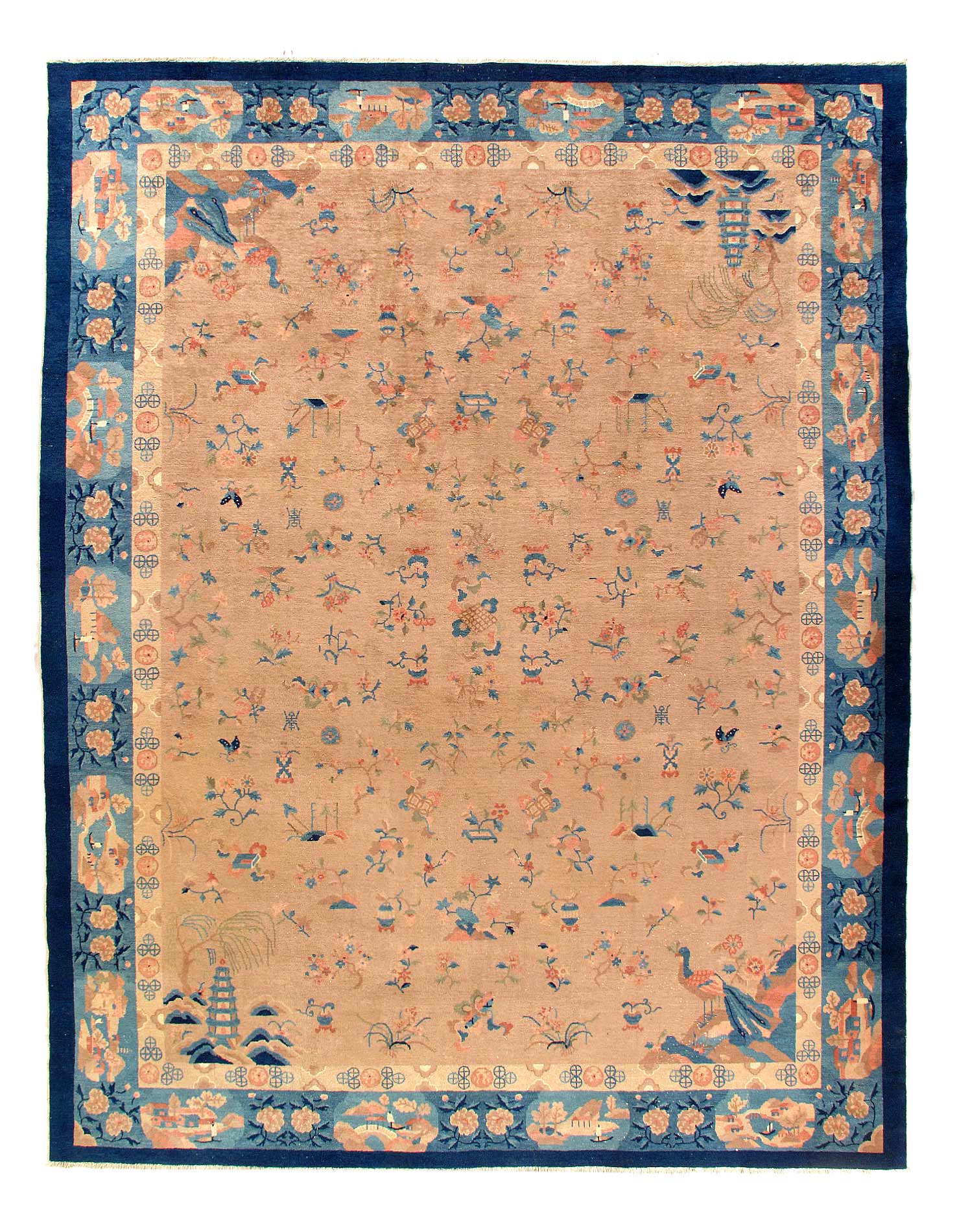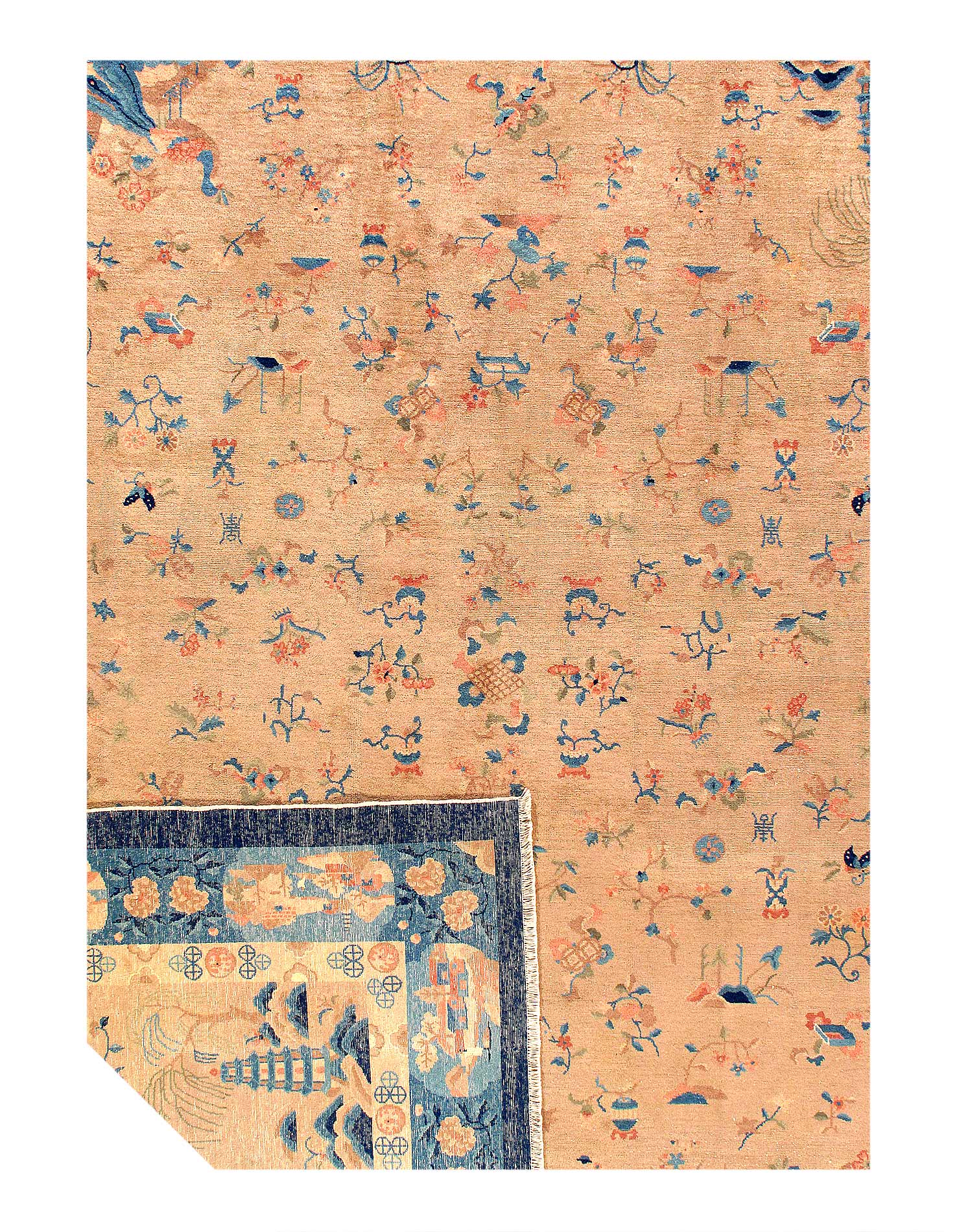 Chinese Deco Rug, Origin: China, Circa: Early 20th Century – Here is an exciting and appealing antique Oriental carpet – an antique Art Deco rug that was designed and woven in China during the early years of the twentieth century. Heavily informed by the aesthetic inclinations of the Art Deco period, this unique carpet is a compelling and thought-provoking example. A scalloped border of Brown encloses a Gold /Blue sand field on this exquisitely subtle and restrained antique Chinese Art Deco. At first the field appears empty or open, but it is actually covered by a tone-on-tone design of scrolls and cloud-bands emanating inward from the outer edges. In their sinuous rhythms they echo the scalloped forms of the border and continue its visual effects across the carpet in a more subdued manner. This carpet testifies to the masterful design sensibilities of Chinese weavers as they made the transition into the modern world. The Art Deco movement had an outside influence on the world of art and design, and some of the most important qualities and characteristics of that movement may be found in this fine rug.