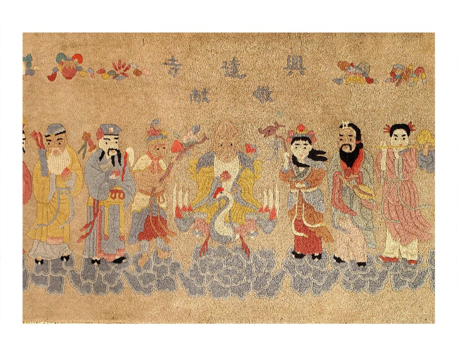 This is a Chinese rug featuring the Immortals (Ba Xian), who are legendary figures in Taoist mythology.