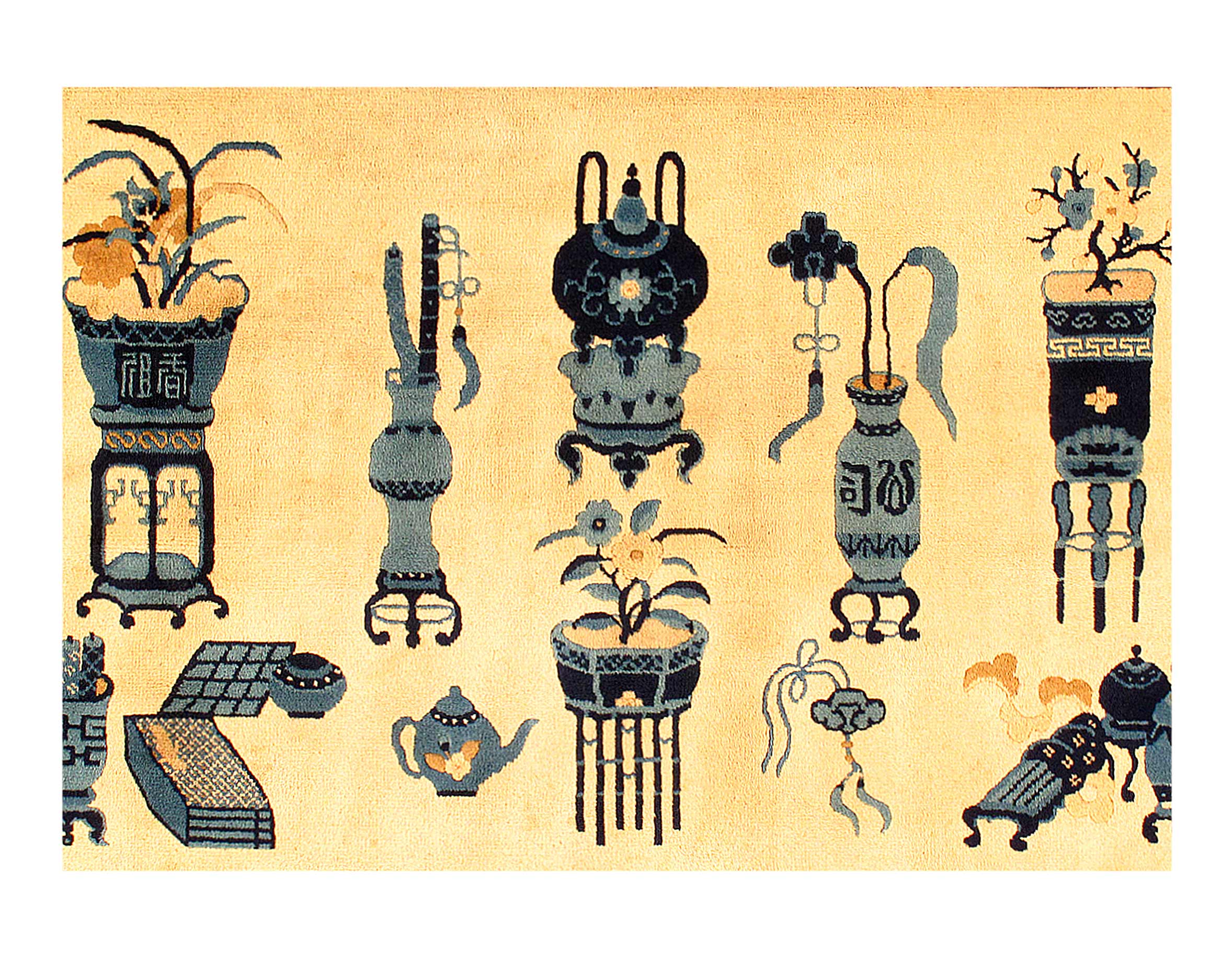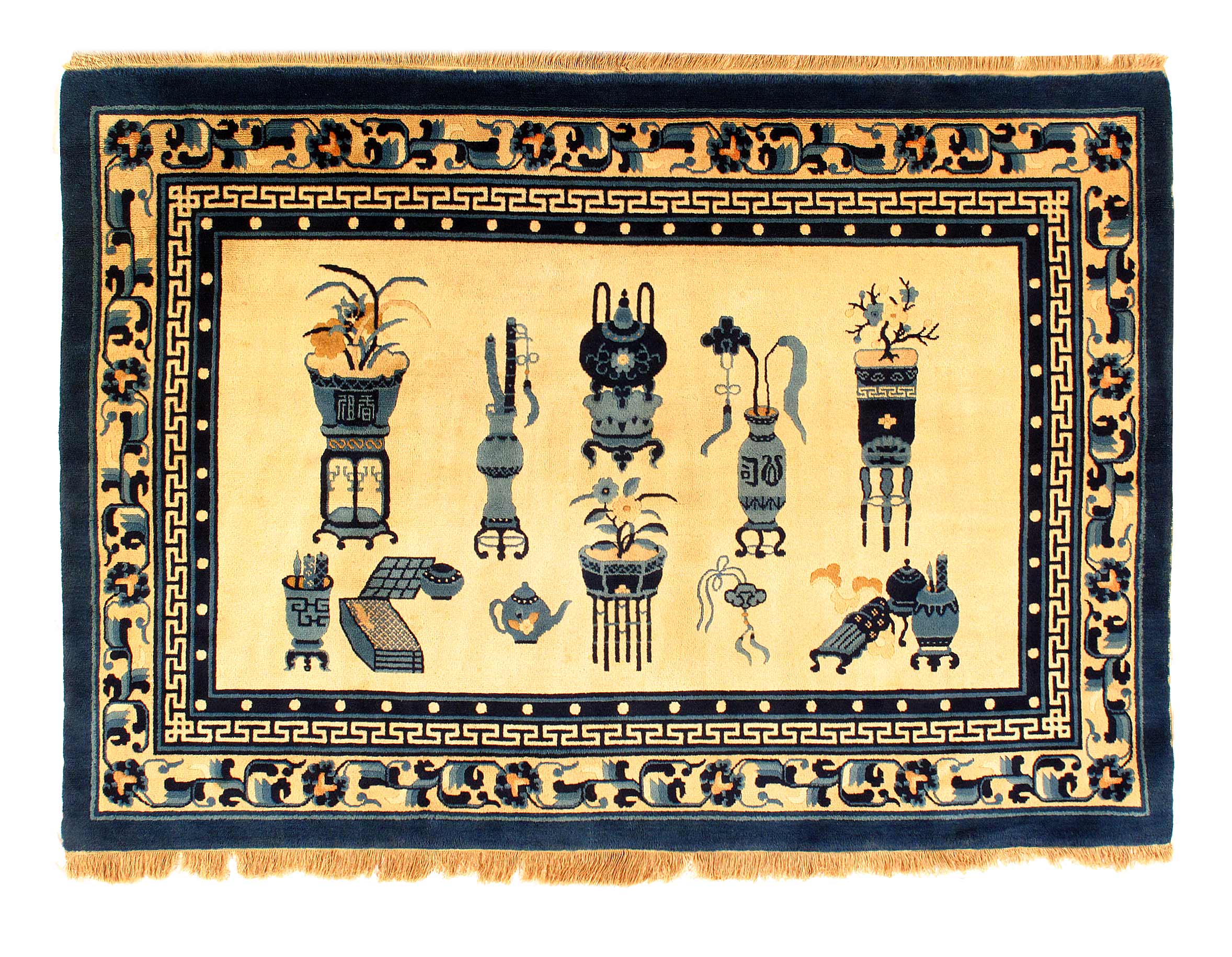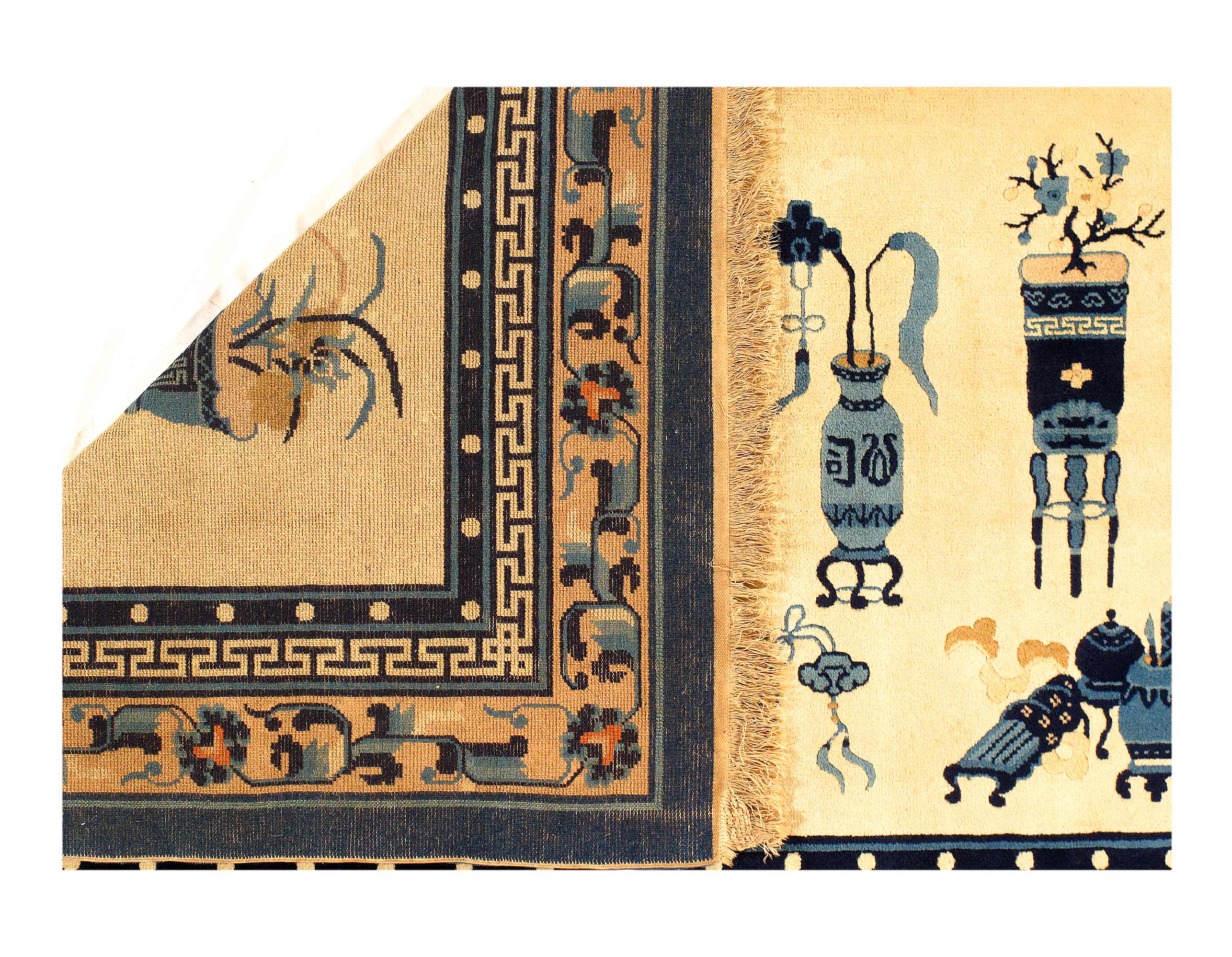 Beautiful Ivory Background Antique Peking Carpet, Country of Origin: China, Circa Date: 1930 – which features a breathtaking Peking carpet design is elegant in its simplicity, establishing an understated charm that only adds to its visual value. It is comprised of earthy colors, made even more inviting and comfortable by the presence of several warm elements throughout the rug. A single deep Blue border surrounds the elements within, creating a grounding frame that conveys luxury and style. Within this frame are several rectangular shapes, light in color and arranged irregularly around a darker centerpiece. This antique rug is a Ivory that connects with the outermost layer, reminiscent of a forest canopy overlooking the loamy earth. Three arrangements of horizontal stripes are present in the composition.