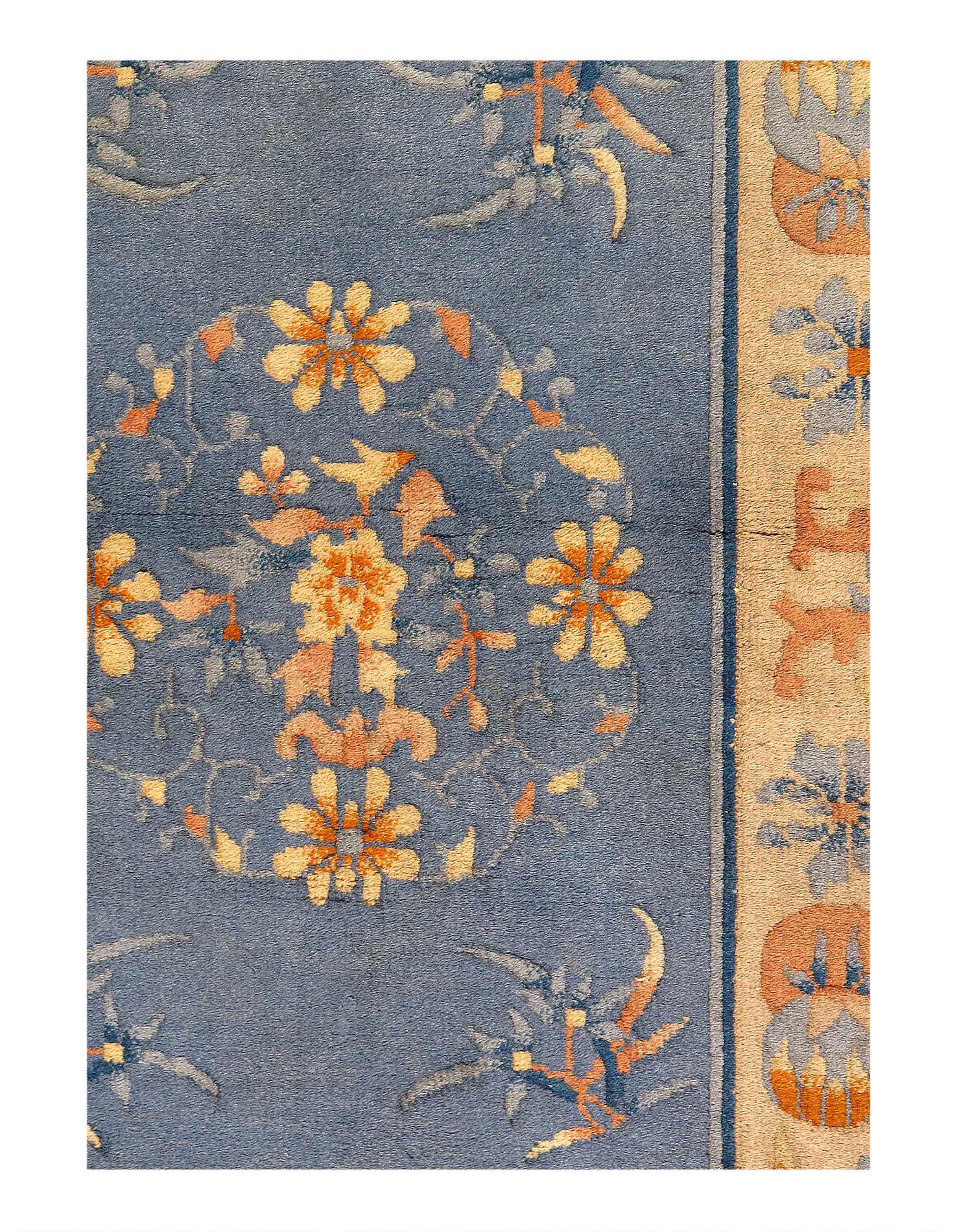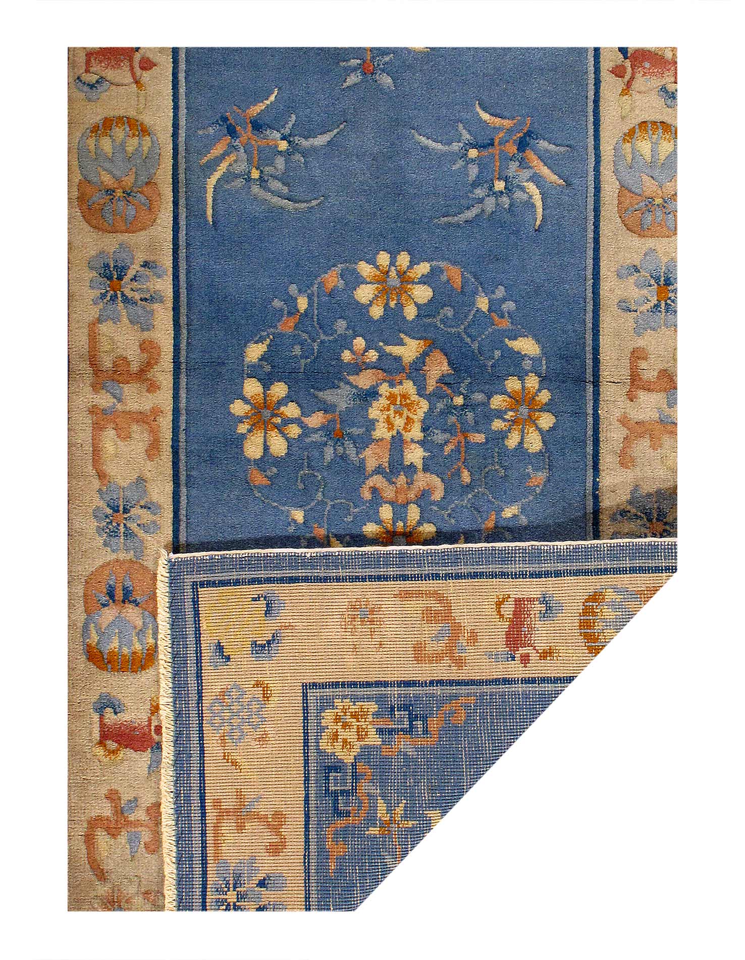 Beautiful antique Pecking Chinese hand-knotted wool rug with a Beige field. This Chinese rug has a Navy blue frame and Light Blue accents layout in a gorgeous Chinese floral design.