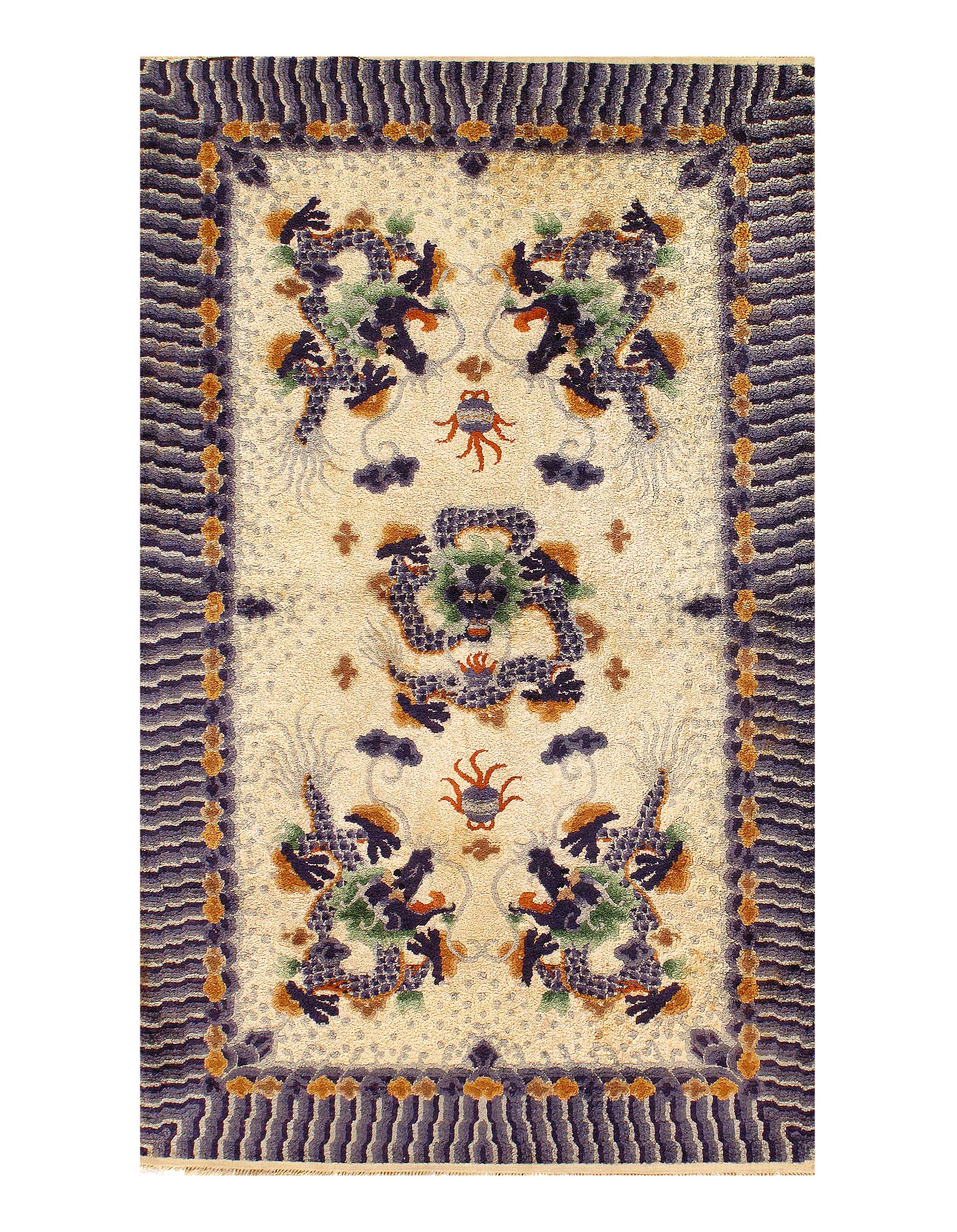 Antique Dragon Design Chinese Peking silk Rug, Country of Origin: China, Circa Date: Early 20th Century β This bold Chinese rug begins with a border comprised of cream vivid blue background. Floral accents against small gold fields provide a gentle contrast along the length of the frame. The stunning golden fluidity of the dragons offsets the austere brick-like background. This antique dragon design Chinese Peking design rug features exquisite Blue dragons, symbols of luck and wealth, circle a pale Blue medallion decorated with rich blue dragons. This bold juxtaposition of the modern and traditional in this antique dragon design Chinese Peking rug compose a striking and exotic artistic statement# D11291