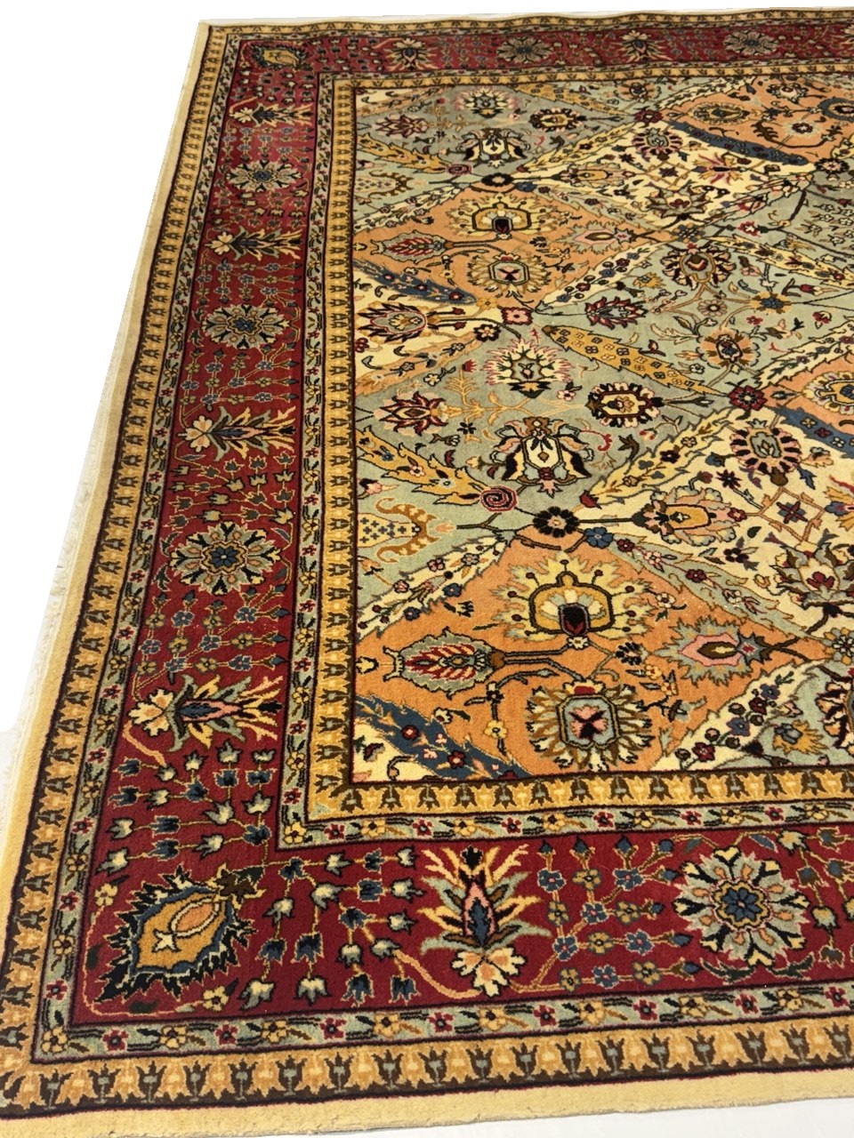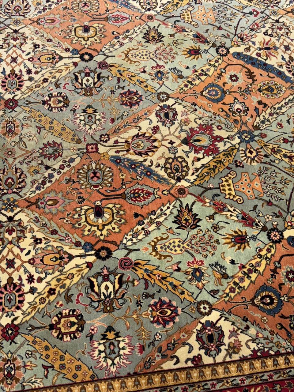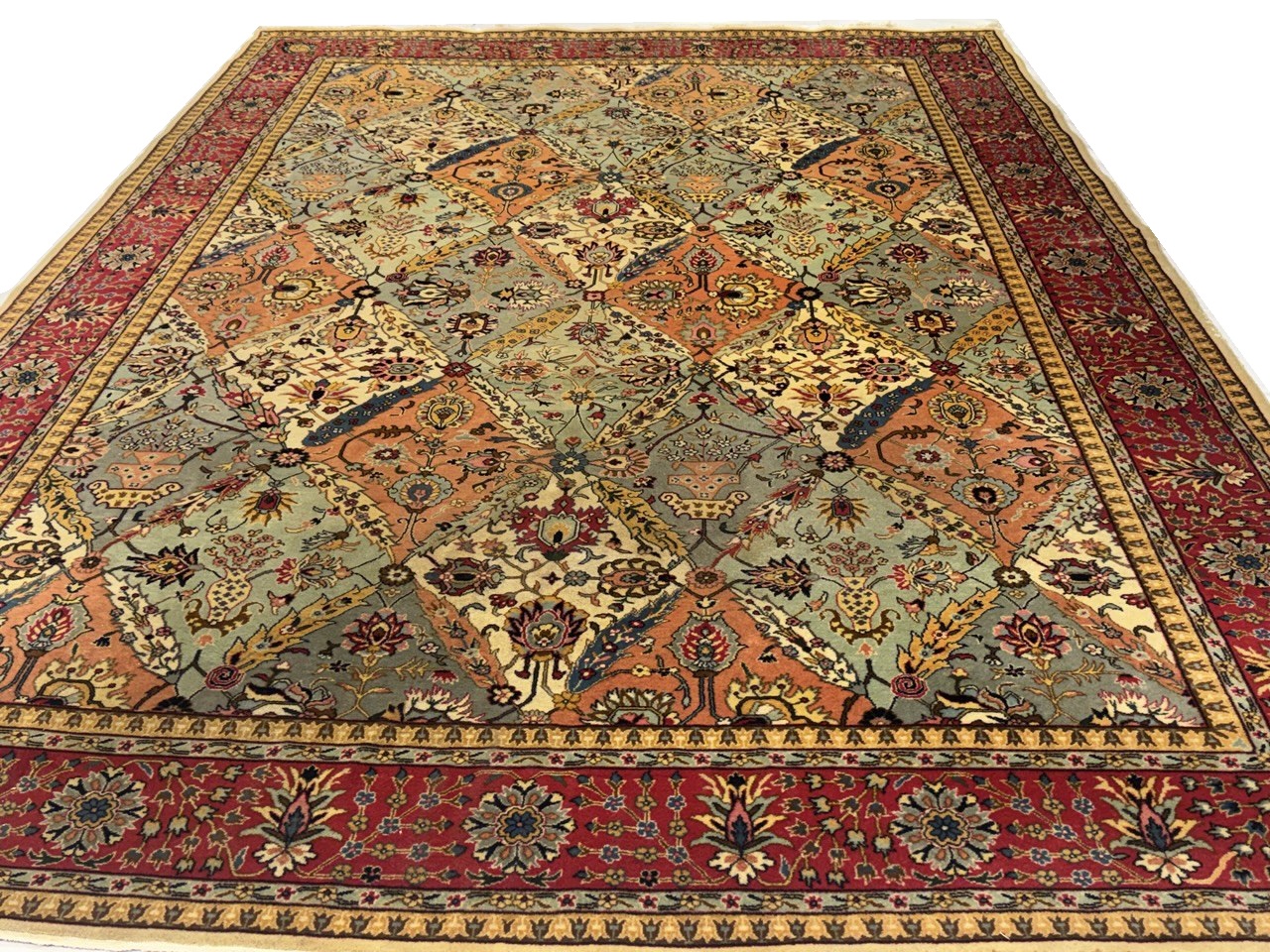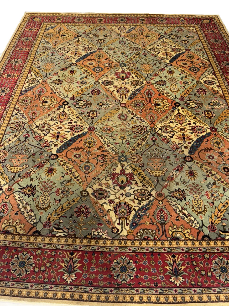 Magnificent Garden Design Room Size Antique Persian Tabriz Rug, Country of Origin / Rug Type: Persian Rug, Circa Date: 1920 β This beautiful antique rug is an excellent example of why Tabriz remained a Persian rug making center that was known for its exquisite artistry for many hundreds of years. This antique Persian Tabriz rug dates back to around the 1920βs and features a beautiful rendition of the iconic garden design. The colorful designs of the antique Persian rug present the viewer with glimpses into little garden scenes, as if they were peering at them through a window.