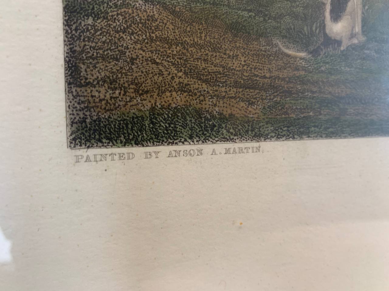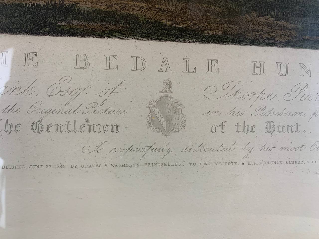 The engraving is titled "The Bedale Hunt ; The piece is dedicated to Mark Milbank, Esquire of Thorpe Perron, Yorkshire. The plate from the original picture in his possession and was presented by "The Gentlemen of the Hunt". Is respectfully dedicated by his most obedient servants, Graves and Warmsley"