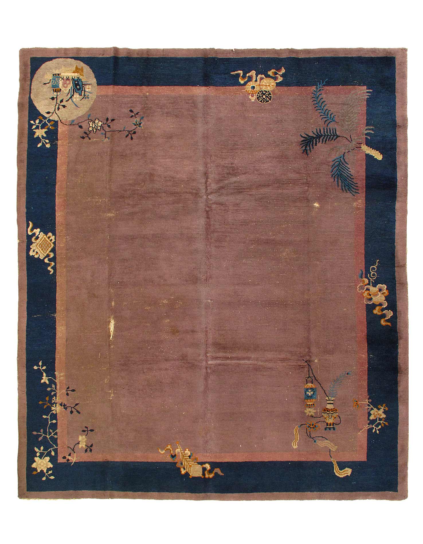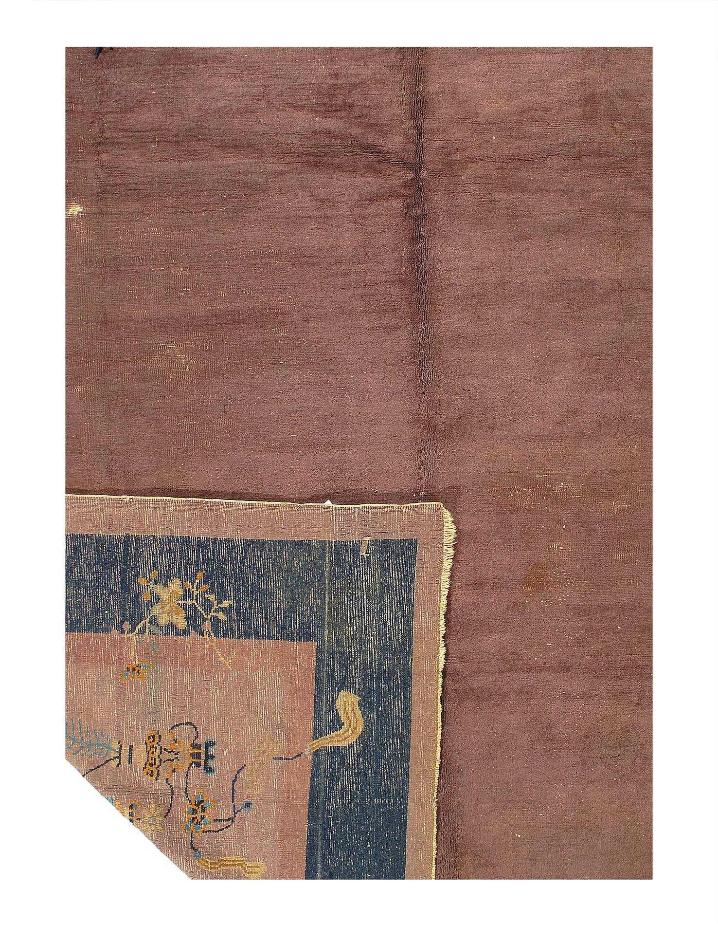 Beautiful antique Art Deco hand-knotted wool rug with a brownfield. This Chinese rug has a Navy blue frame and tan accent color with a gorgeous all-over Chinese floral design