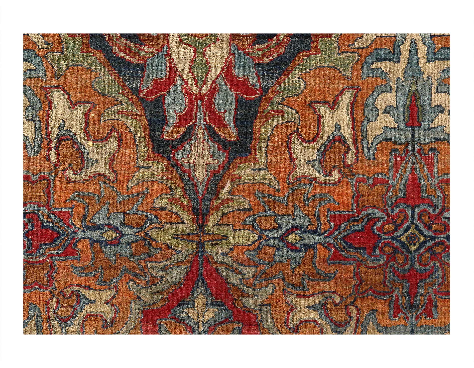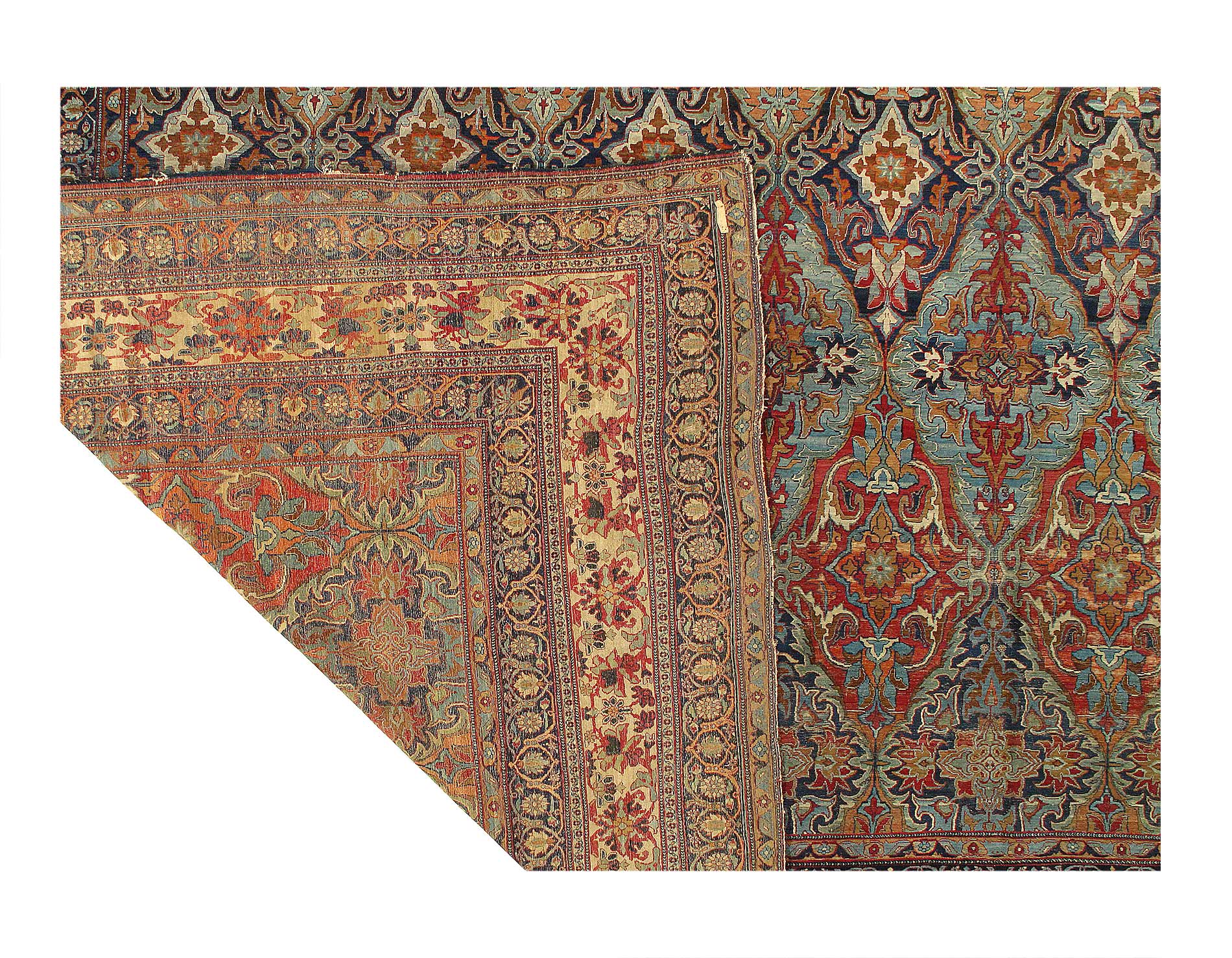 The antique carpet has a feel that is refined and elegant. The all-over design is calm and balanced in both color and design. The artist used layers of complex borders in fine detail to offset the larger scale used in the field design of the carpet. The repeating pattern adds rhythm and cadence to the piece. The artist used several artistic principles to create a piece that is breathtaking and has an almost sublime quality.