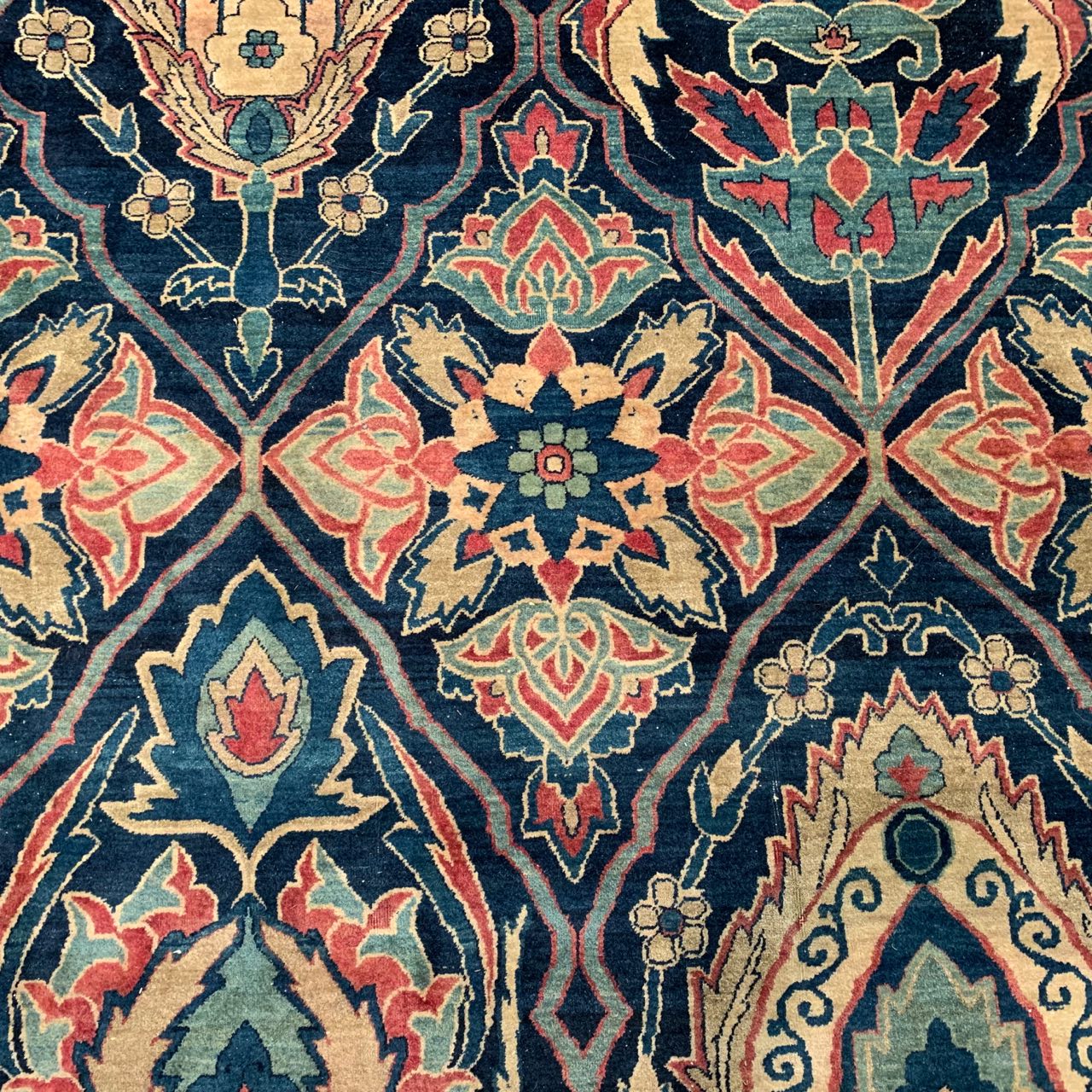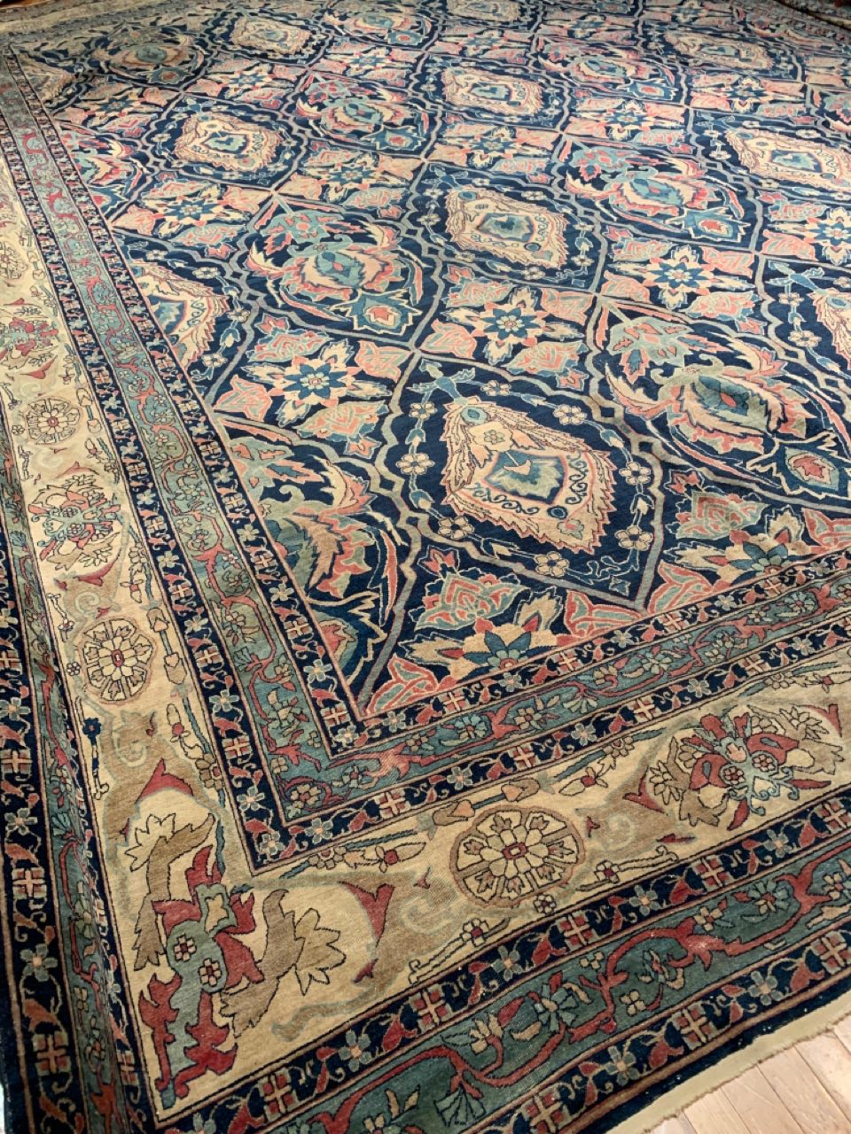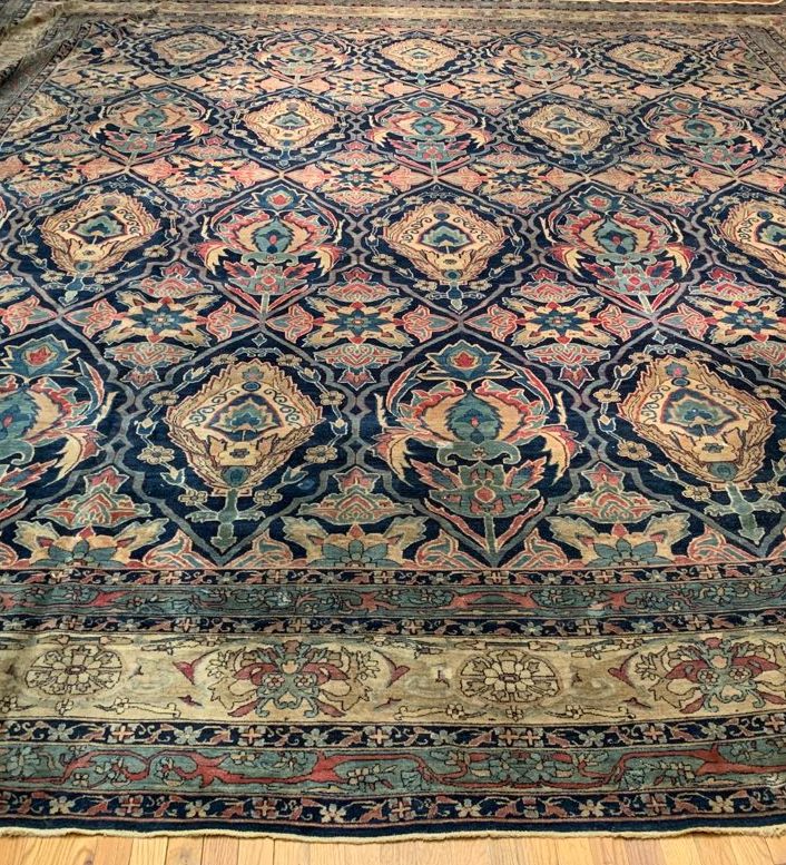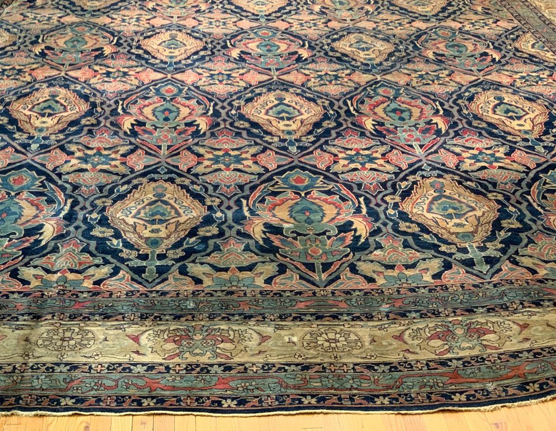 The antique carpet has a feel that is refined and elegant. The all-over design is calm and balanced in both color and design. The artist used layers of complex borders in fine detail to offset the larger scale used in the field design of the carpet. The repeating pattern adds rhythm and cadence to the piece. The artist used several artistic principles to create a piece that is breathtaking and has an almost sublime quality.
