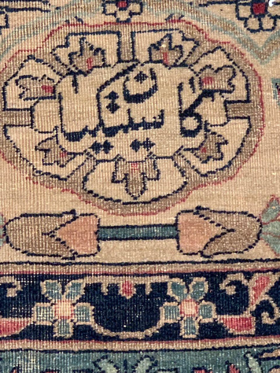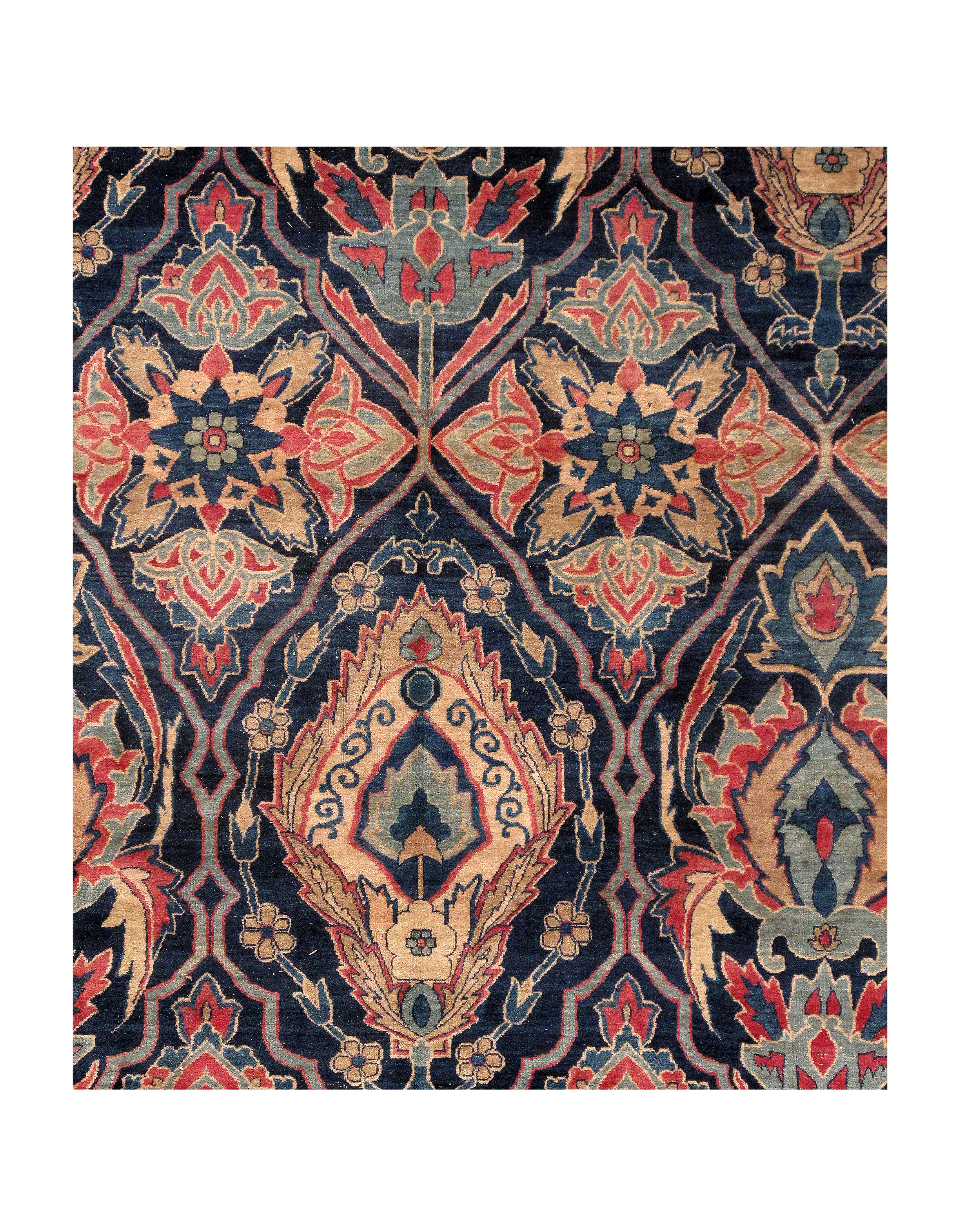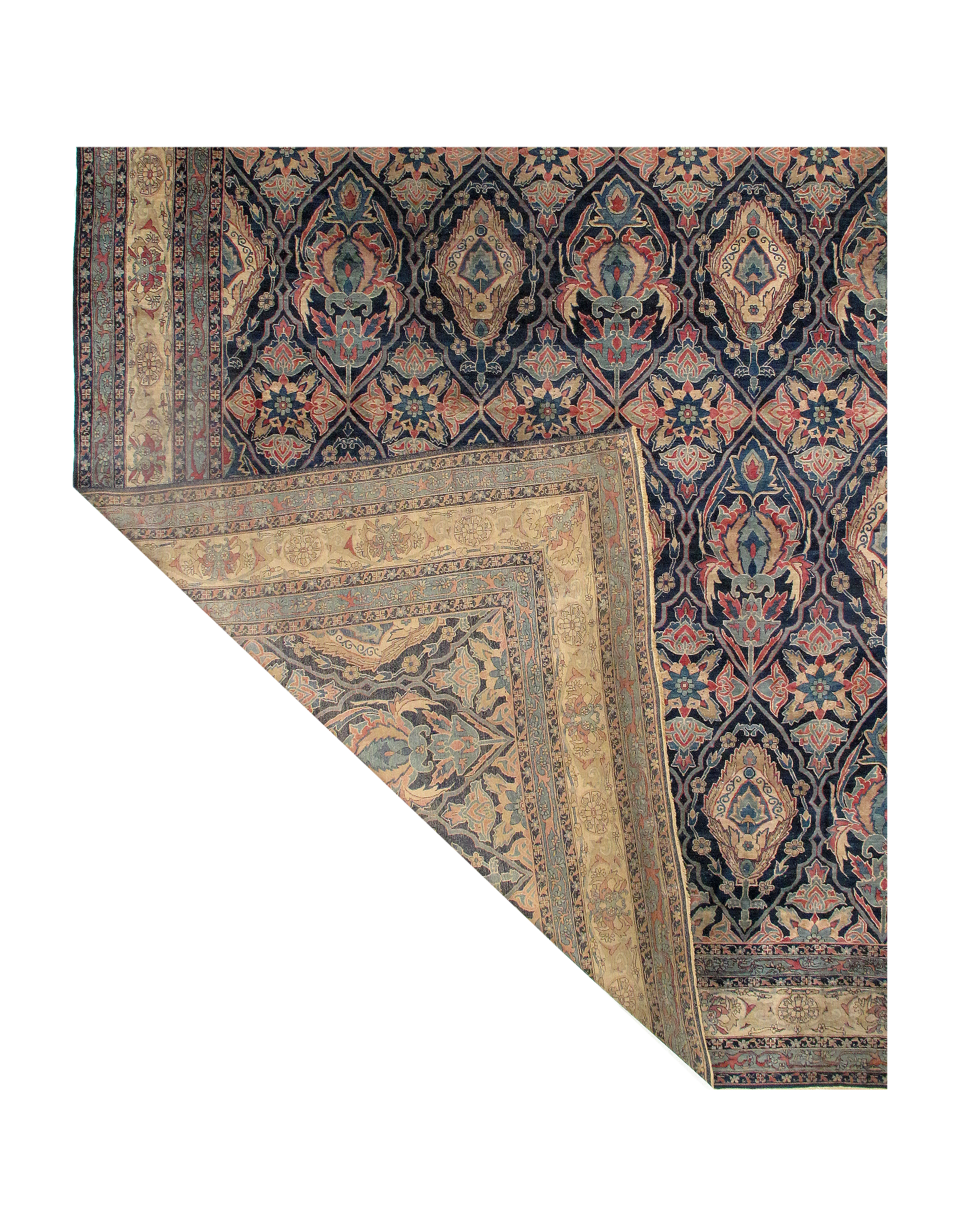The antique carpet has a feel that is refined and elegant. The all-over design is calm and balanced in both color and design. The artist used layers of complex borders in fine detail to offset the larger scale used in the field design of the carpet. The repeating pattern adds rhythm and cadence to the piece. The artist used several artistic principles to create a piece that is breathtaking and has an almost sublime quality.