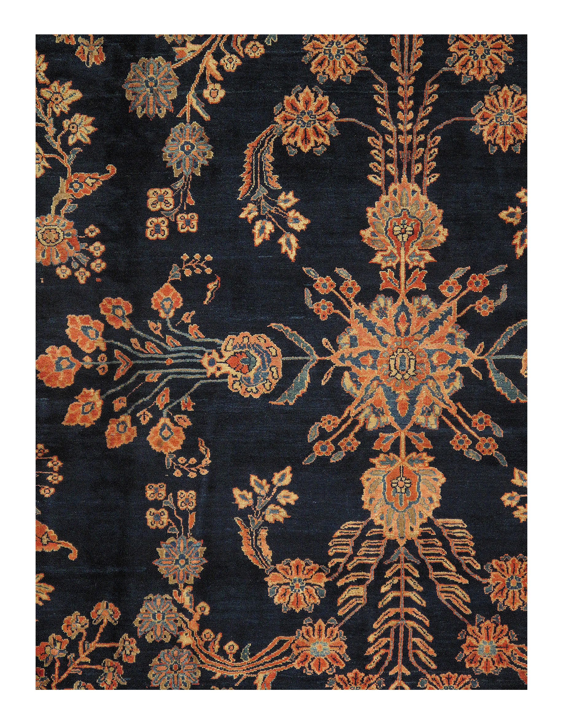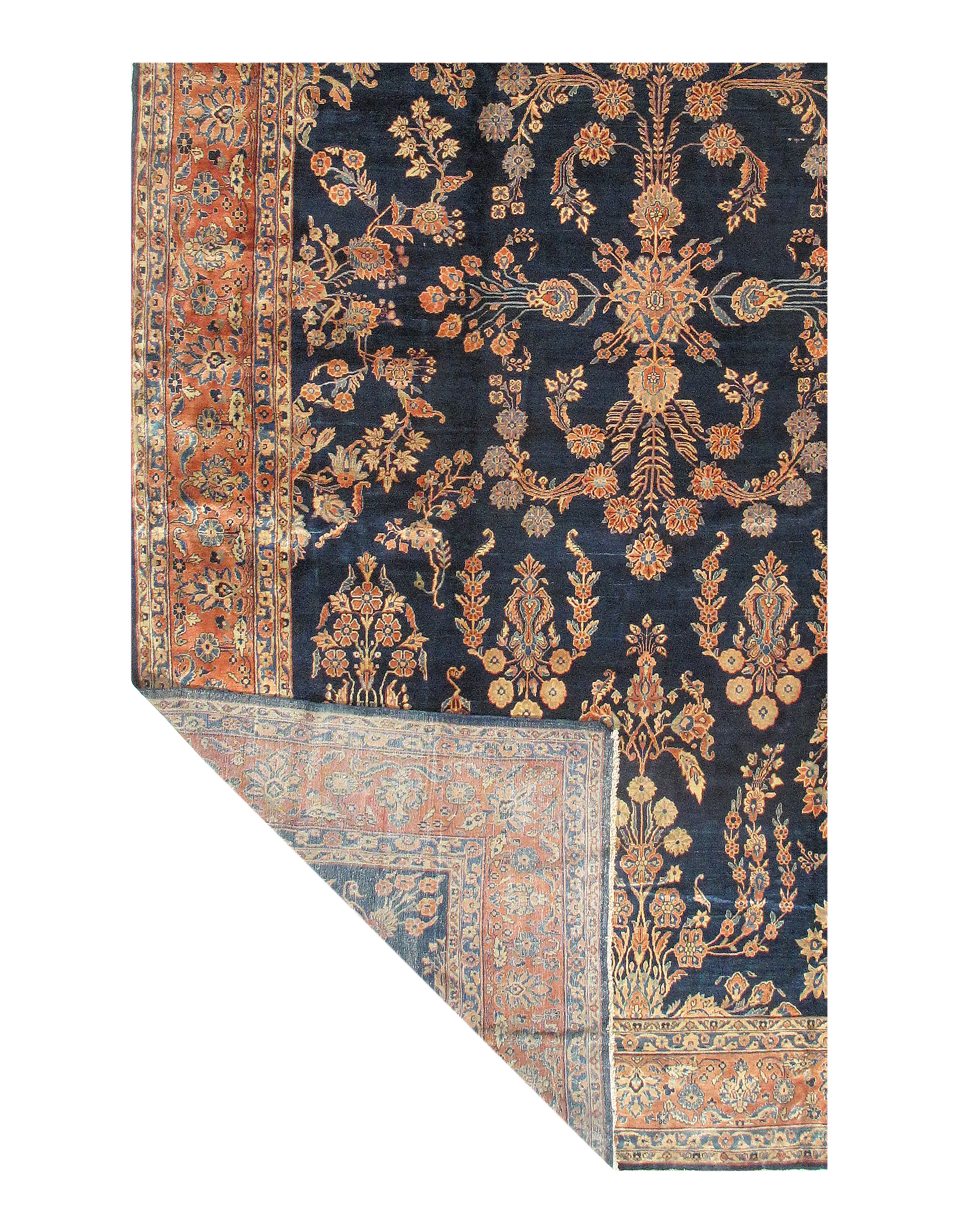 Beautiful Large Size Antique Persian Sarouk Mohajeran Rug, Country of Origin / Rug Type: Persian rug, Circa Date: Late Nineteenth Century – Antique Persian Mohajerans like this are distinguished from other antique Persian Sarouk rugs by their more monumental scale, and their richer, more dramatic coloration. This impressive antique Persian rug features a central rosette spews forth grand design of swaying vines brimming with leaves and flowers in shades of Rust and gold against a Navy blue field. The scale of the border is much smaller, underscoring the grandeur of the field, while also using a terracotta ground to achieve a framing color contrast. The lustrous, almost silken pile emphasizes the golden, jewel-like coloration of the antique rug as a whole.