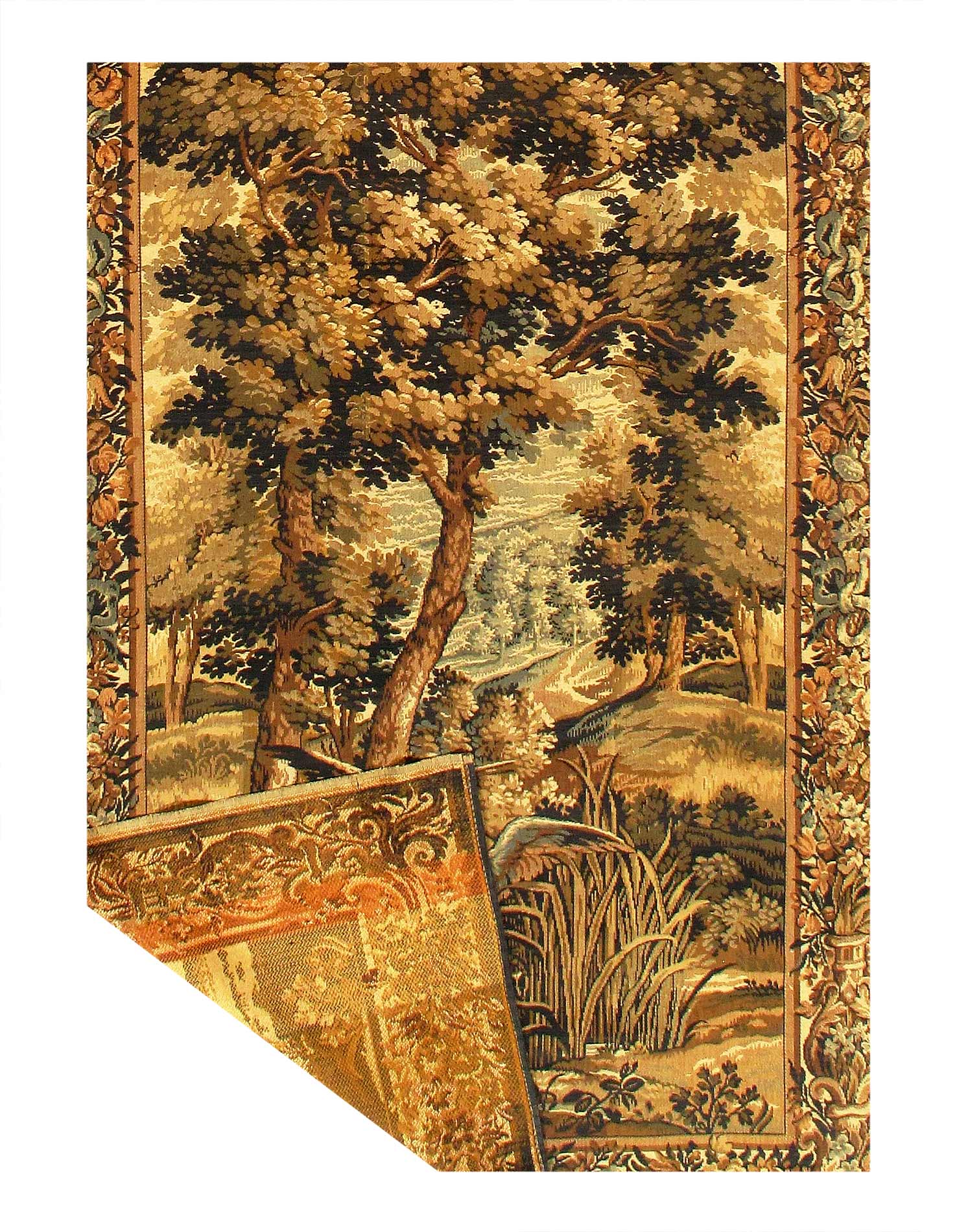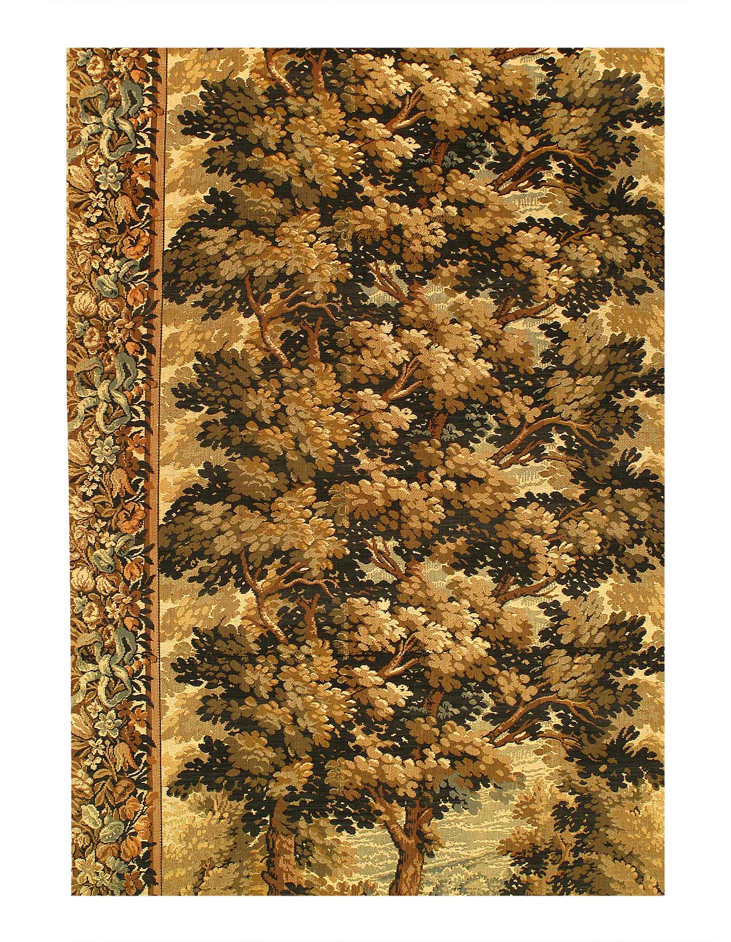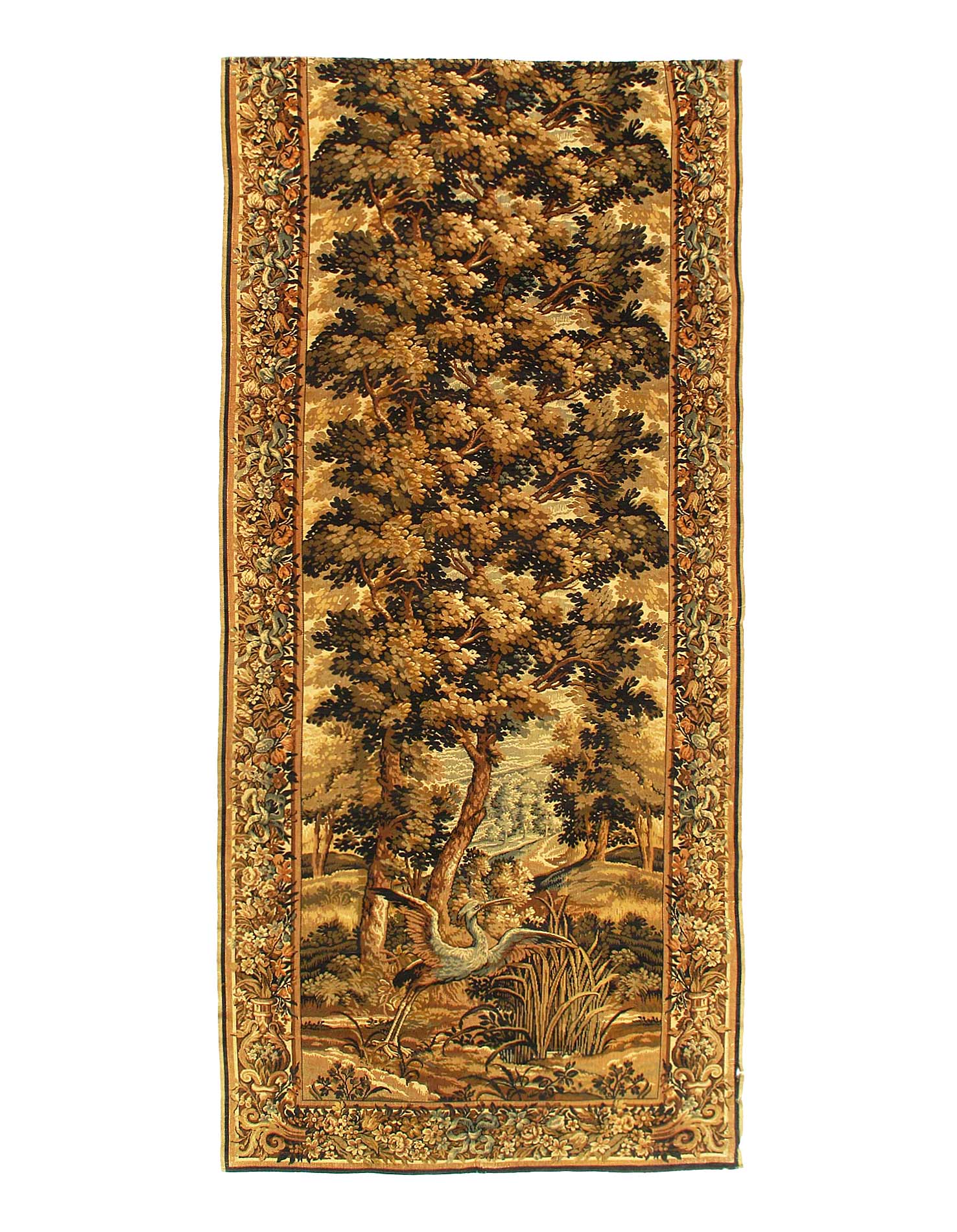 This breathtaking historical antique tapestry rug comes from France, The main colors of this antique tapestry are shades of gold paired with both other warm and cool colors, showing the influences of the classical inspiration as well as modern elegance.