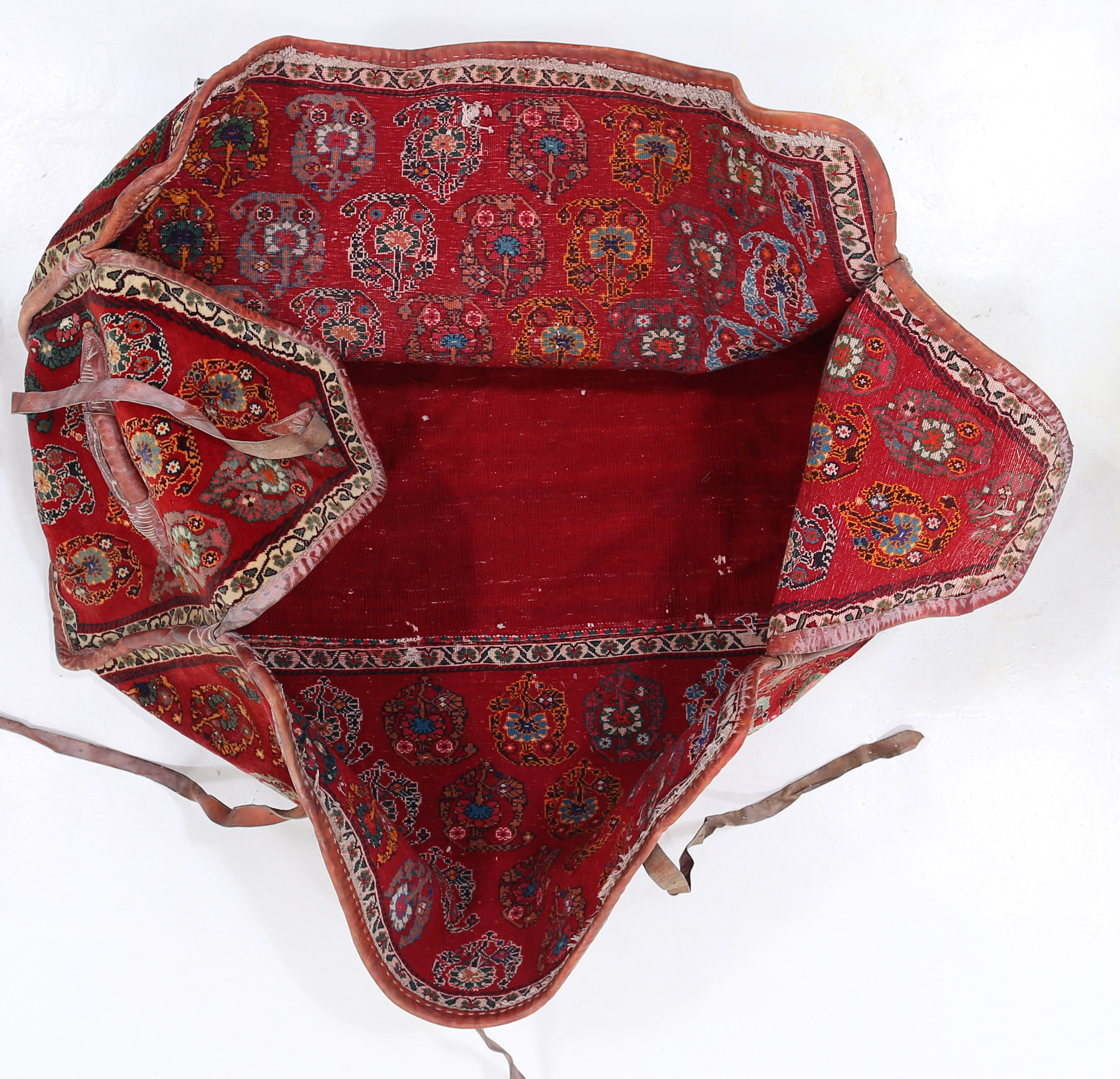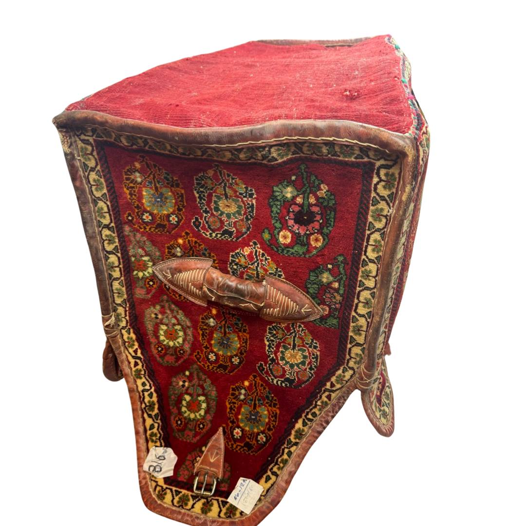 cargo bag or Mafrash - bedding bags, the front, back and side panels Hand knotted rug, mother and baby paisley repeating red and ivory , blue , within geometric motif secondary borders. Mafrash have been made in the largest numbers by Shahsevan tribal people and other groups in NW and across the border in Azerbaijan. Others were made in Georgia and Armenia. A majority are intricately woven soumak; others are slit-tapestry, sometimes with narrow contrasting soumak bands. Bags have been made by nomads for storage of bedding in their tents, and for use as cargo bags. They were normally made in pairs which could be balanced over the backs of camels on migration. In the marketplace, Mafrash were woven in three parts, and then assembled.