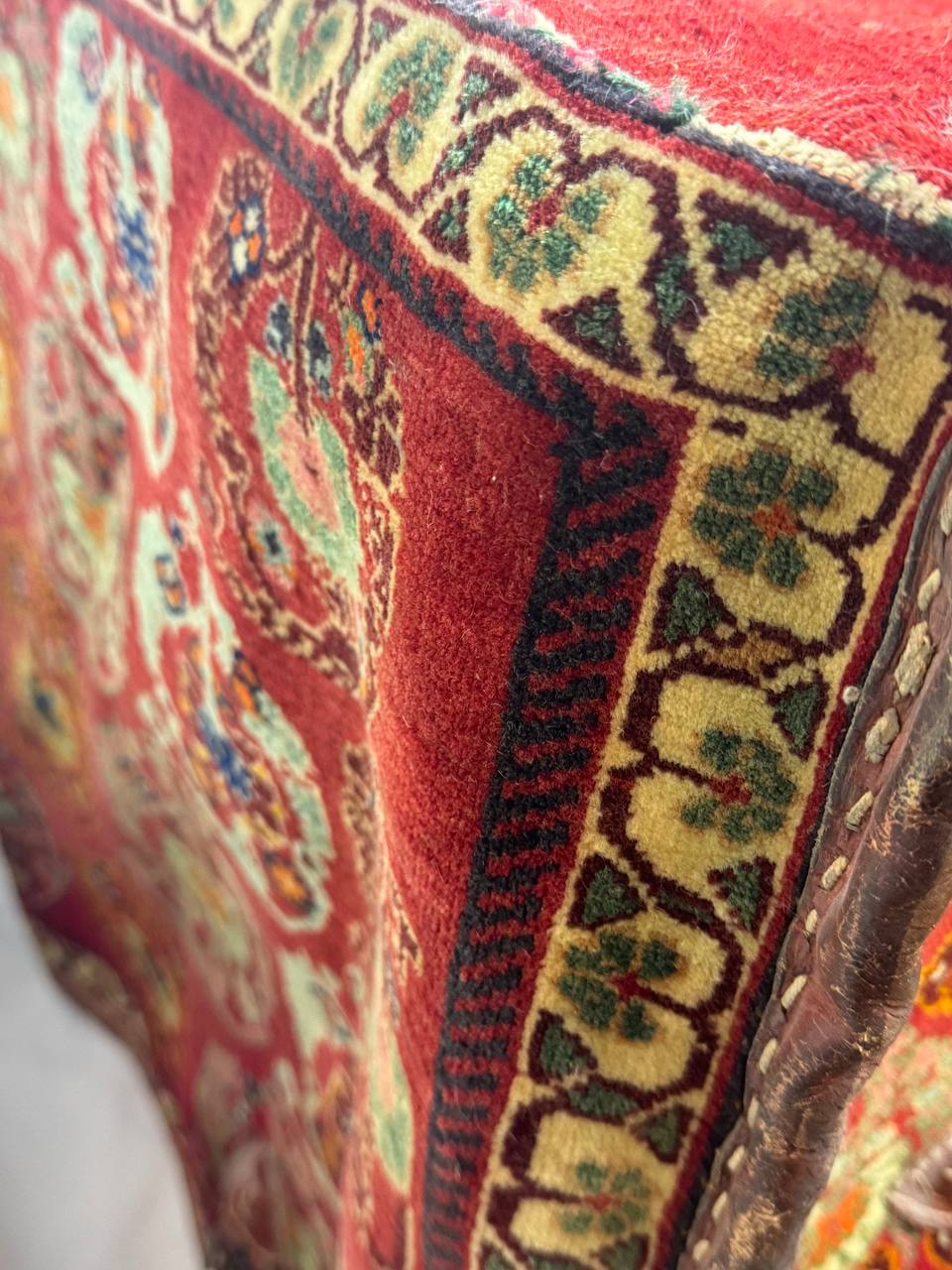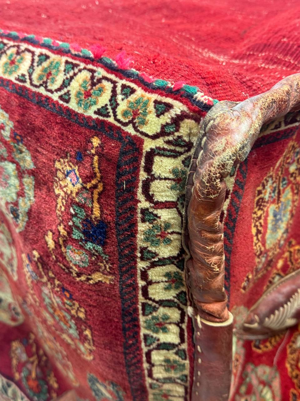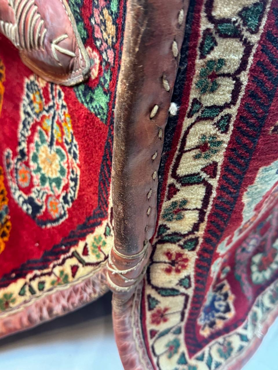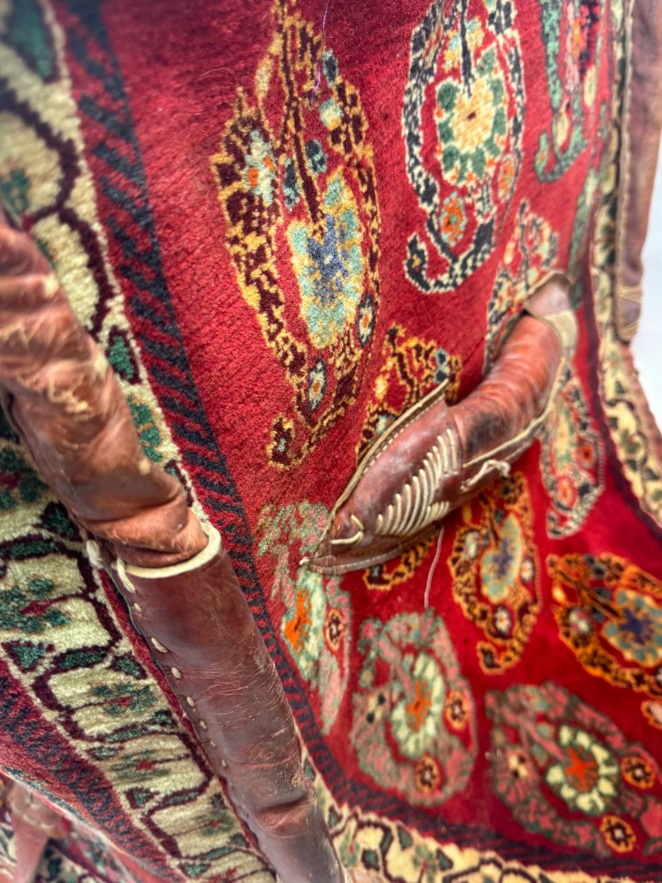 The materials are from vegetable dyes wool pile over cotton foundation with leather accierisse . The pattern is geometric style.