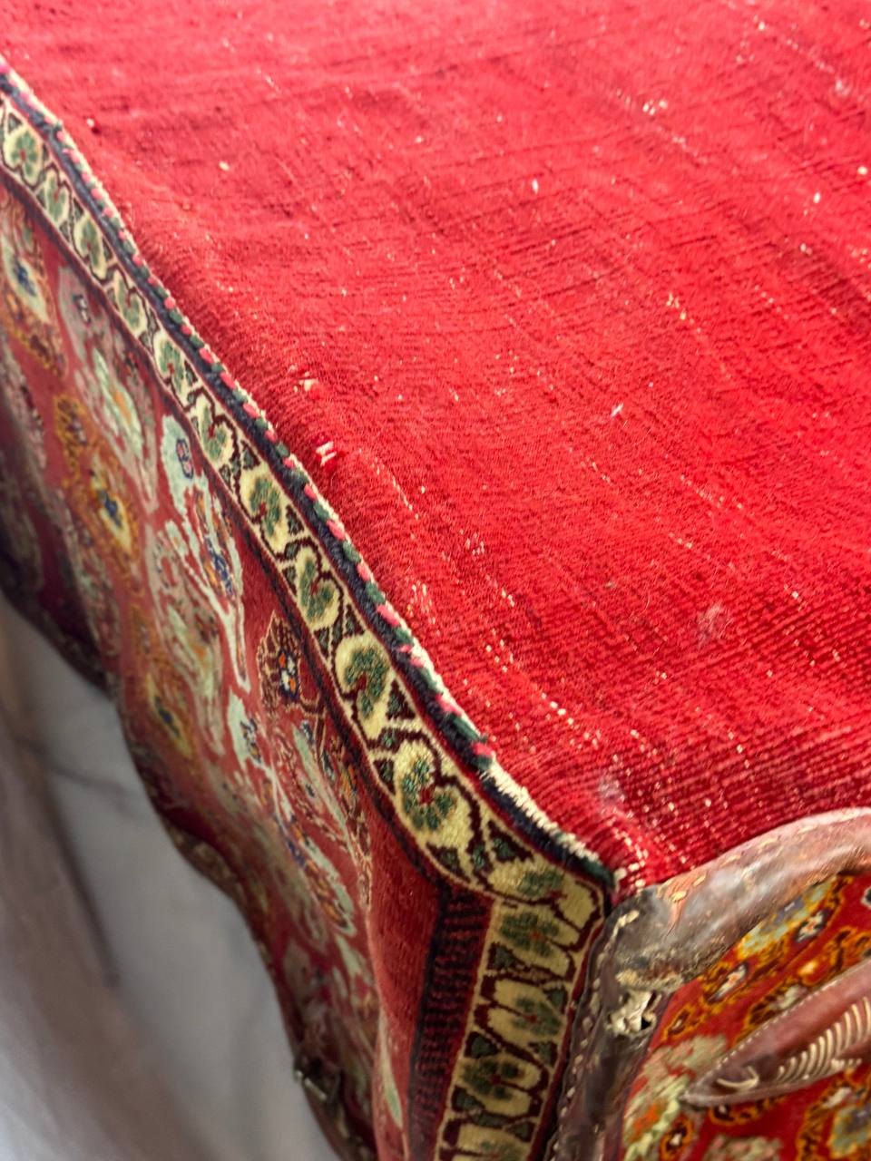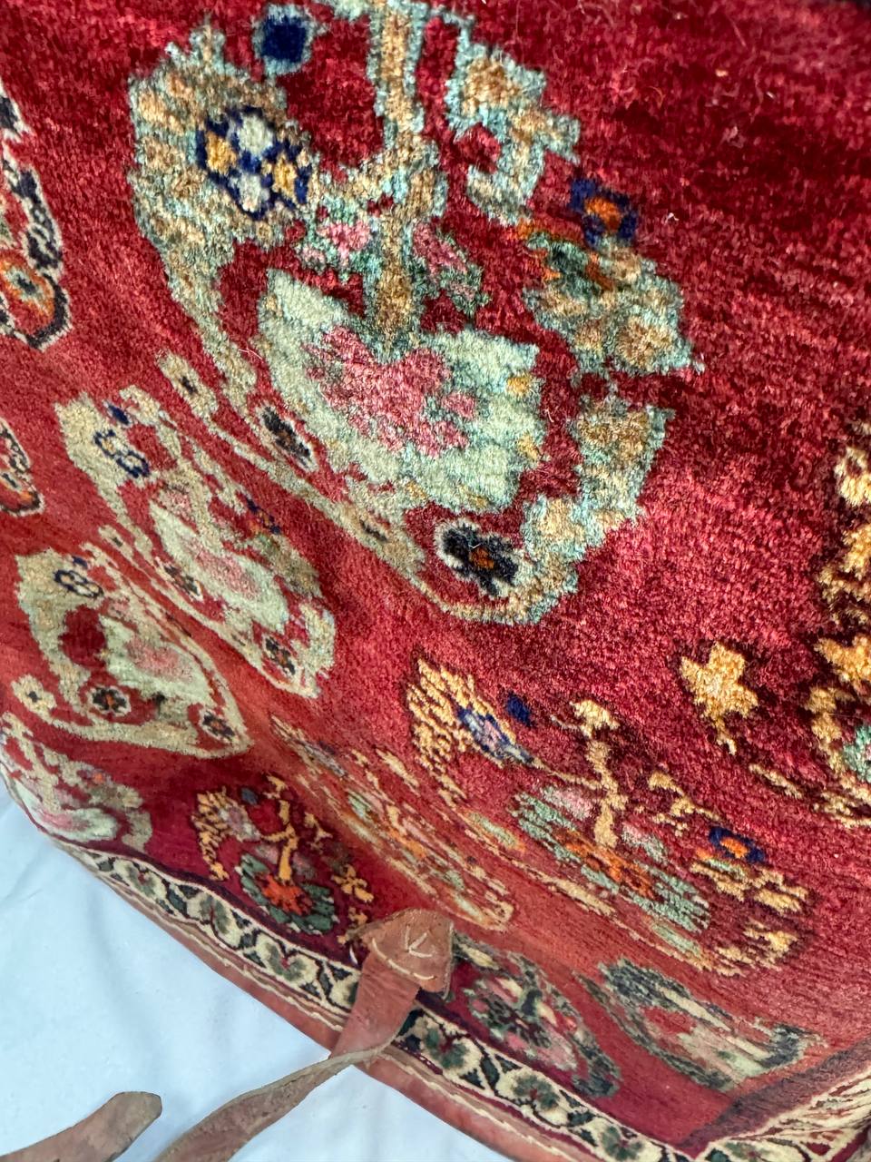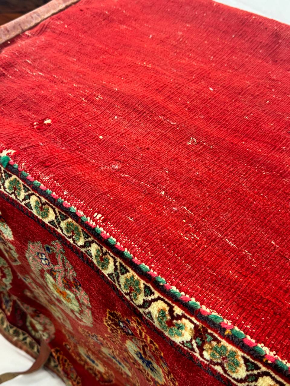 This antique farahan Rug / Mafrash is in excellent condition, cleaned and no stained, the ends and bindings of the rug are intact as original and there has not been any repairs. There are no tears, breaks or holes.