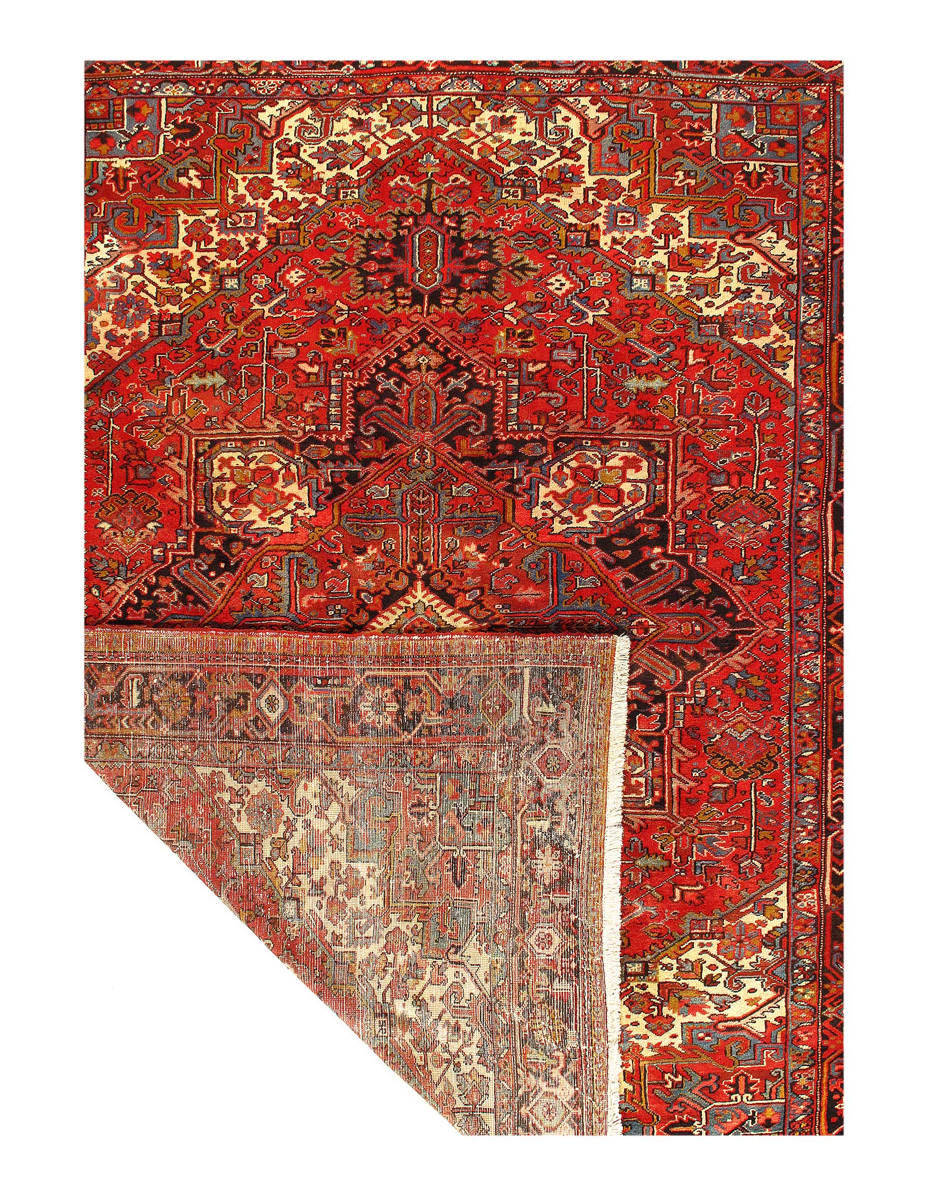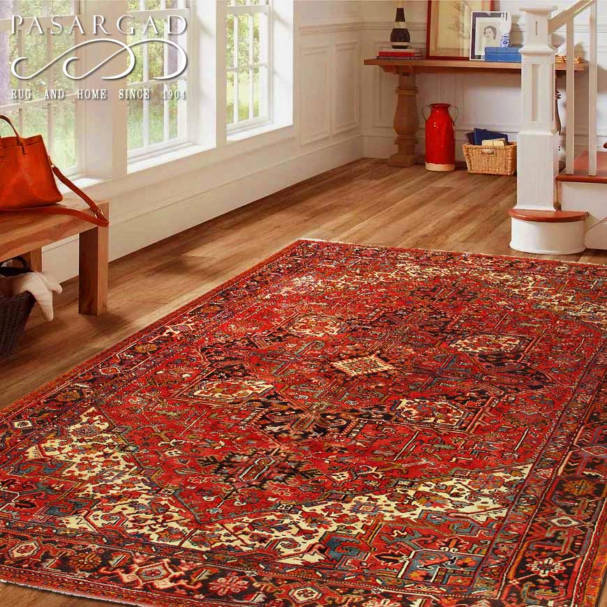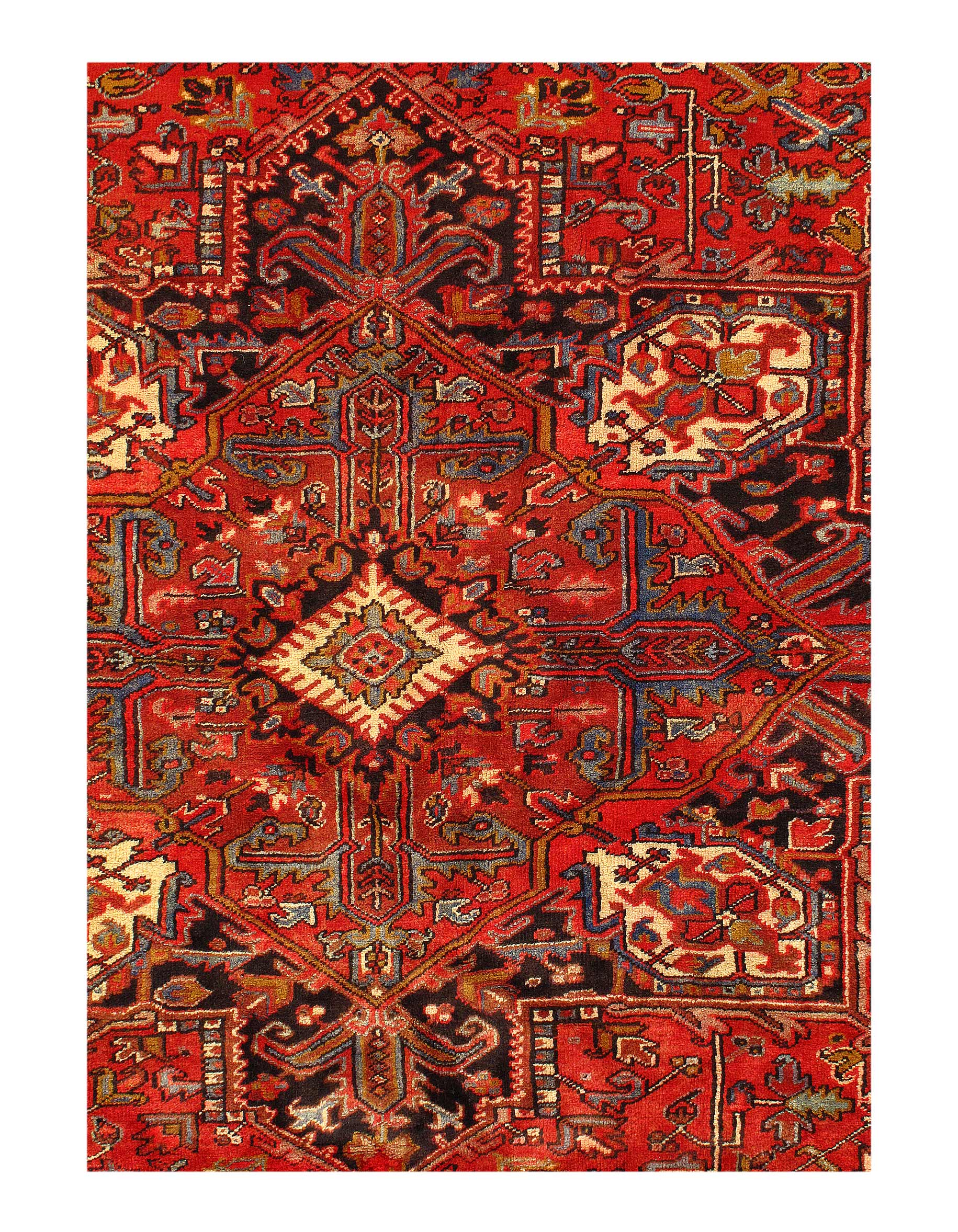 The brilliant Red field bears a central Ray of Life and many highly abstracted floral shapes in this fascinating antique Heriz rug. Four flower blossoms cluster at different points along the mid-lines, separated by riyu symbols in the shape of arrows. The patterns carry blue, pink and white colors. A broad navy border presents scrolled geometric shapes. Three separate, narrow guard borders frame the border, each carrying a geometric pattern. Heriz is a community in Northwestern Iran famed for producing extremely long lasting carpet and rugs, items that often pass down from one generation to another during many years. These antique rugs possess a coarse, durable consistency. The type of rugs made in Heriz are also sometimes produced in other places, including Bakhshaish and Gorevan. The highest grade of rug from the Heriz area is the Serapi, which was made around the turn of the Twentieth Century. Most Heriz rug contain prominent knots but the Serapi are describes as smoother.