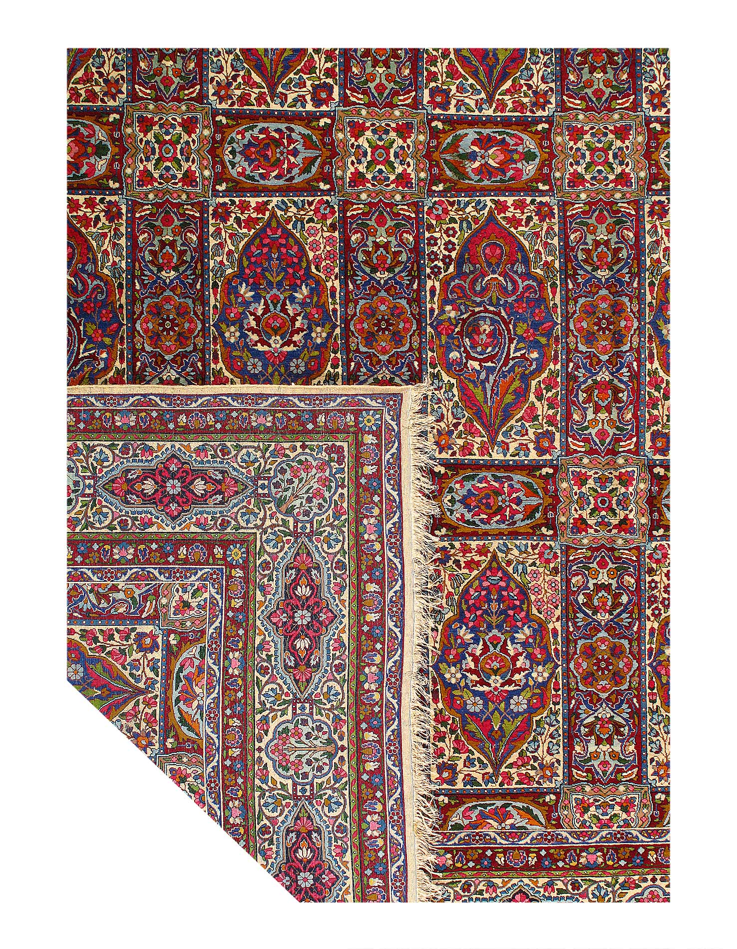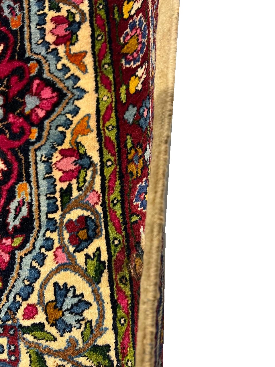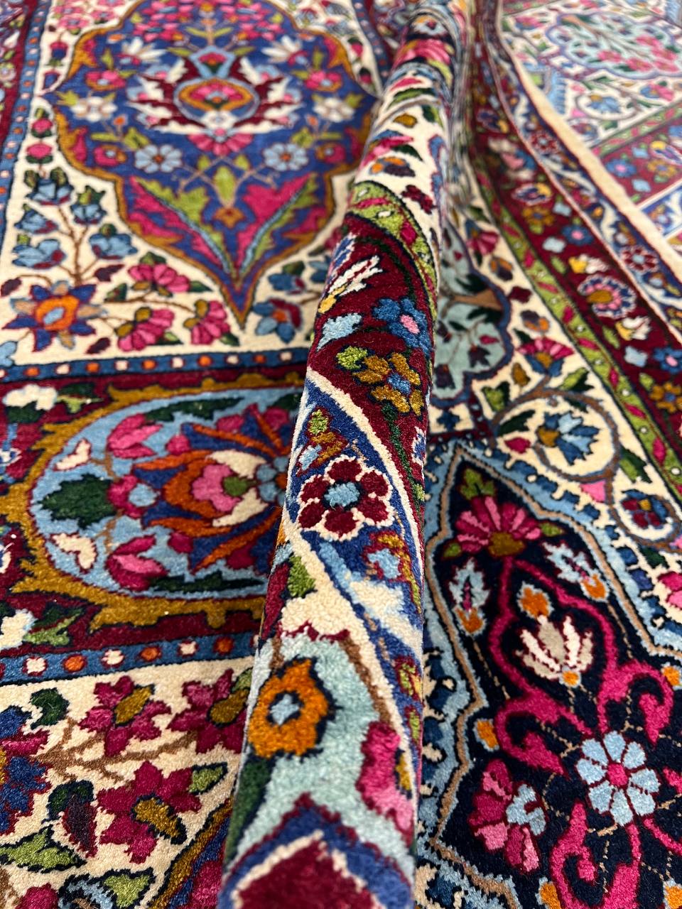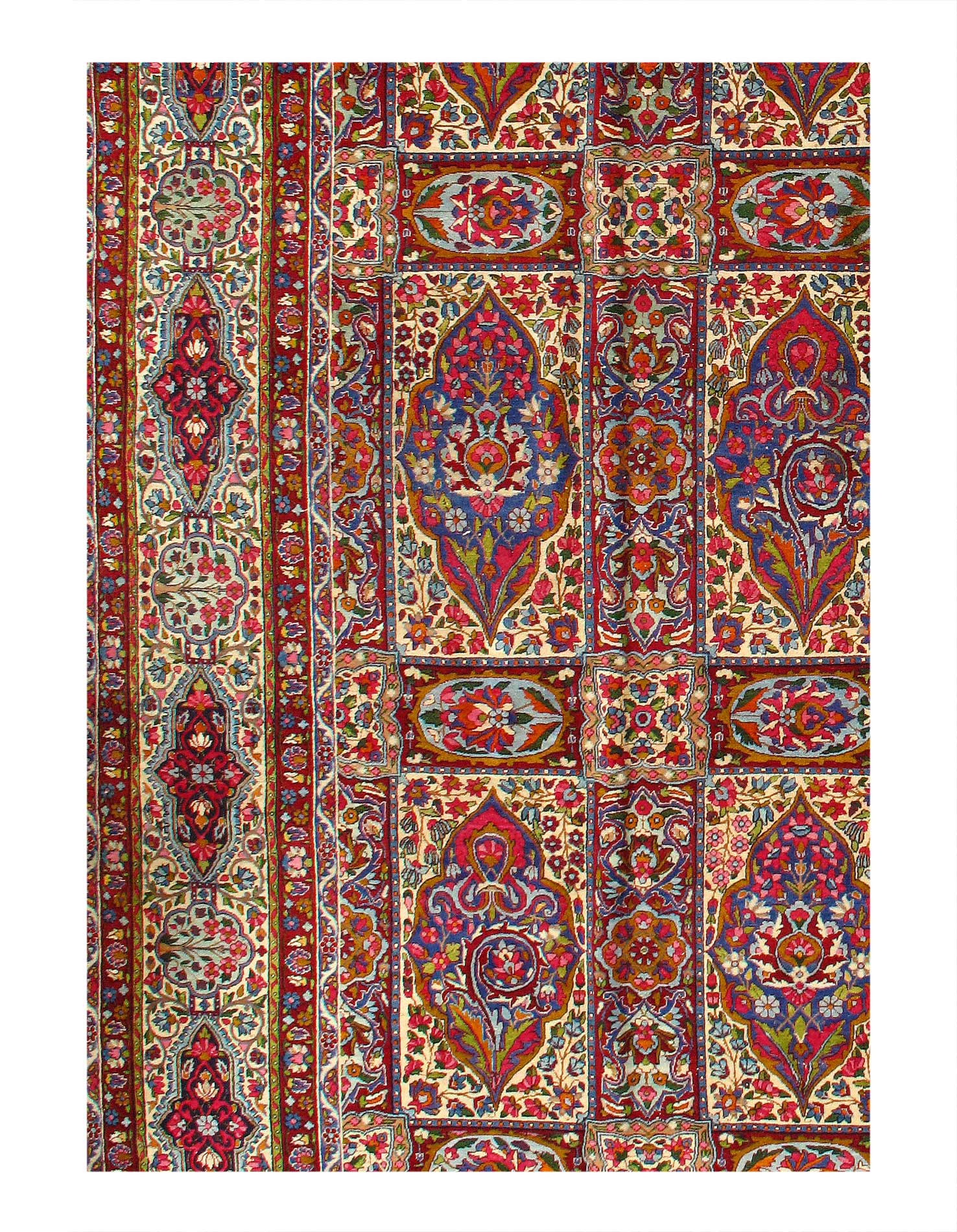 The stunning detail of this vintage Persian rug is carried out in Ivory, reds, and shades of rust on an ivory background. The artist used color saturation to define the major floral shapes and areas of the Persian rug.