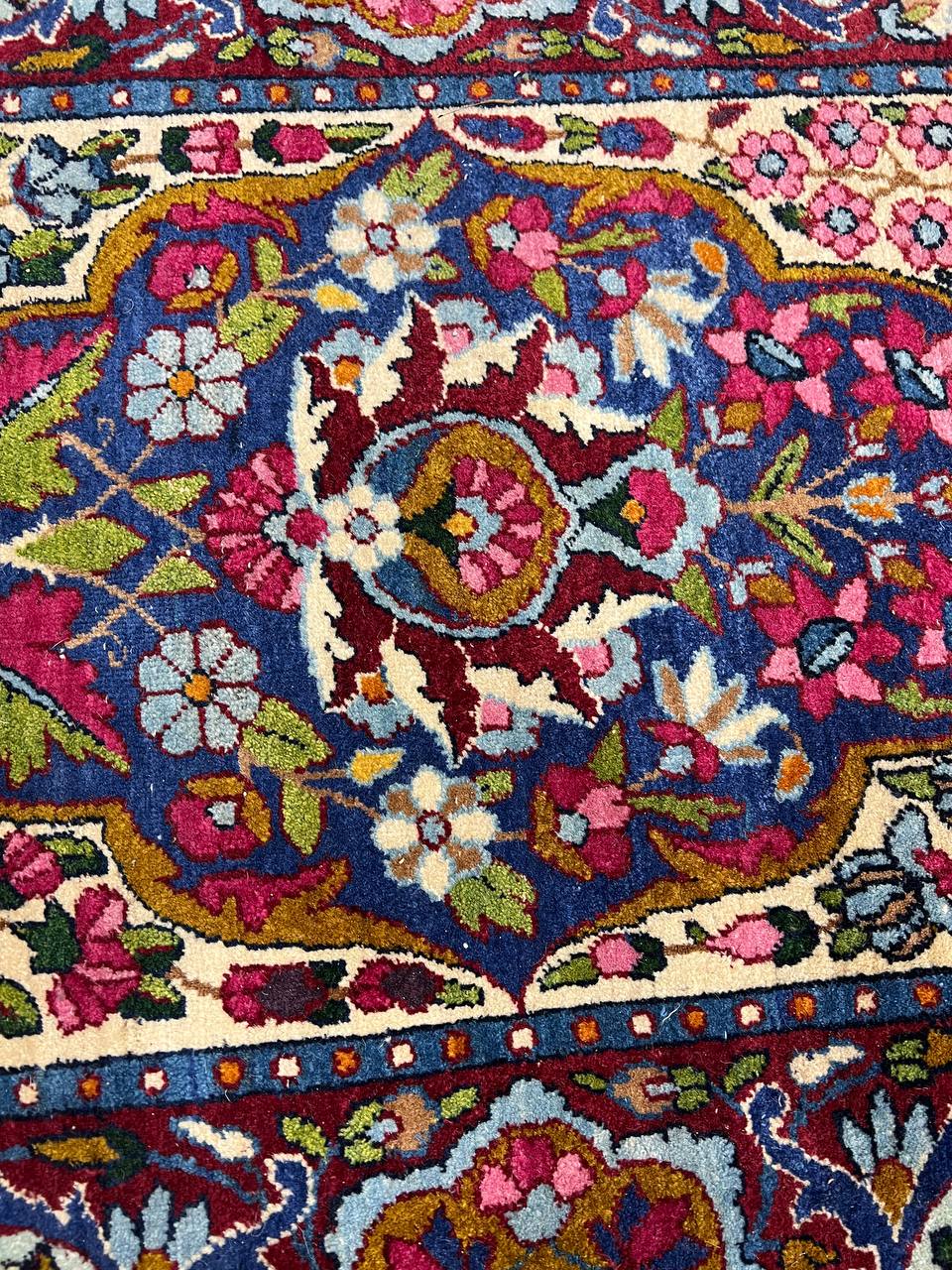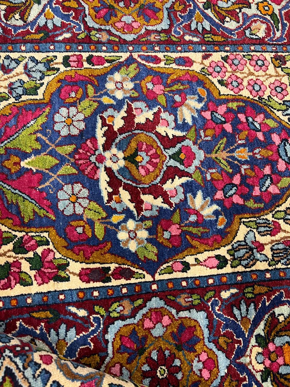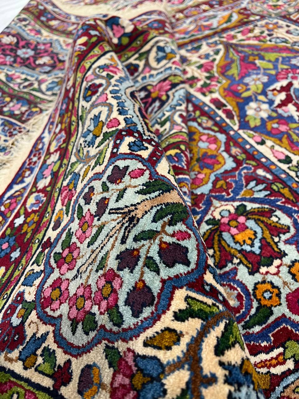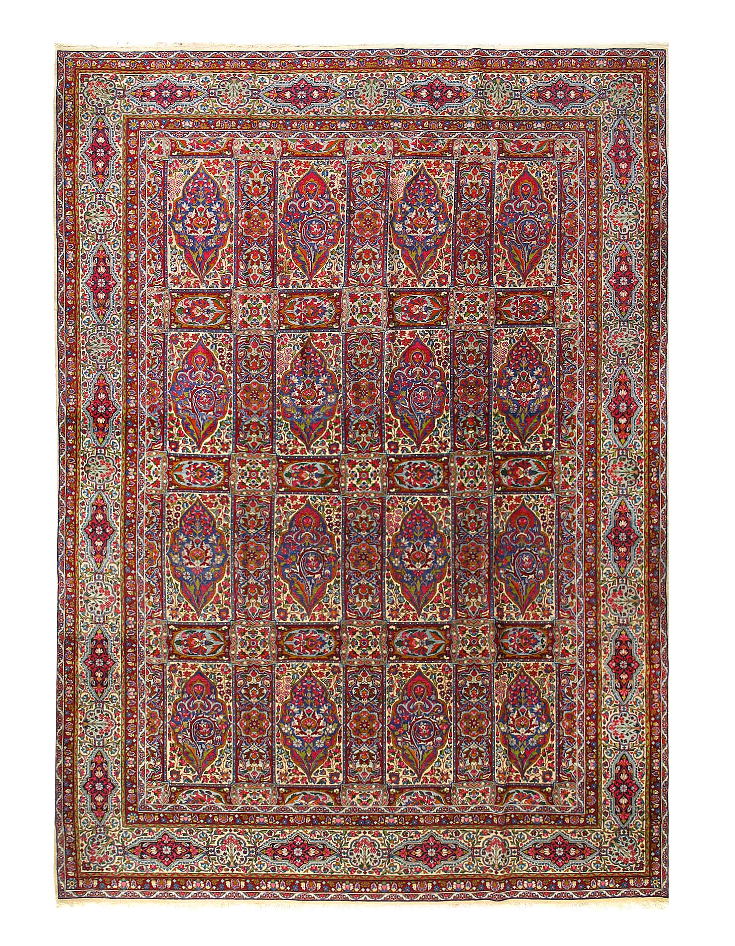 The stunning detail of this vintage Persian rug is carried out in Ivory, reds, and shades of rust on an ivory background. The artist used color saturation to define the major floral shapes and areas of the Persian rug.