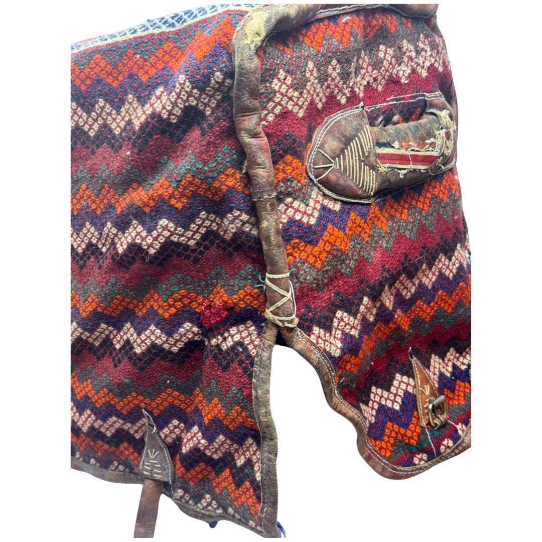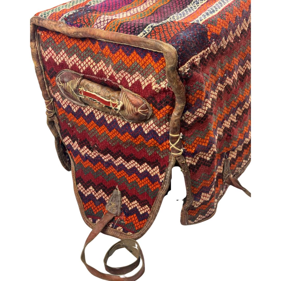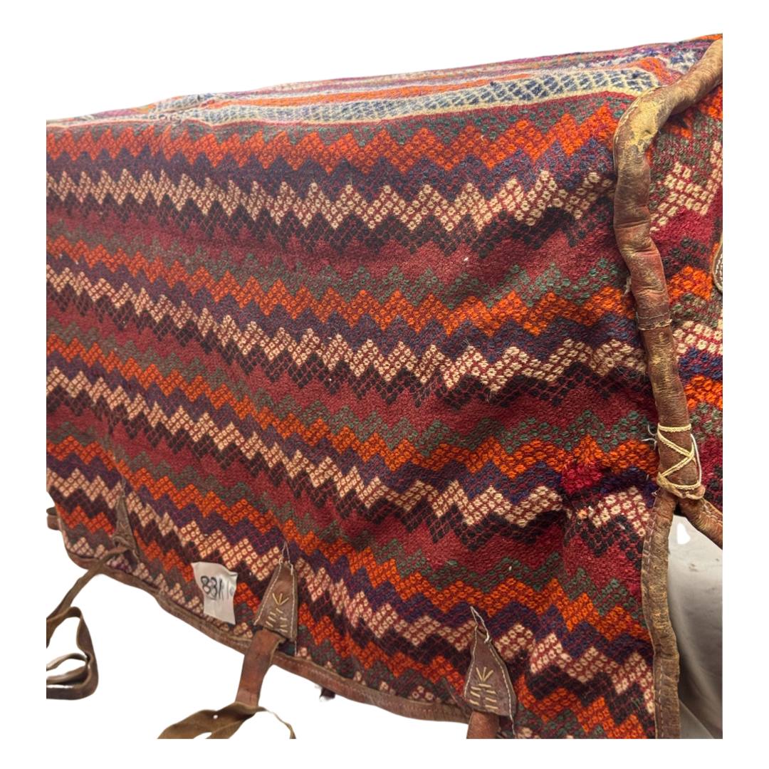 cargo bag or Mafrash - bedding bags, the front, back and side panels Hand knotted rug, mother and baby paisley repeating red and ivory , brown , within geometric motif secondary borders. Mafrash have been made in the largest numbers by Shahsevan tribal people and other groups in NW and across the border in Azerbaijan. Others were made in Georgia and Armenia. A majority are intricately woven soumak; others are slit-tapestry, sometimes with narrow contrasting soumak bands. Bags have been made by nomads for storage of bedding in their tents, and for use as cargo bags. They were normally made in pairs which could be balanced over the backs of camels on migration. In the marketplace, Mafrash were woven in three parts, and then assembled.