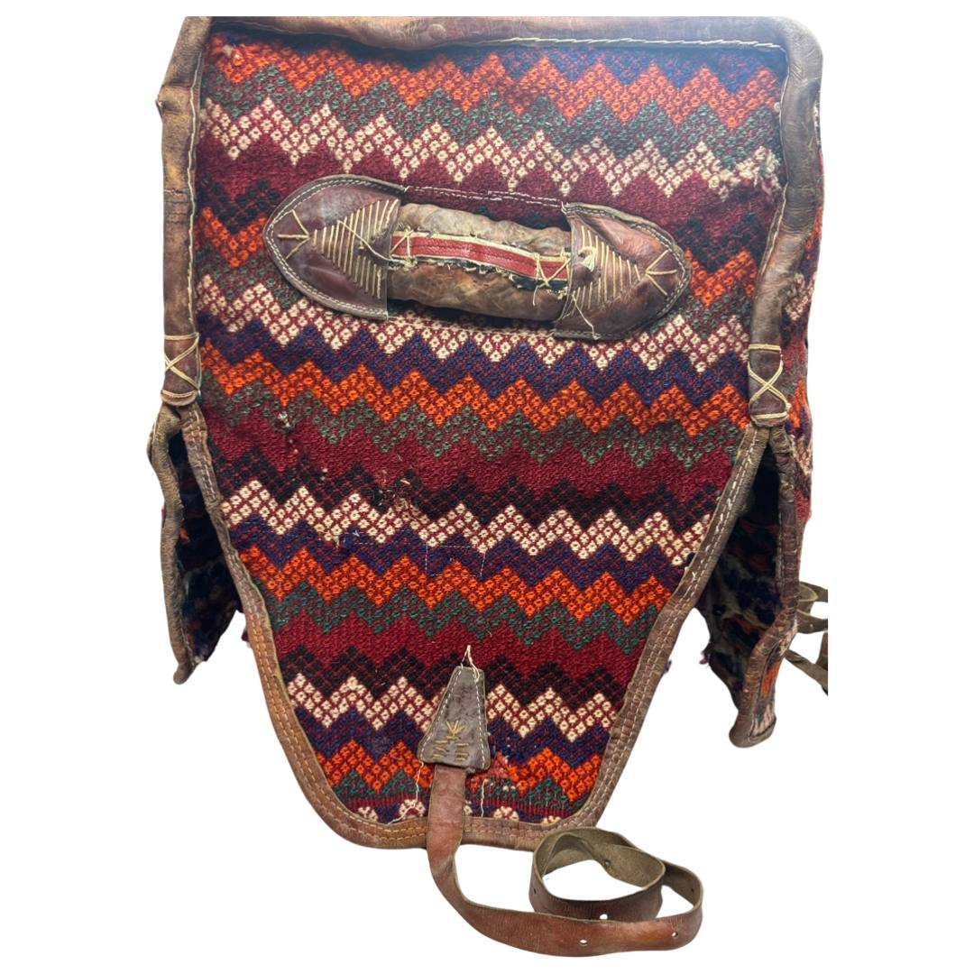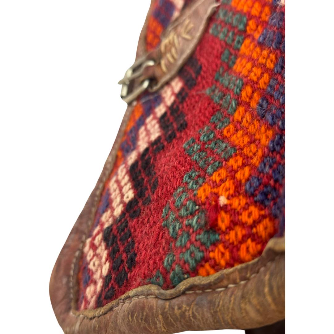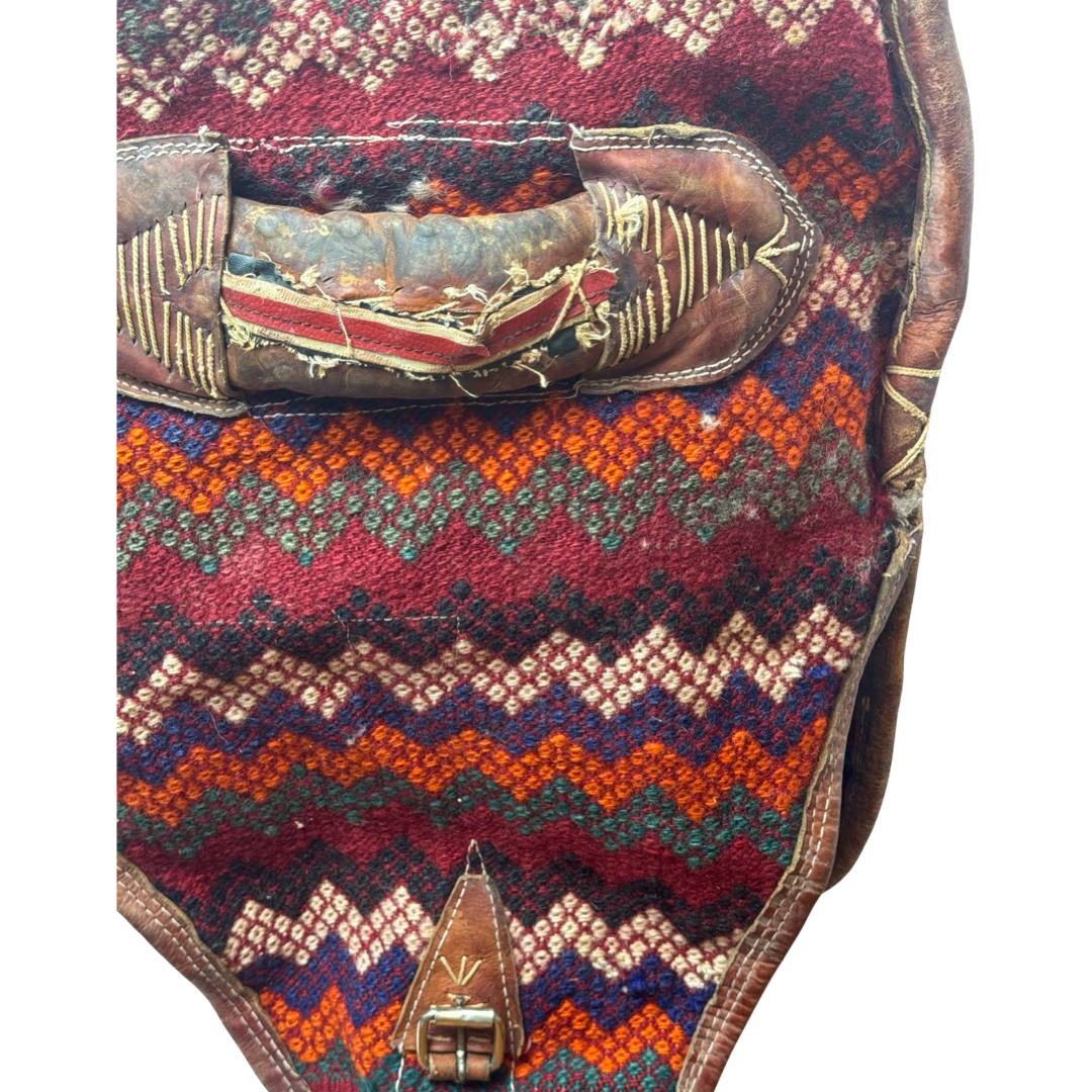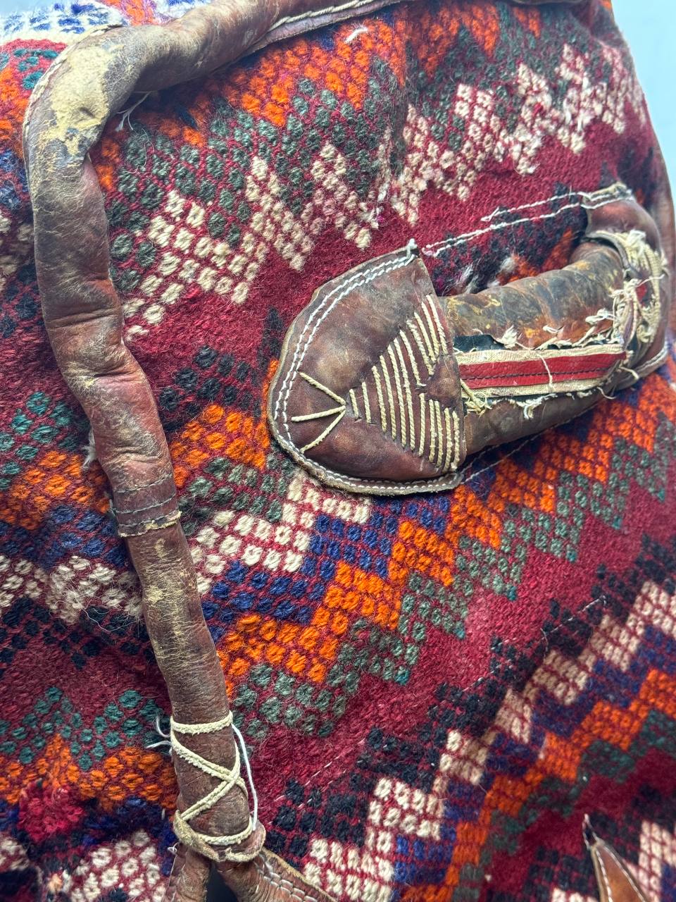 The materials are from vegetable dyes wool pile over cotton foundation with leather accierisse . The pattern is geometric style.